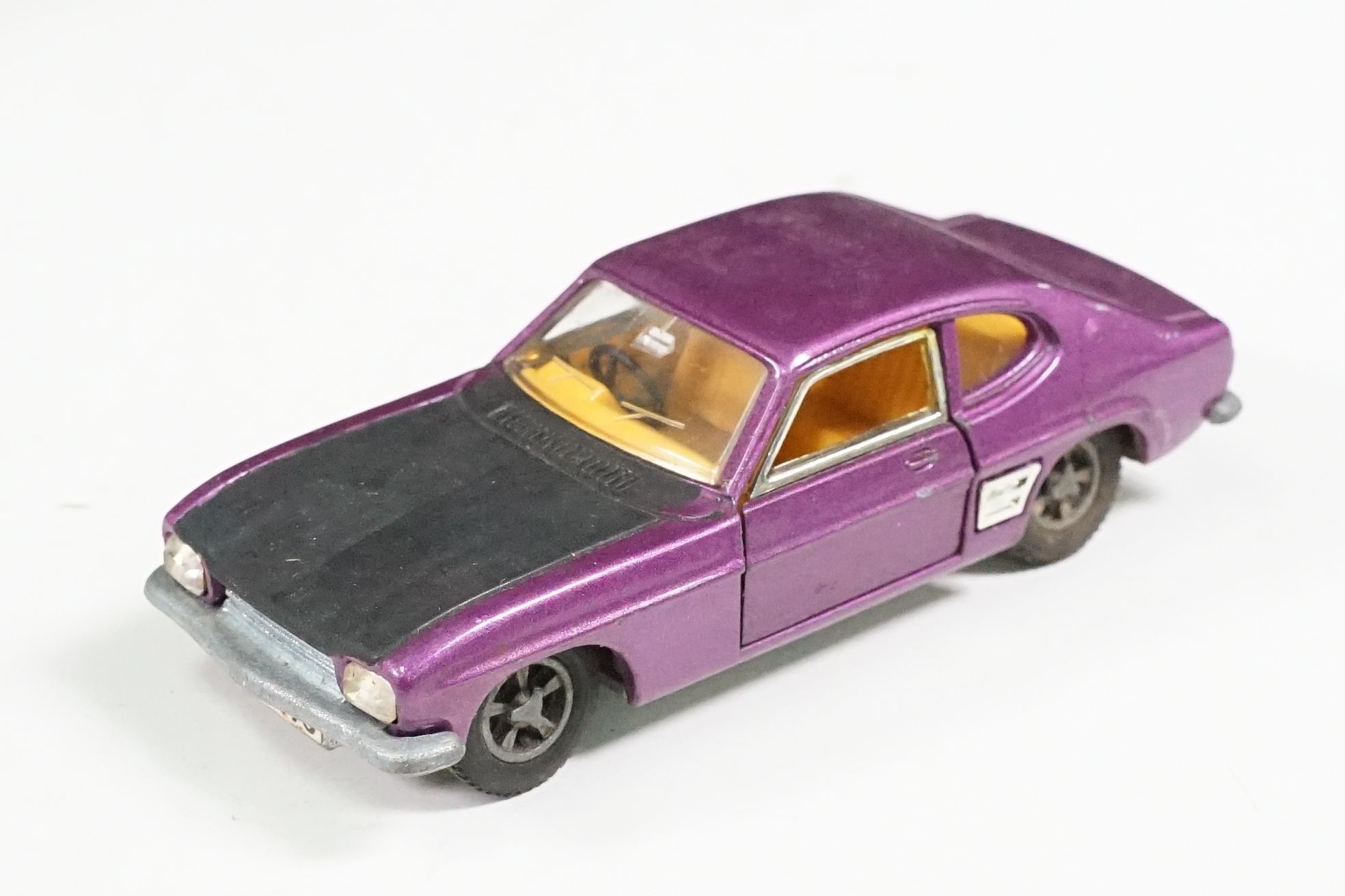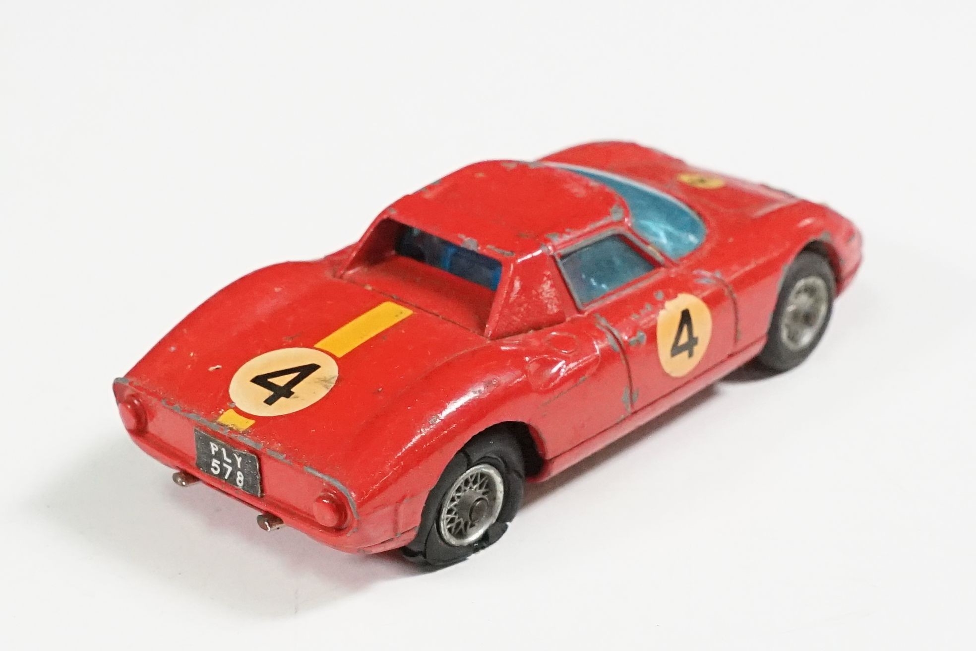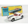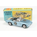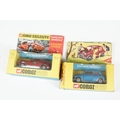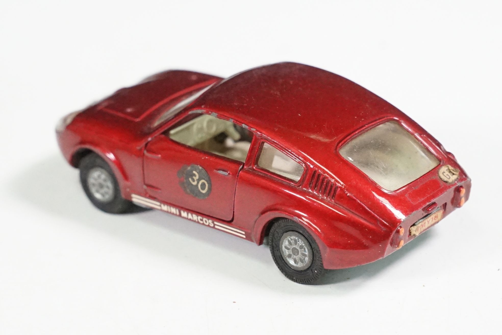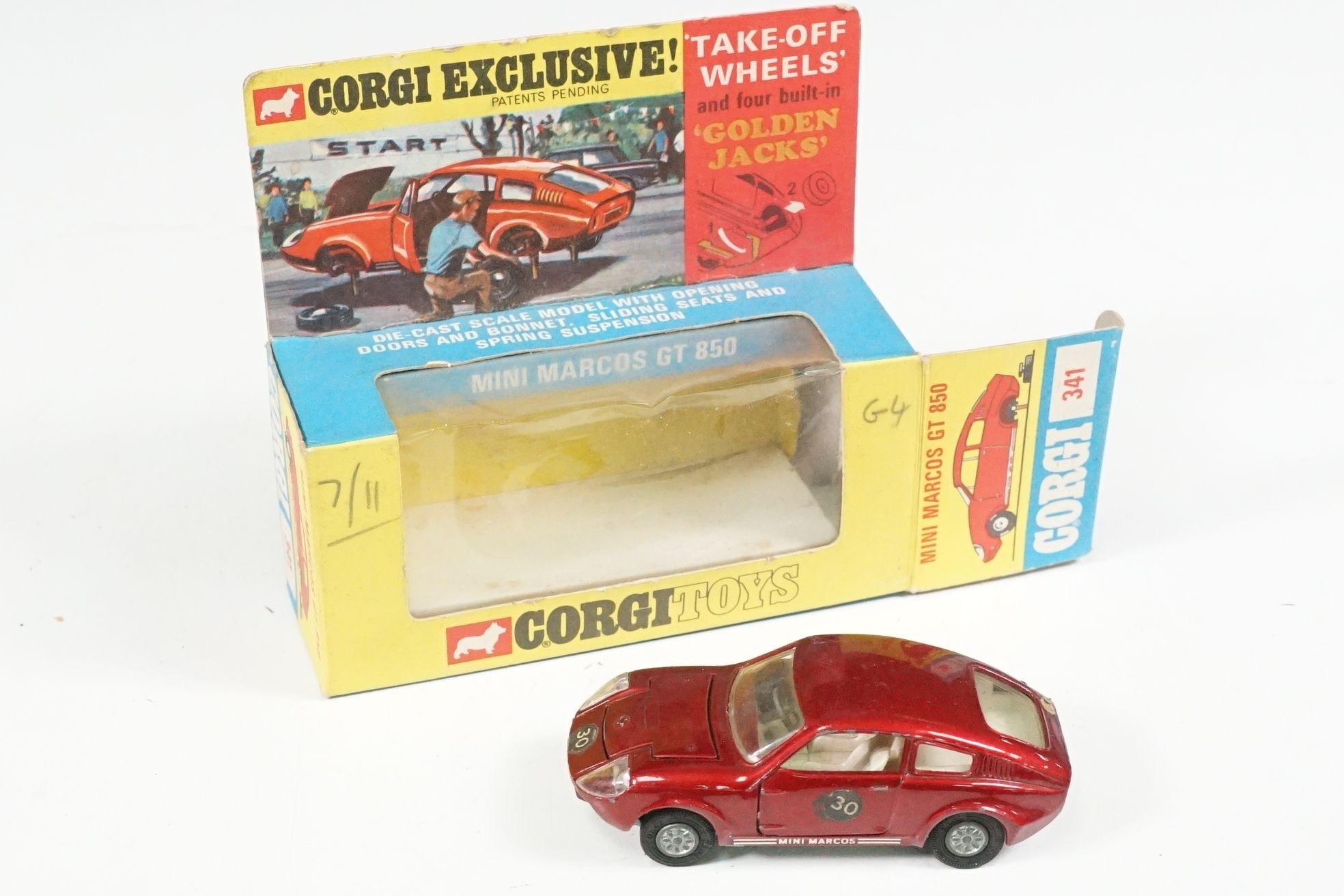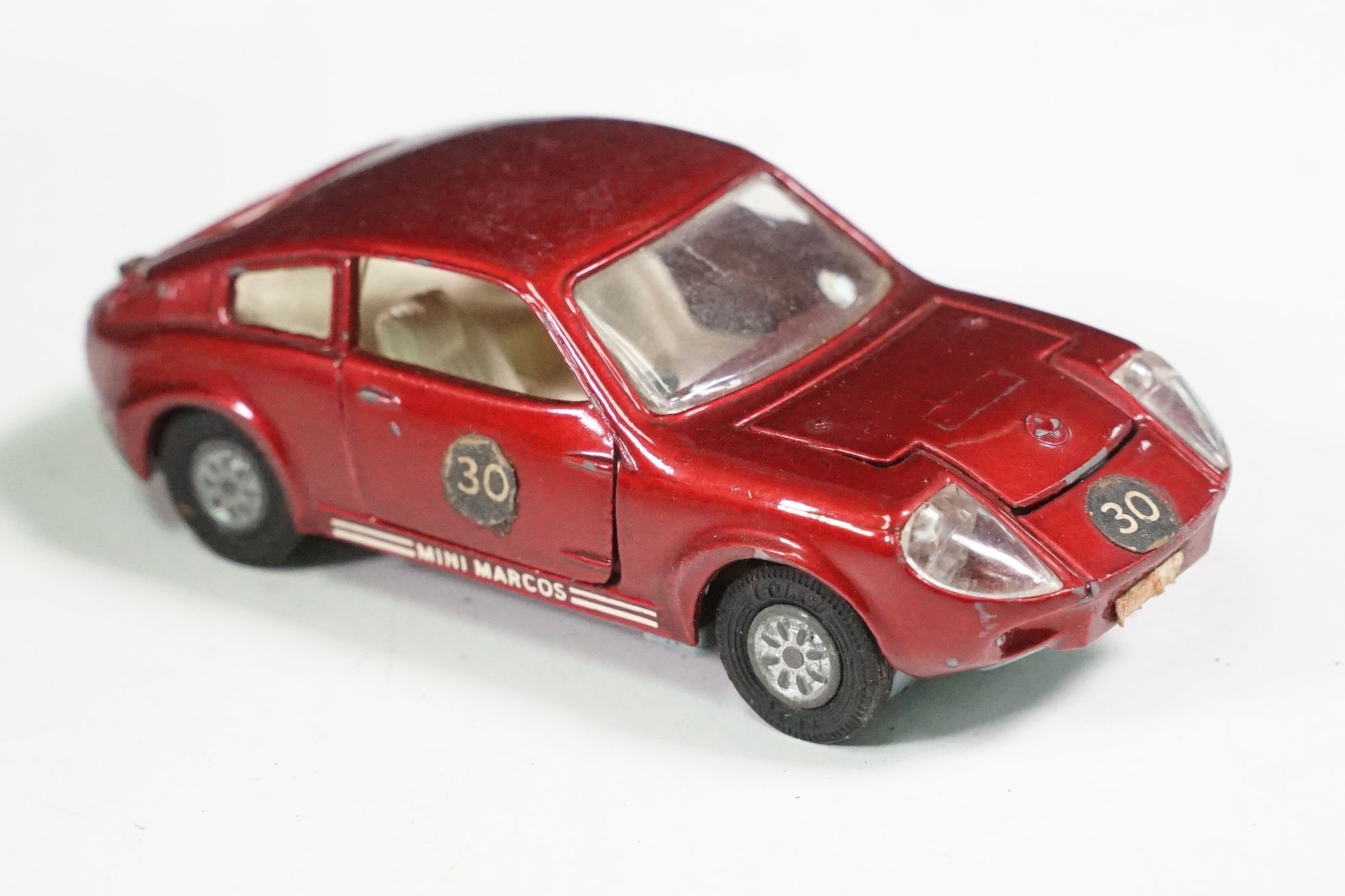 Nine boxed mid 20th C diecast models to include 6 x Corgi featuring 334 Mini Cooper Magnifique, 341 Mini Marcos GT 850, 319 Lotus Elan S2, 314 Ferrari Berlinetta, 231 Triumph Herald Coupe and 324 Marcos 1800 GT with Volvo engine and 3 x Dinky to include 165 Ford Capri in purple, 218 Lotus Europa in main body yellow and 344 Land Rover in blue, showing play wear with some previous rivet removal, boxes fair overall