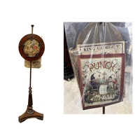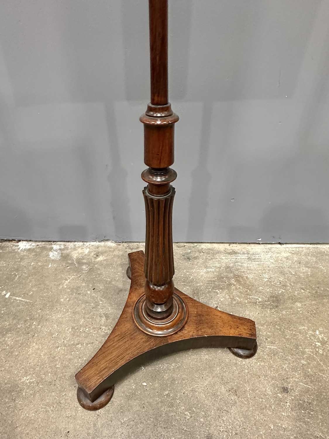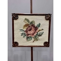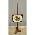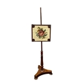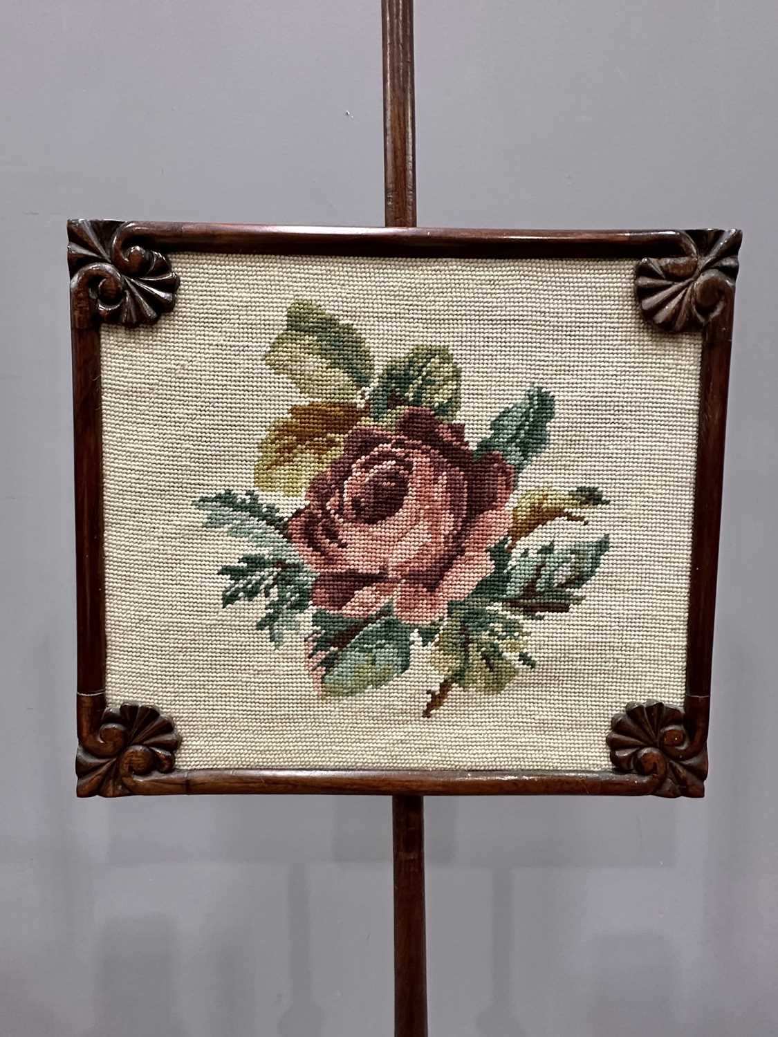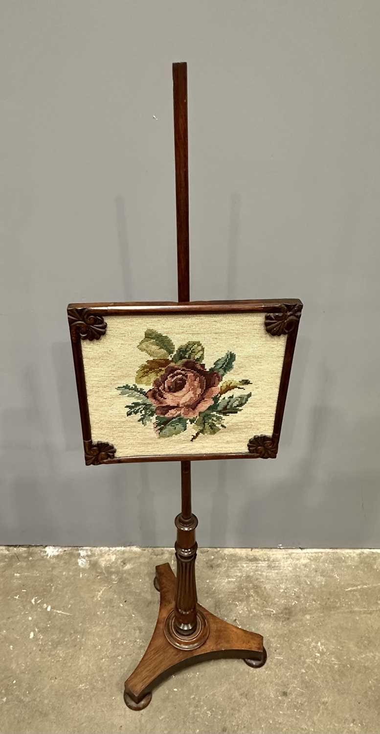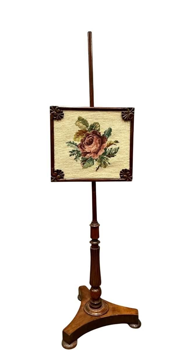 A Regency mahogany pole screen with tapestry panel, triform platform base to a reeded column up to an adjustable square needlework panel of a rose, height 134cm (1)