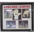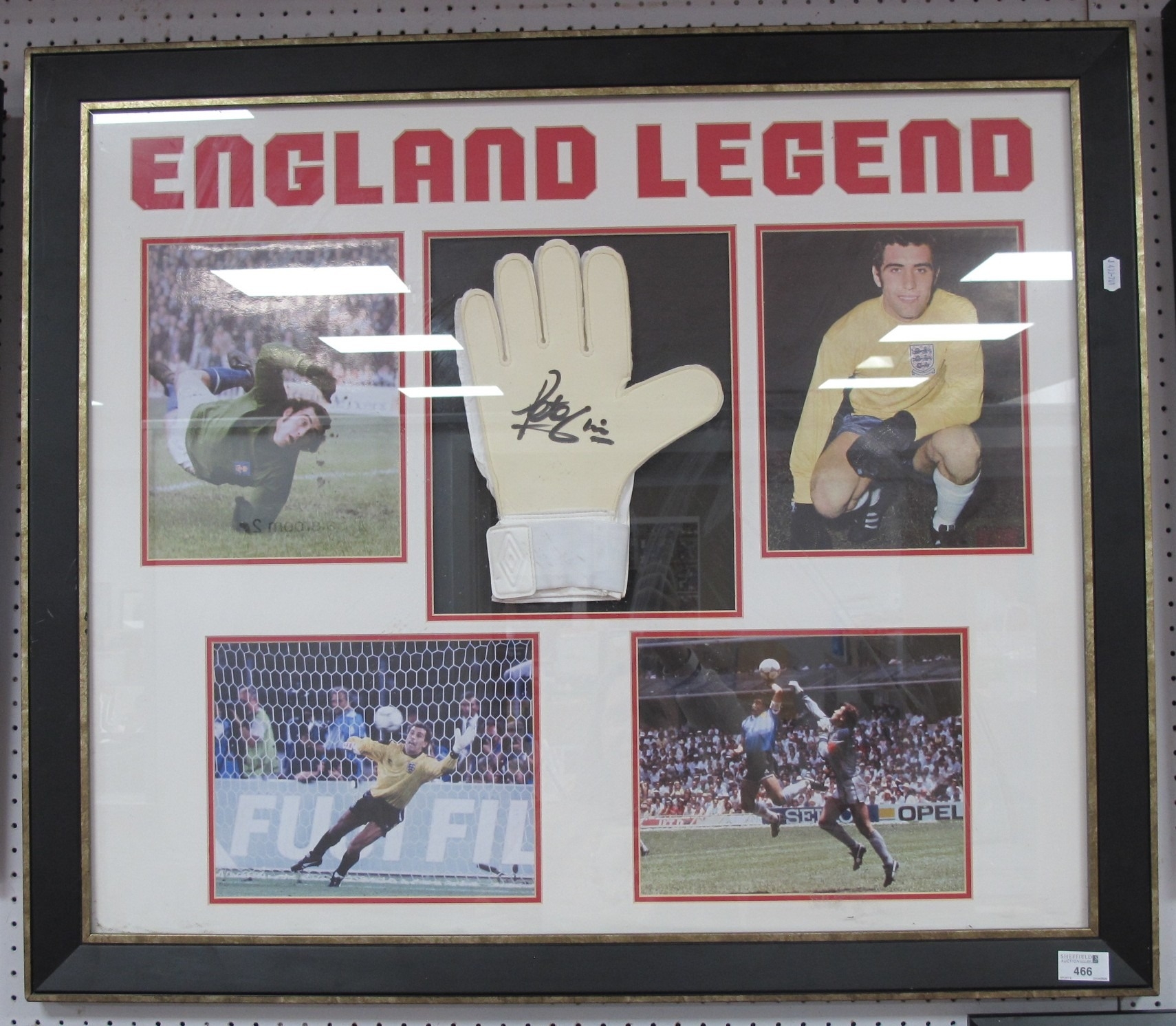 Peter Shilton Autograph, black pen signed (unverified) on a glove, as part of a framed montage of him, overall 74 x 86cm.