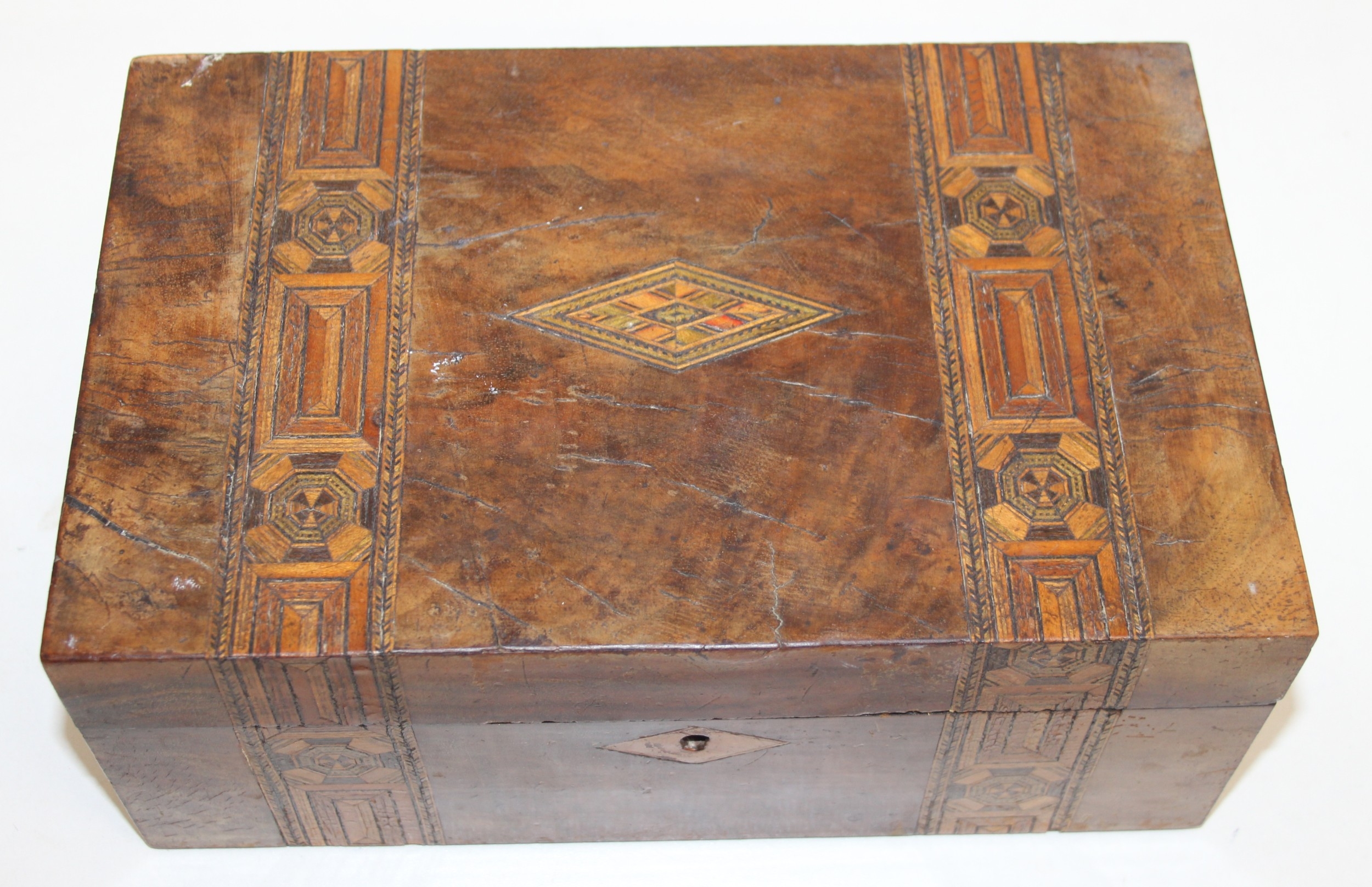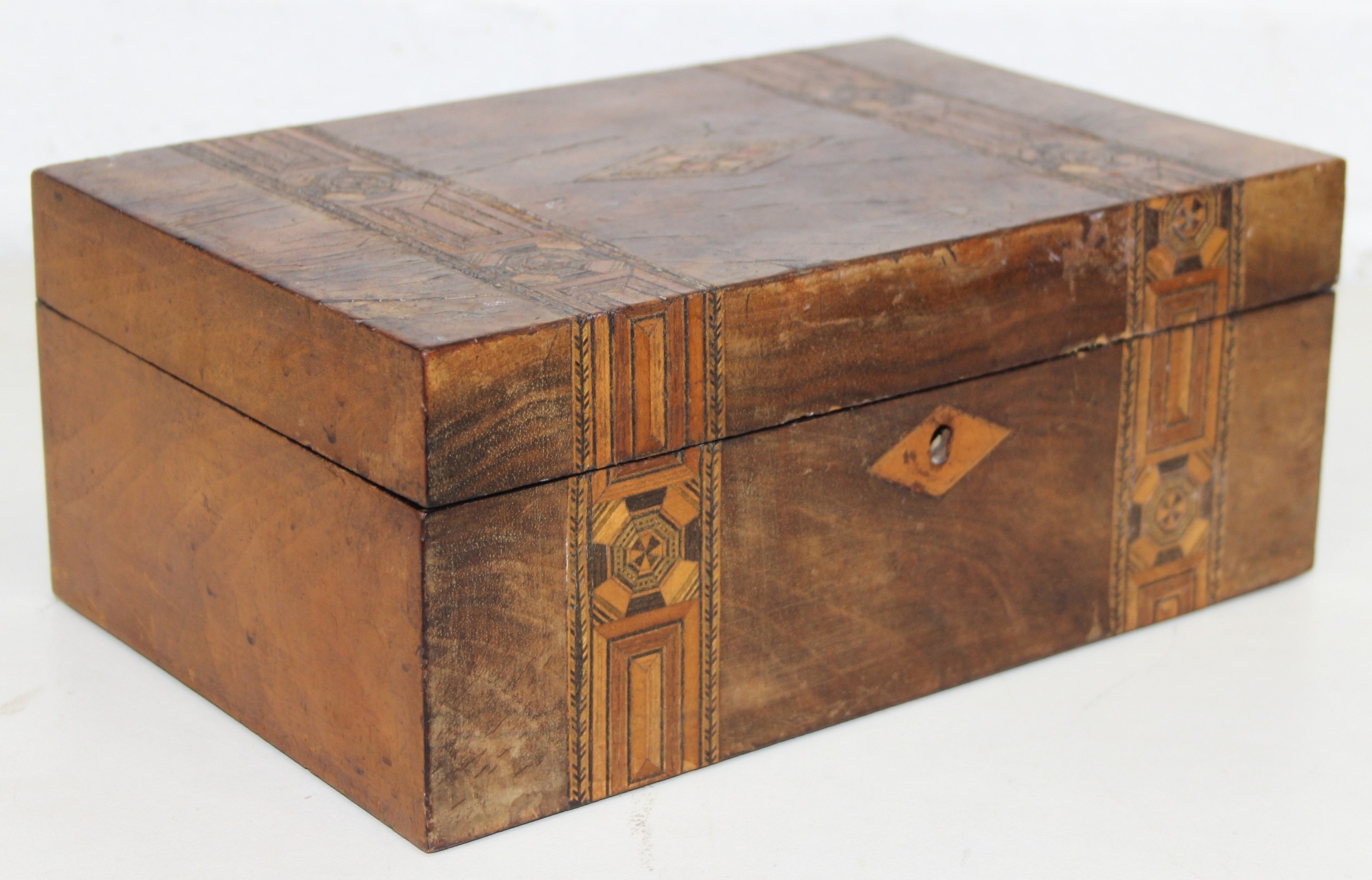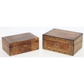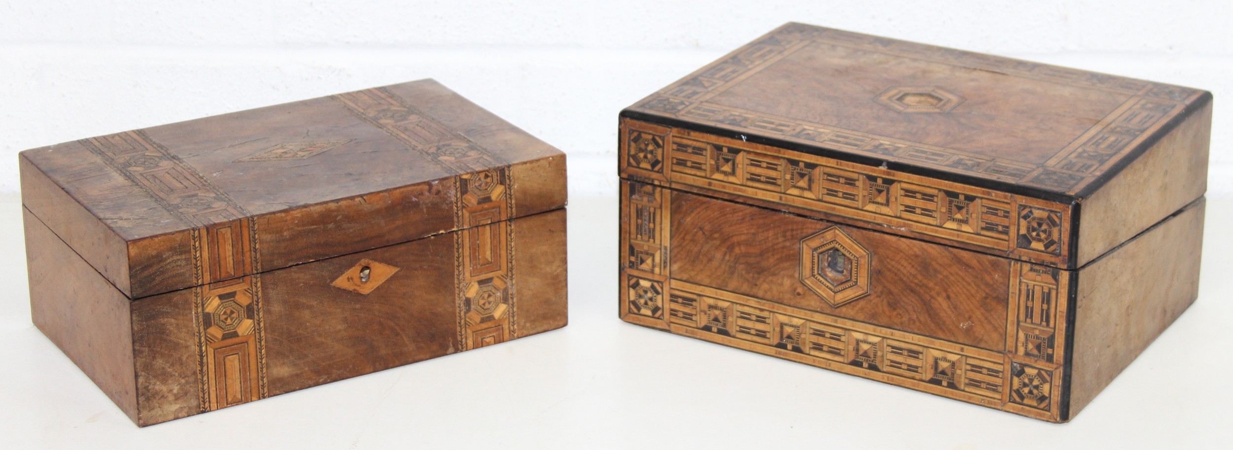 Two antique Tunbridgeware style wooden boxes with inlaid banding, largest 30cm x 22cm x 14cm [2]