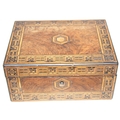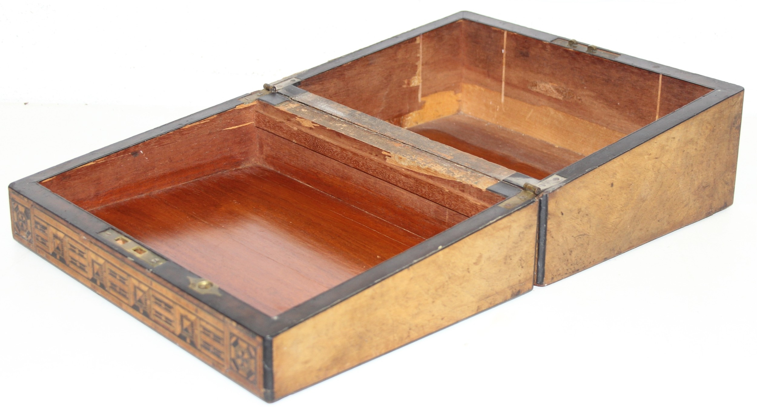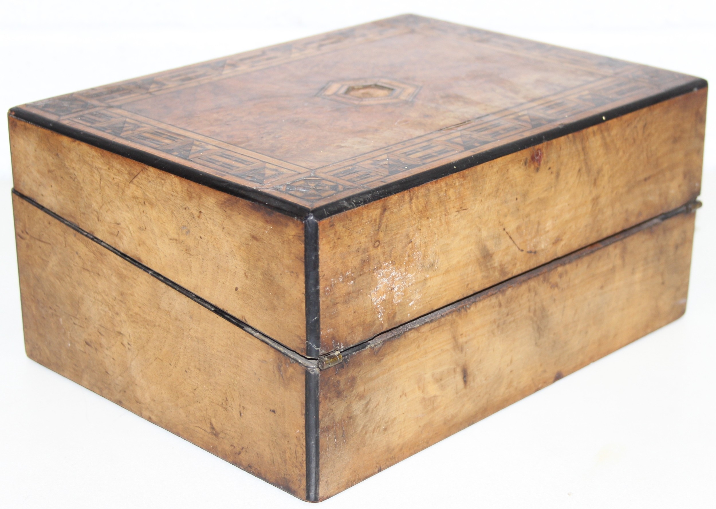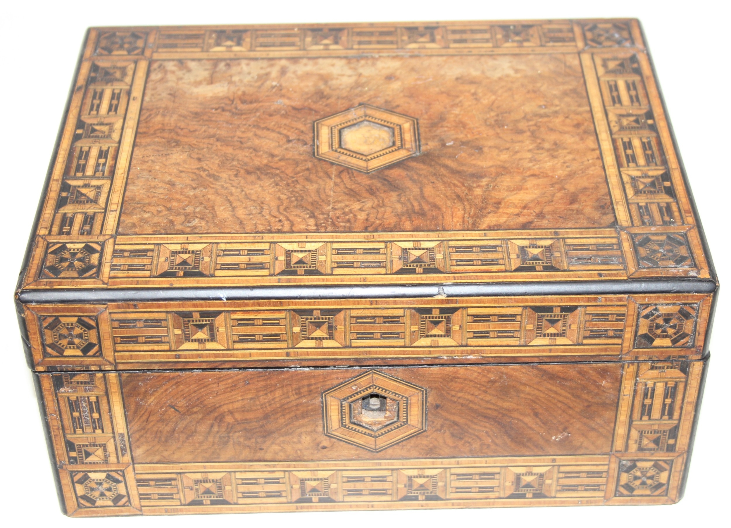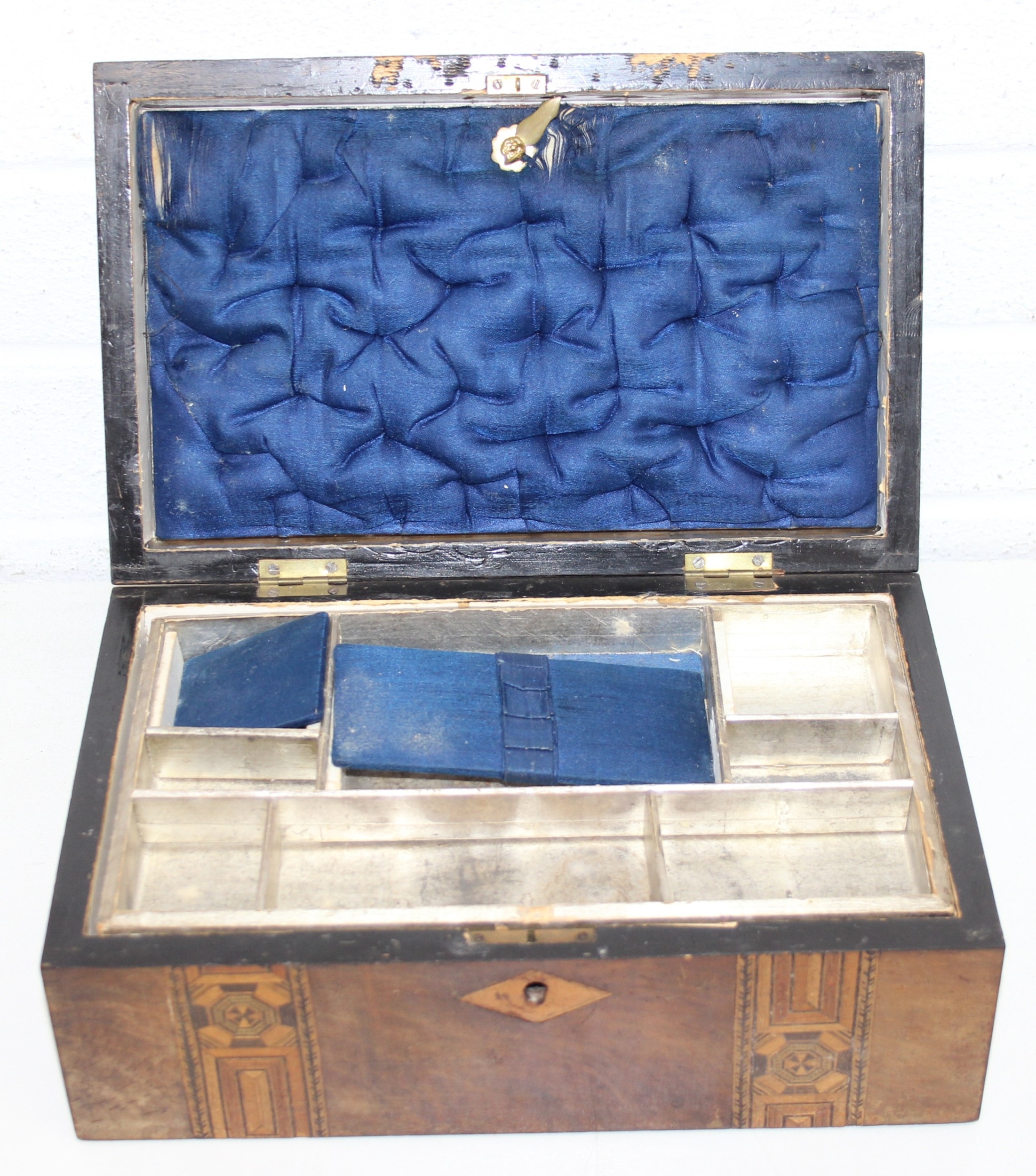 Two antique Tunbridgeware style wooden boxes with inlaid banding, largest 30cm x 22cm x 14cm [2]