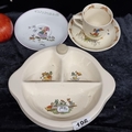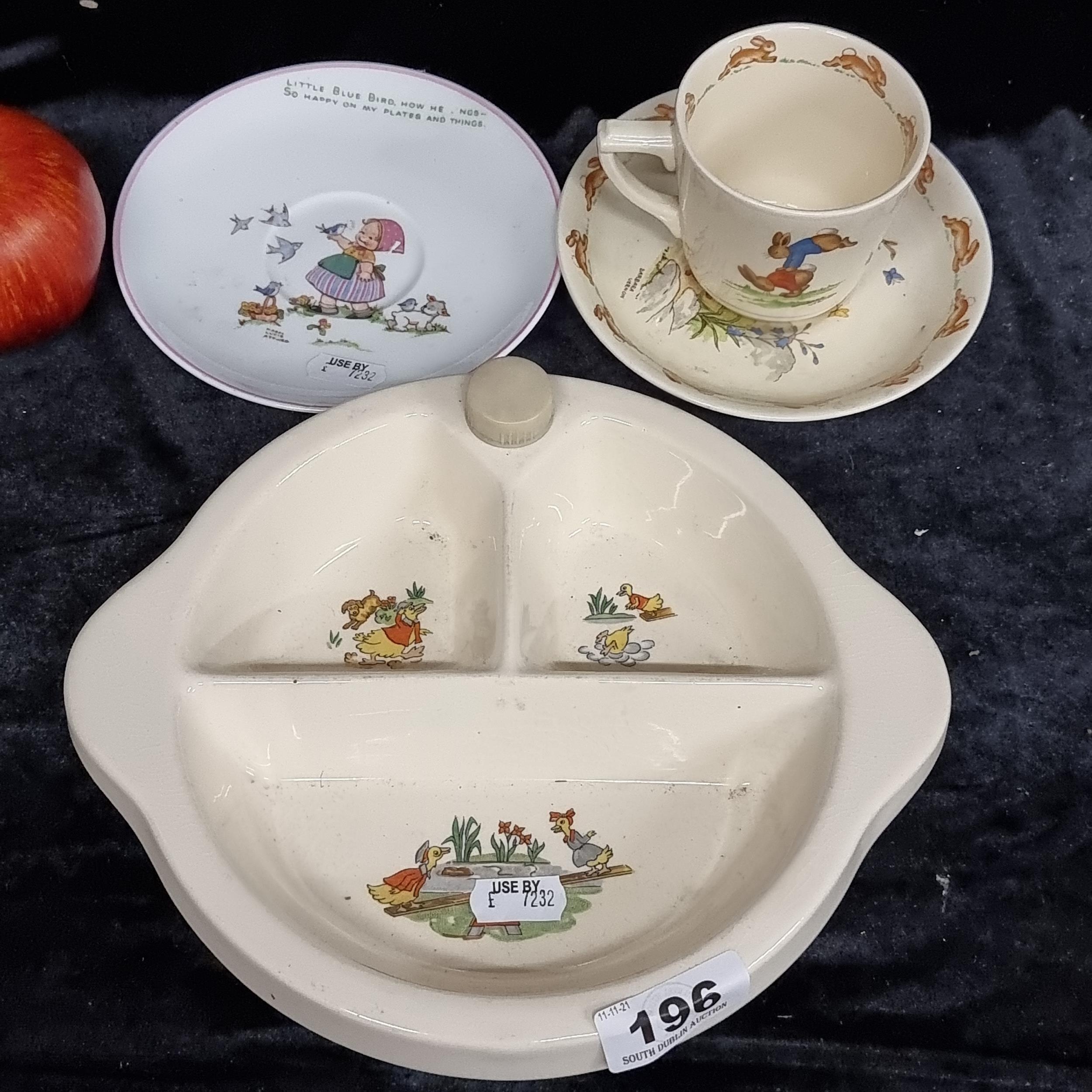 Four pieces of children's vintage tableware including a Royal Doulton cup and saucer in the "Bunnykins" pattern by Barbara Vernon, a child's warming bowl by Excello c.1948 and a Shelley Fine Bone China saucer with hand-painted girl with birds by Mabel Lucie Attwell. All in good condition.