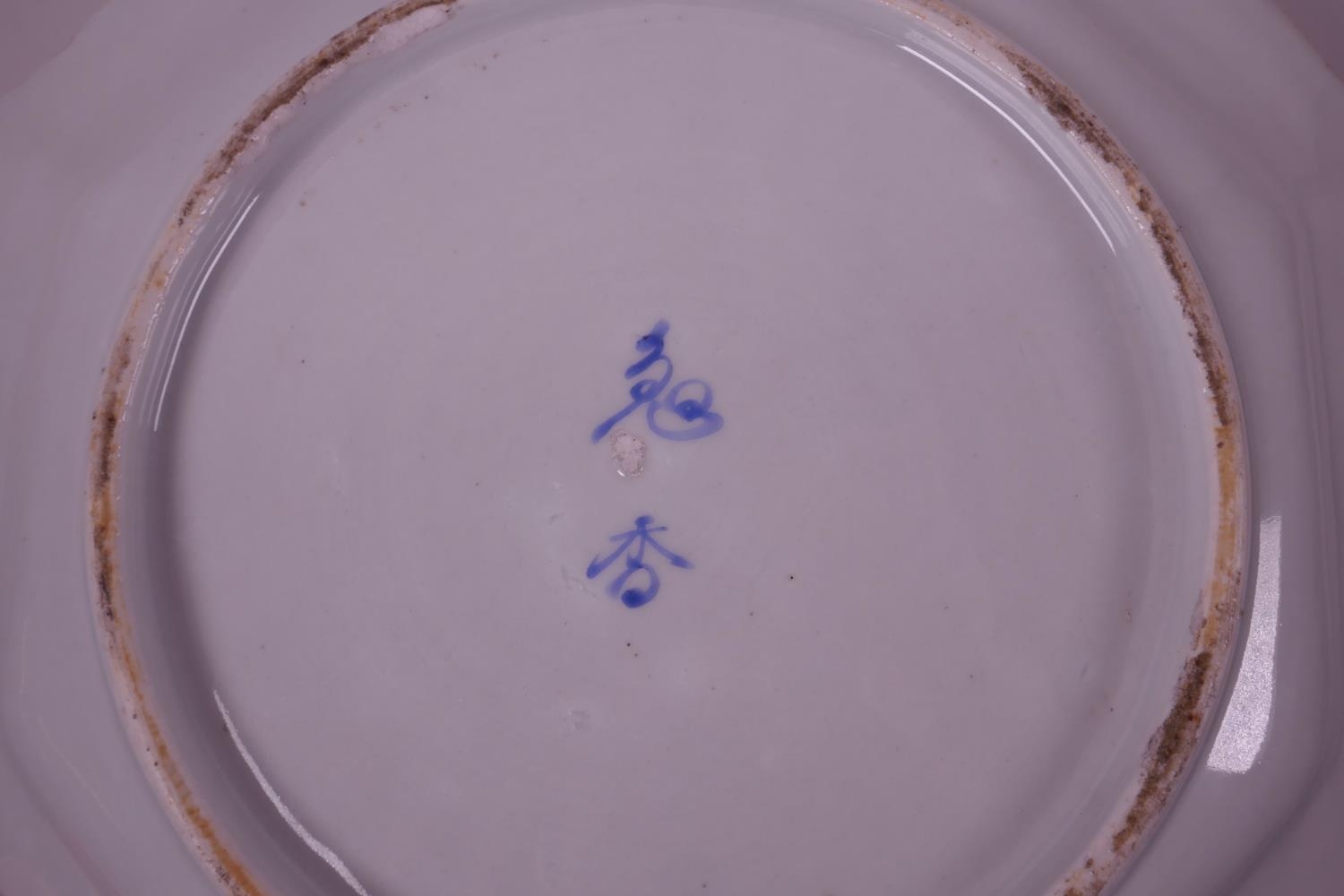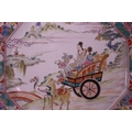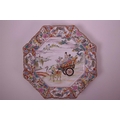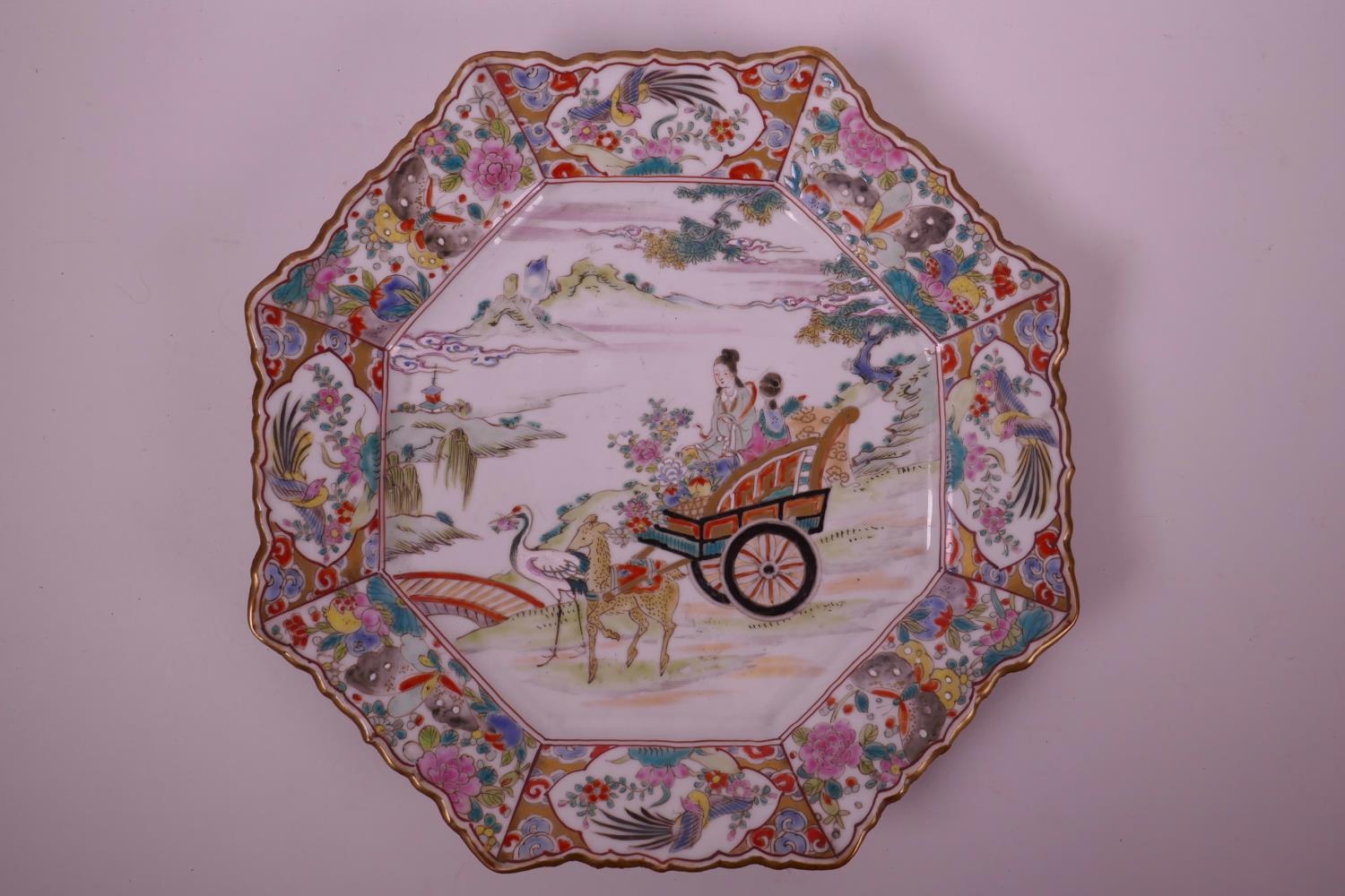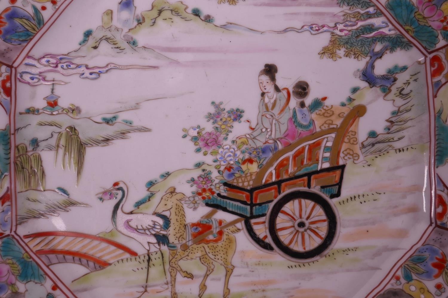 An antique Chinese famille verte octagonal porcelain charger, decorated with women travelling in a cart, 2 character mark to base, 12½" diameter