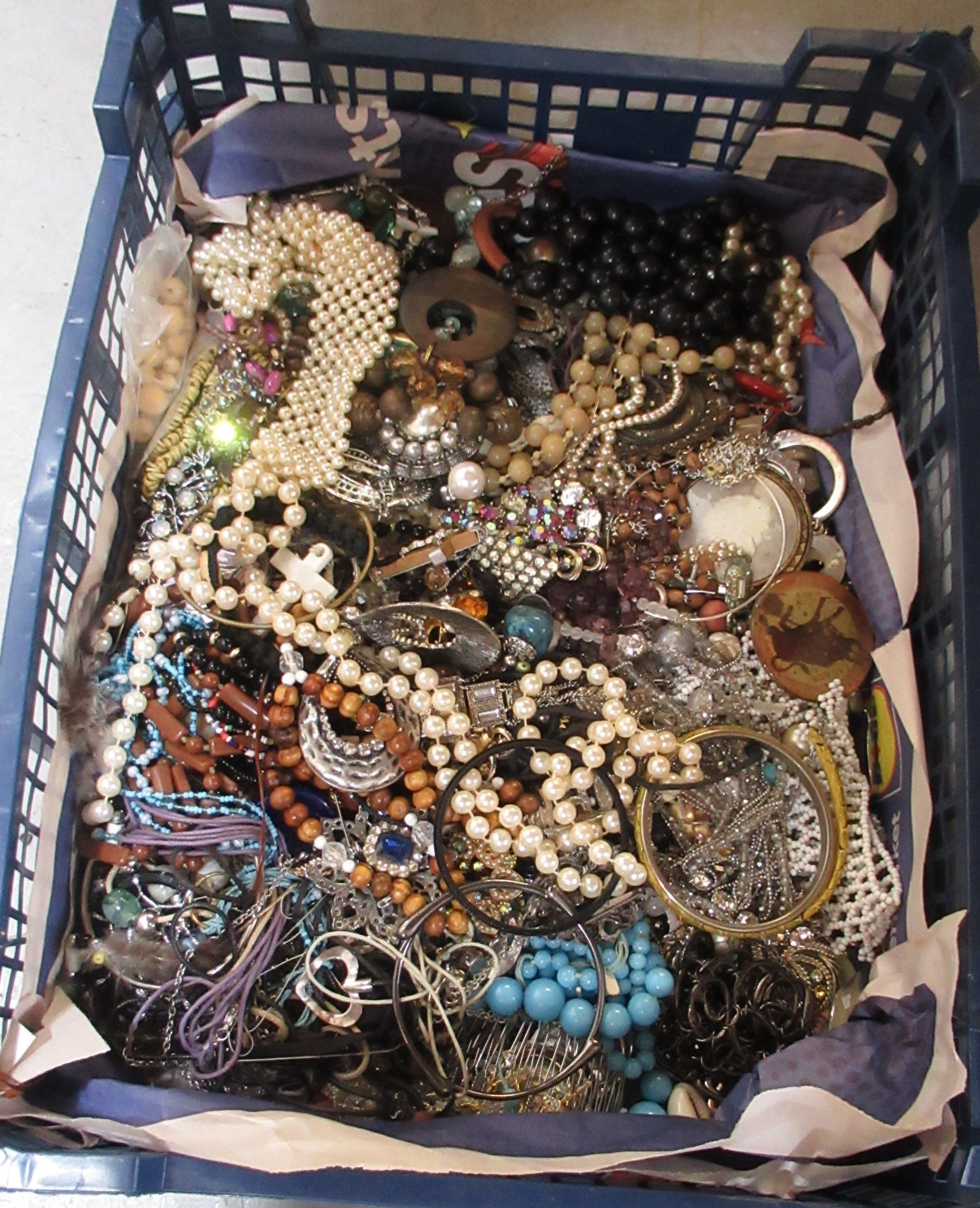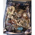Two boxes containing a quantity of various costume jewellery, including necklaces etc.