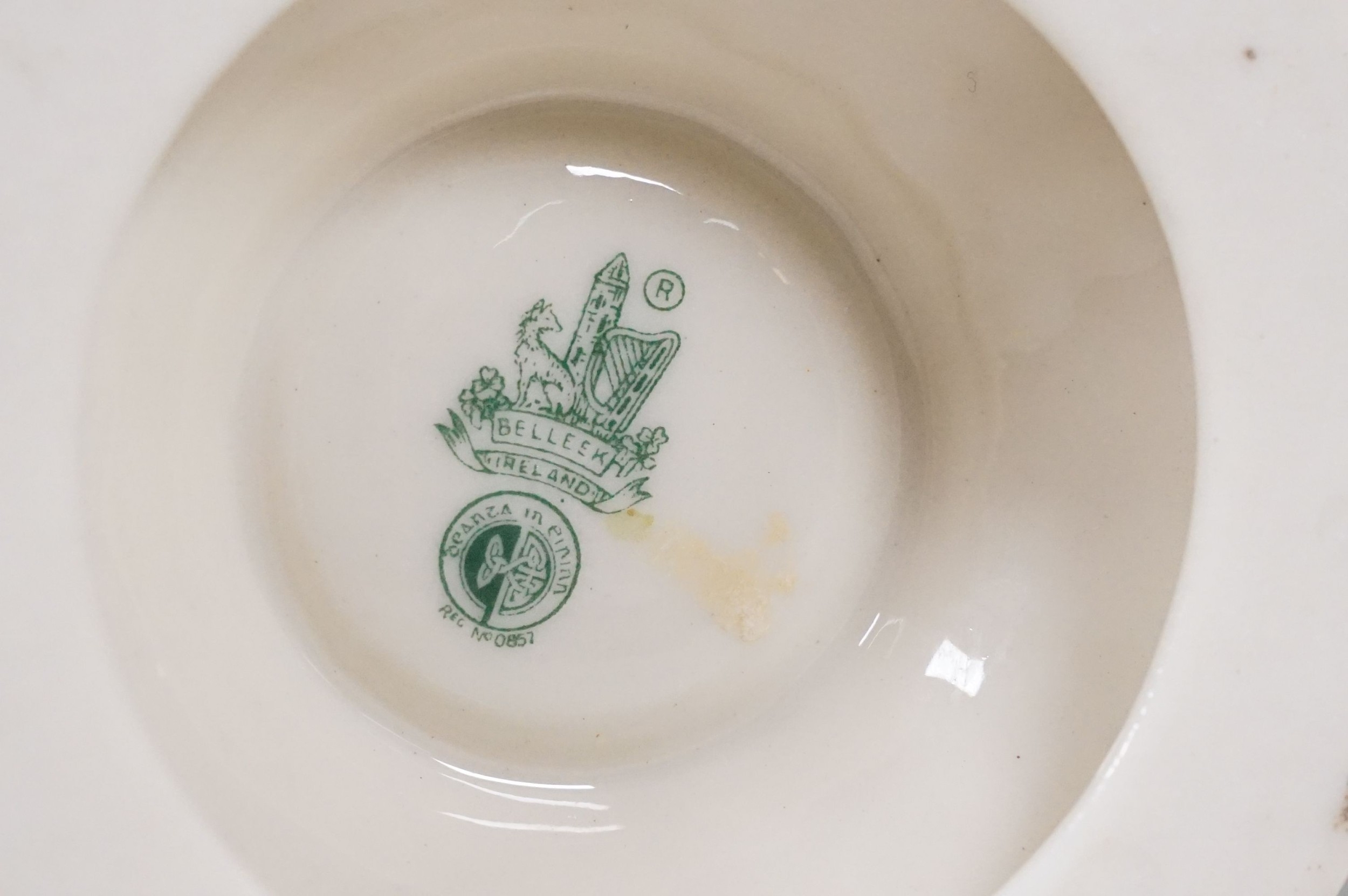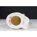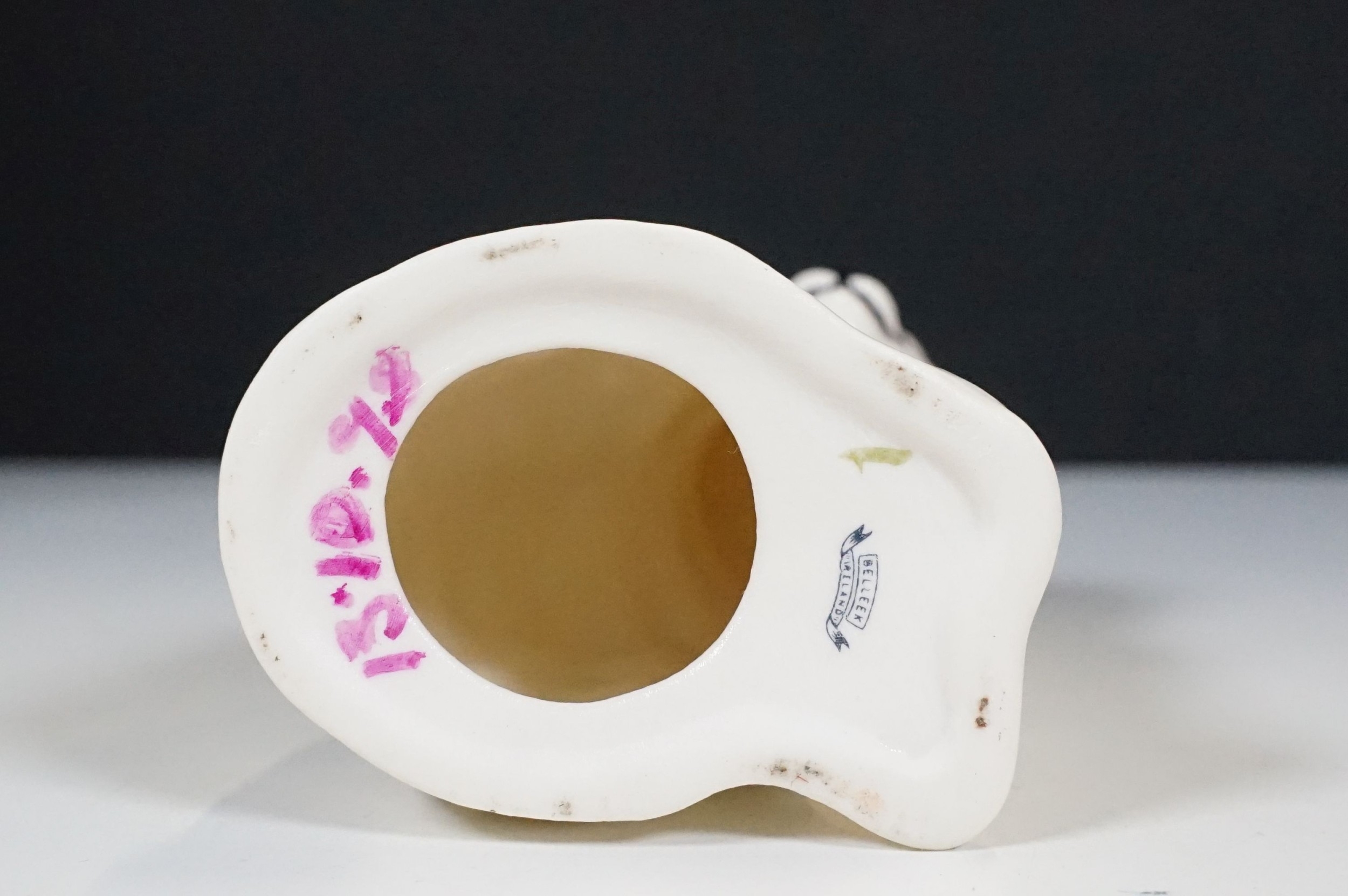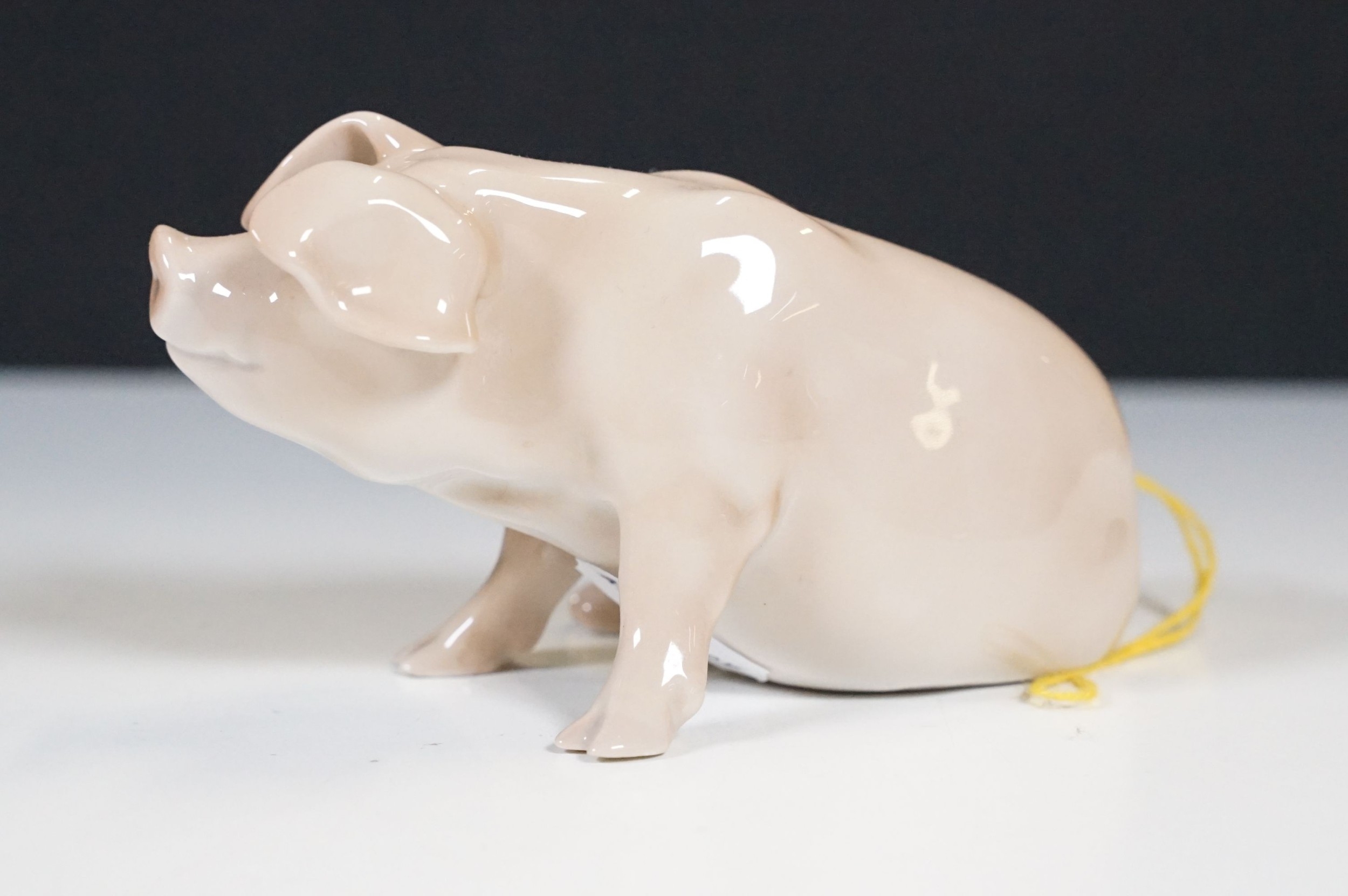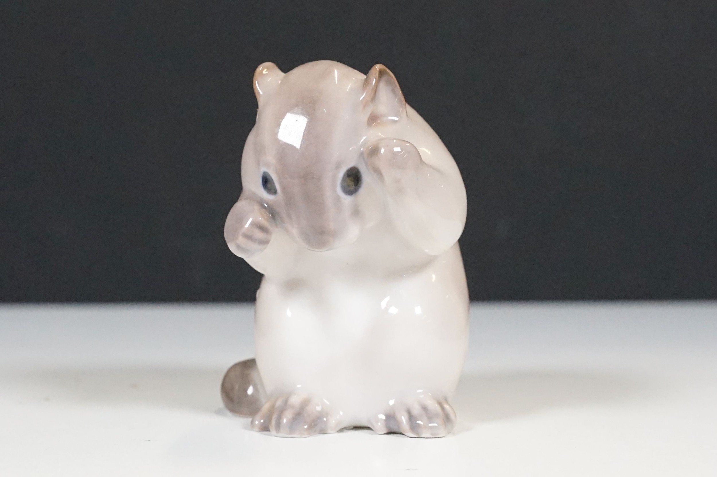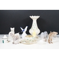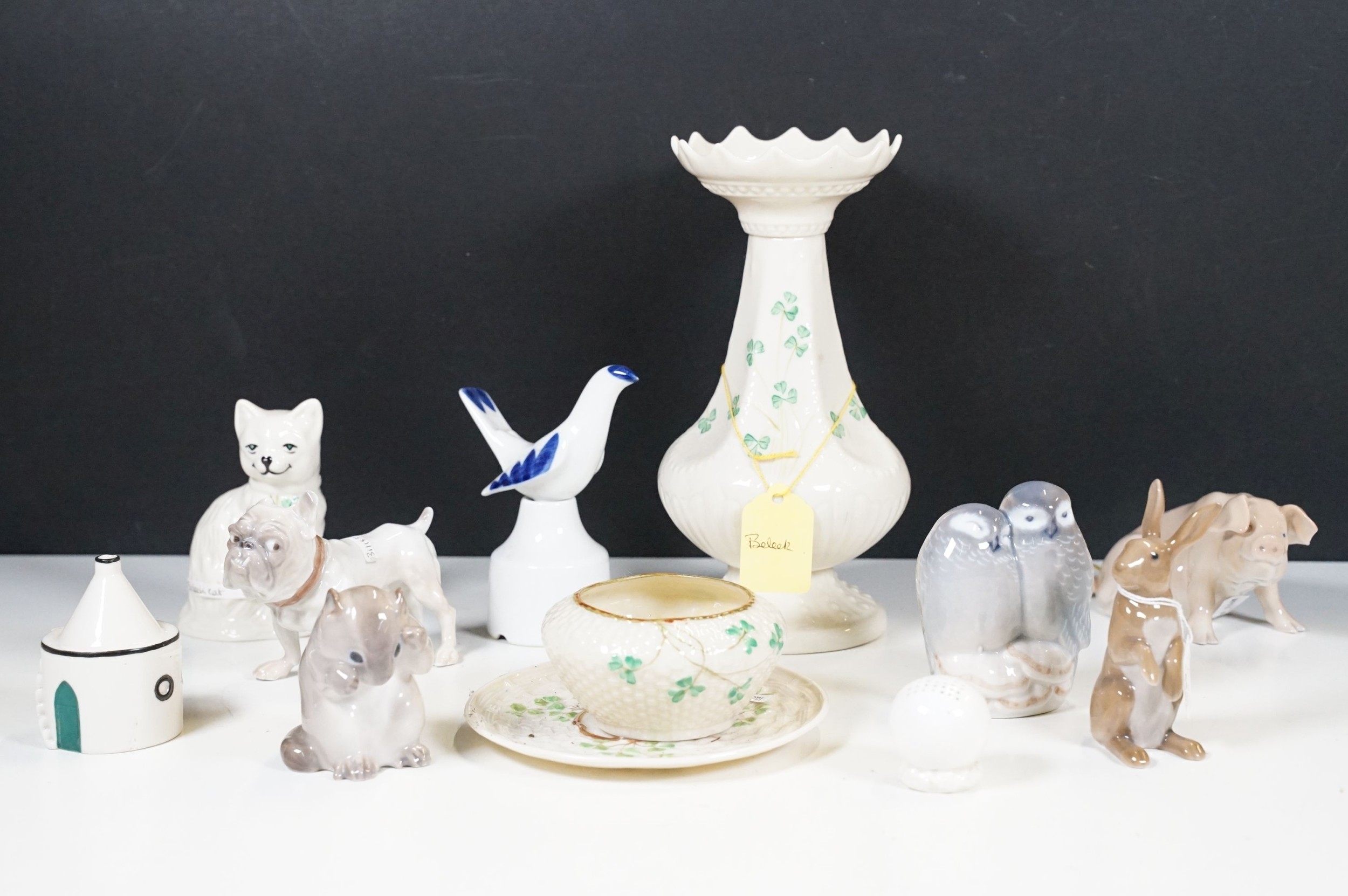 Selection of ceramics to include a Belleek clover vase H 20.5cm plate, dish and cat figurine, Royal Worcester pie funnel, W.H Goss 'Look out House' model, Royal Copenhagen rabbit figurine, squirrel, bull dog, owl and pig examples (12)