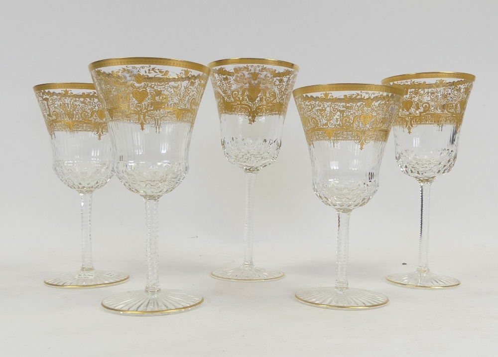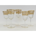 De Lamerie Fine Bone China Wine Glasses heavily gilded with various designs. Made in England. (5)