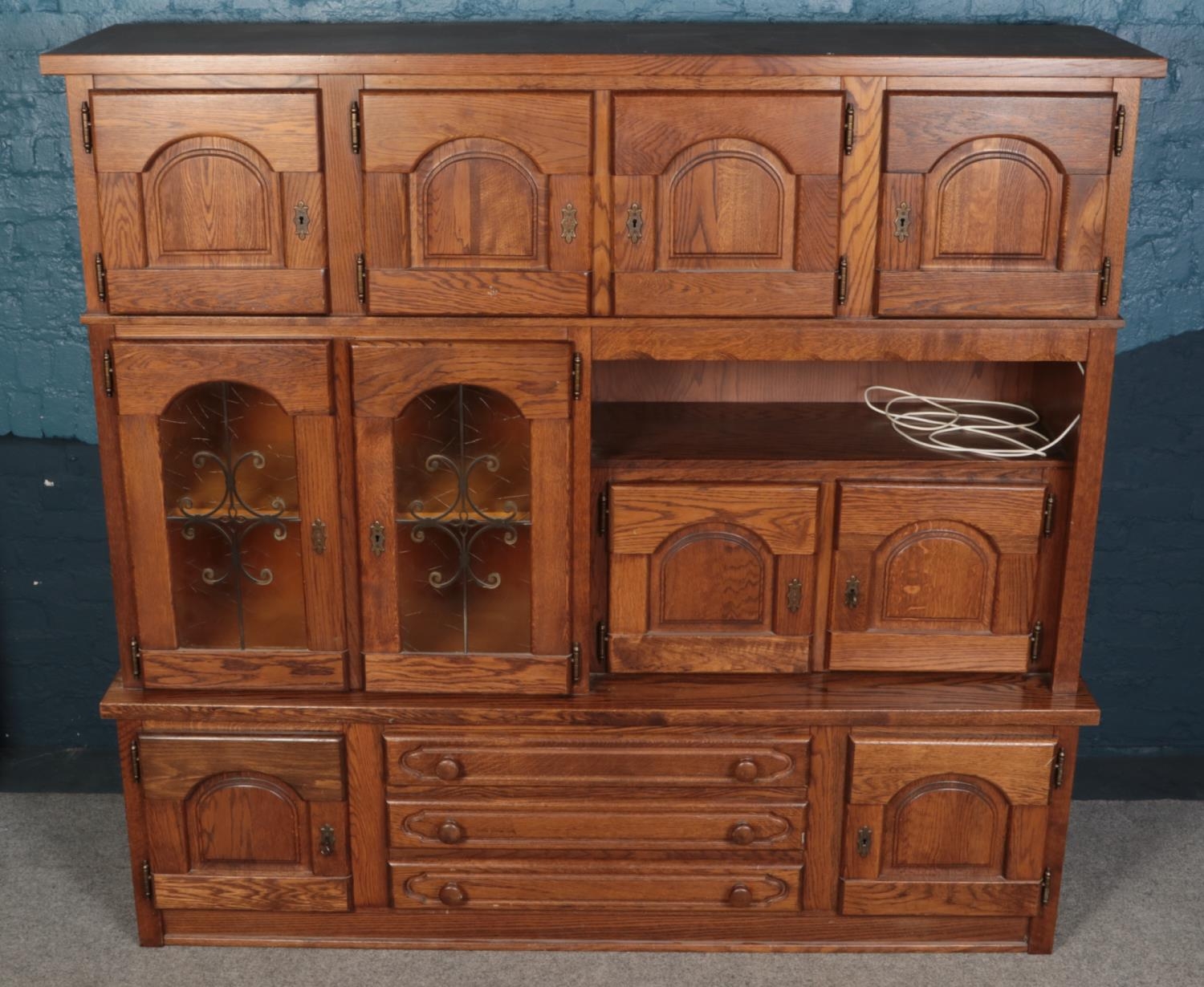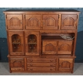 An oak fronted stacking display unit, with drawers and shelved sections. Height: 187cm, Width: 201cm, Depth: 57cm.