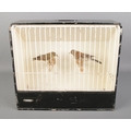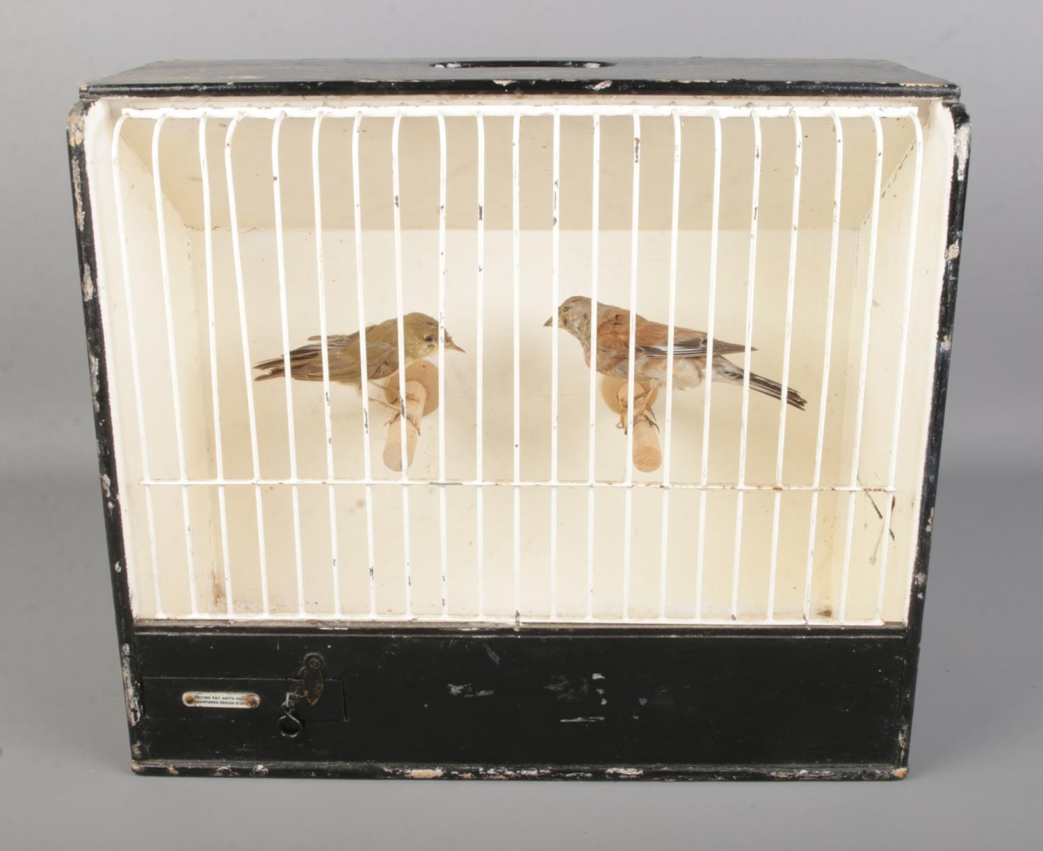 Two taxidermy canary houses in a wooden canary/bird cage