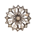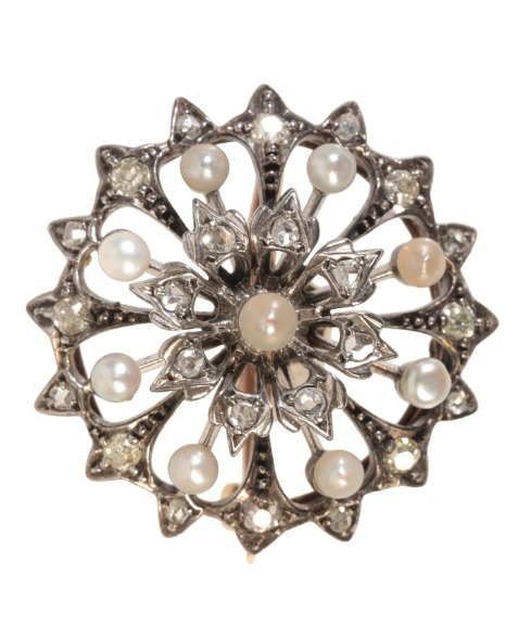 in silver on 15ct gold, designed as concentric rows of rose cut diamonds, pearls and old cut diamonds, secured with a detachable pin clasp bracket, no assay marks, 3.0cm, (gross weight - c.10.9g)
