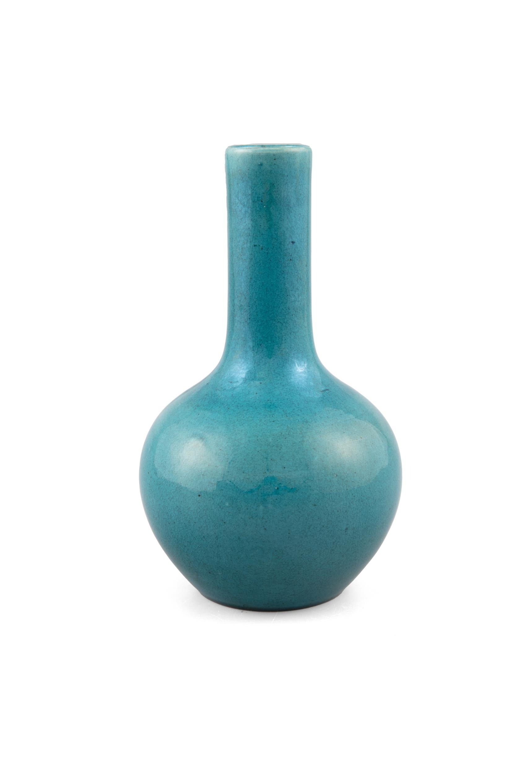 *A SMALL PEACOCK BLUE GLAZED PORCELAIN BOTTLE VASE 20?? ?????? China, 20th century H: 17.3 cm IMPORTANT NOTICE: *This lot is under temporary importation. An extra VAT will be applied to the final invoice. The rate will depend on the final country of destination. The sole buyers based in Ireland will be subject to an extra 13,5% VAT. Please contact our office (wei.wang@adams.ie) for further information.