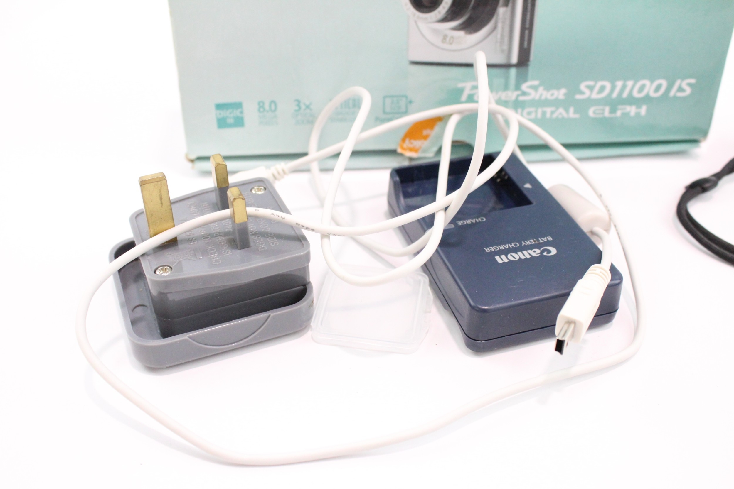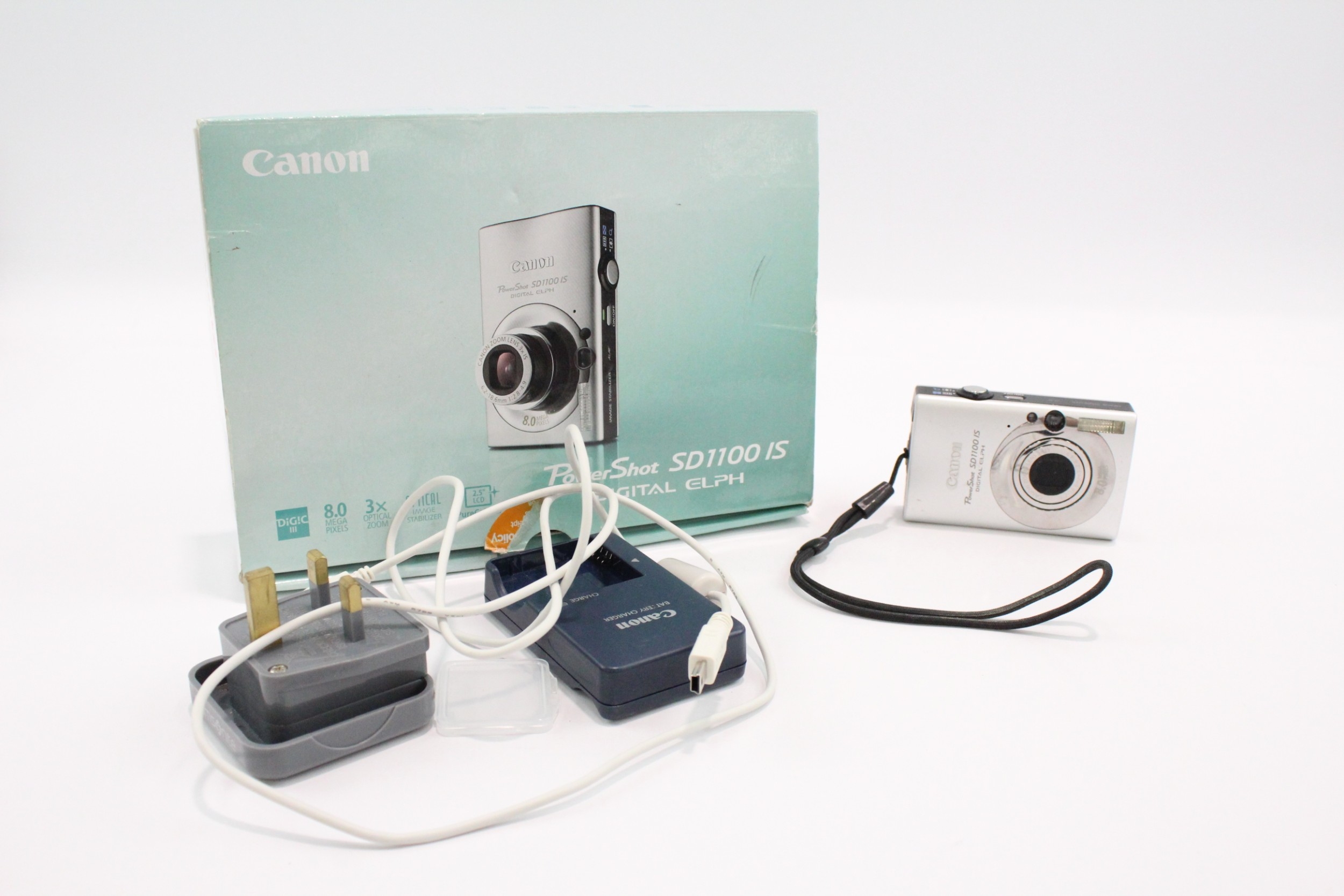 A boxed Canon PowerShot SD1100 IS 8mp CCD sensor compact digital camera with charger