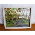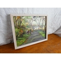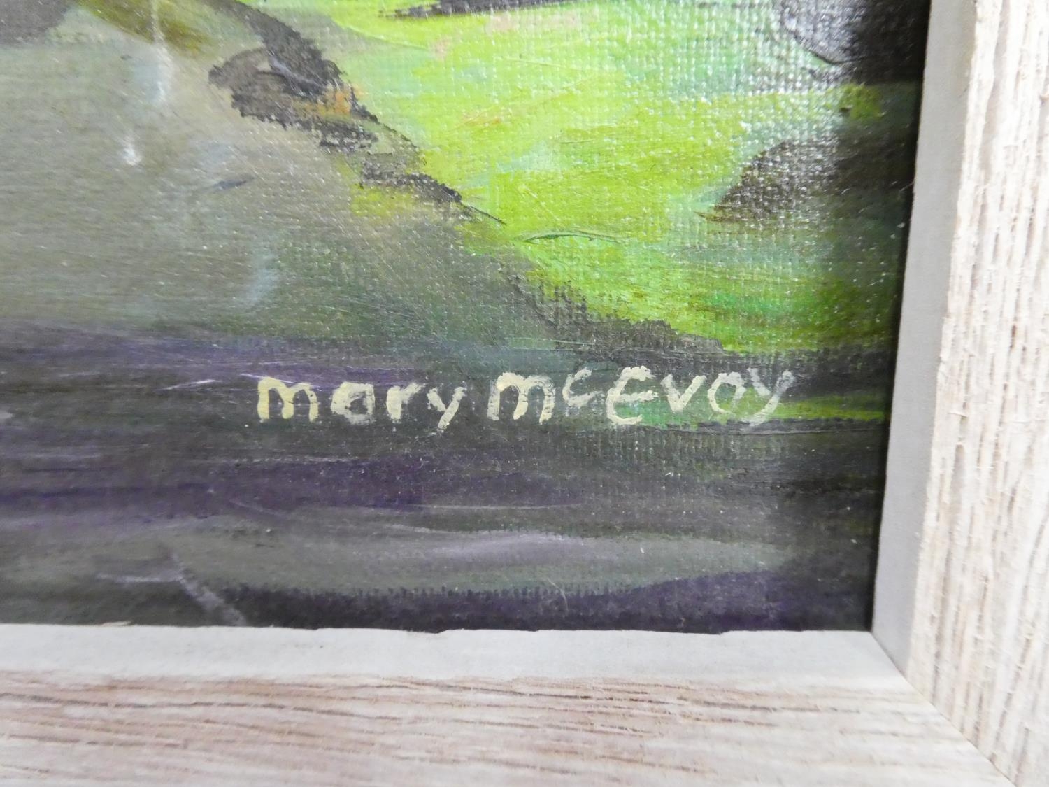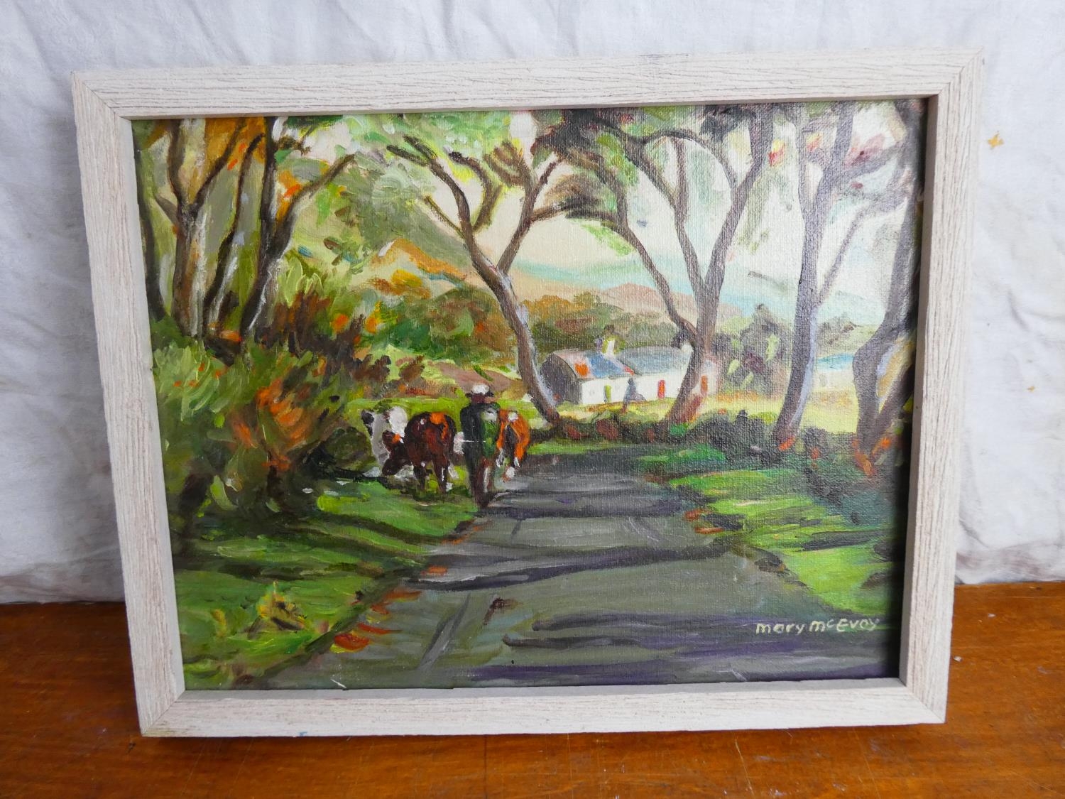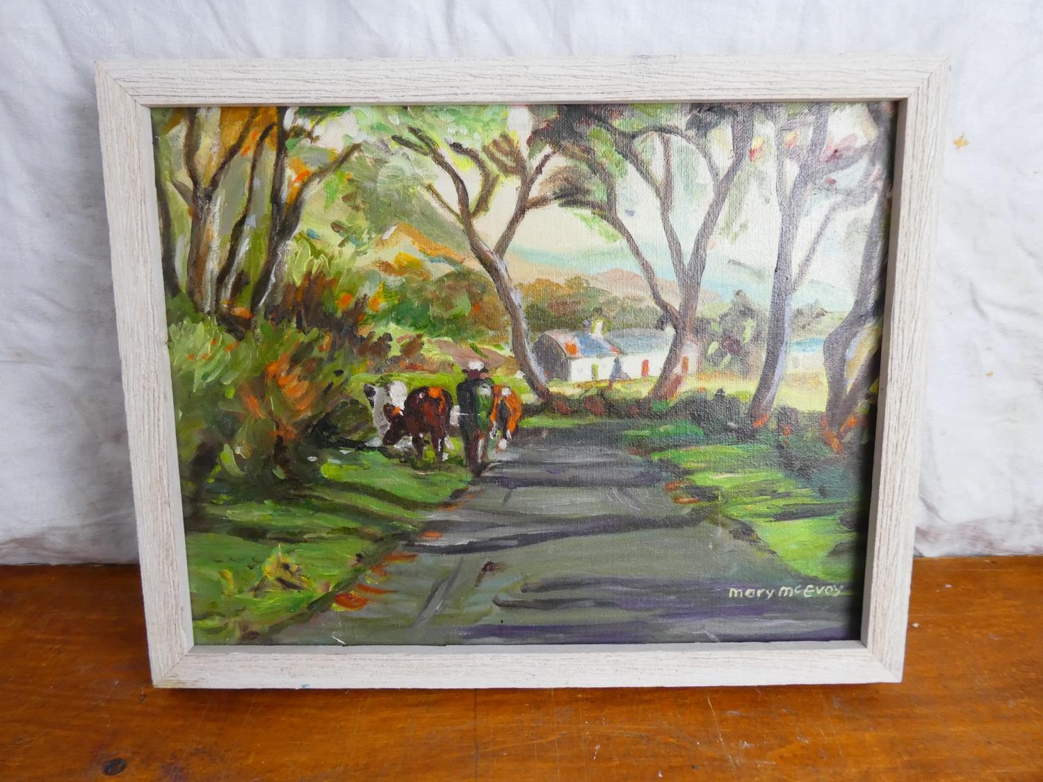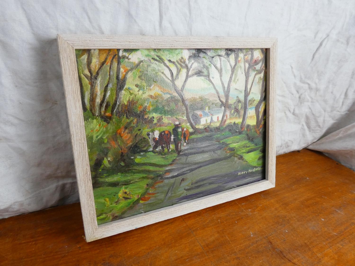 A framed oil painting 'Milking Time' by Mary McEvoy.