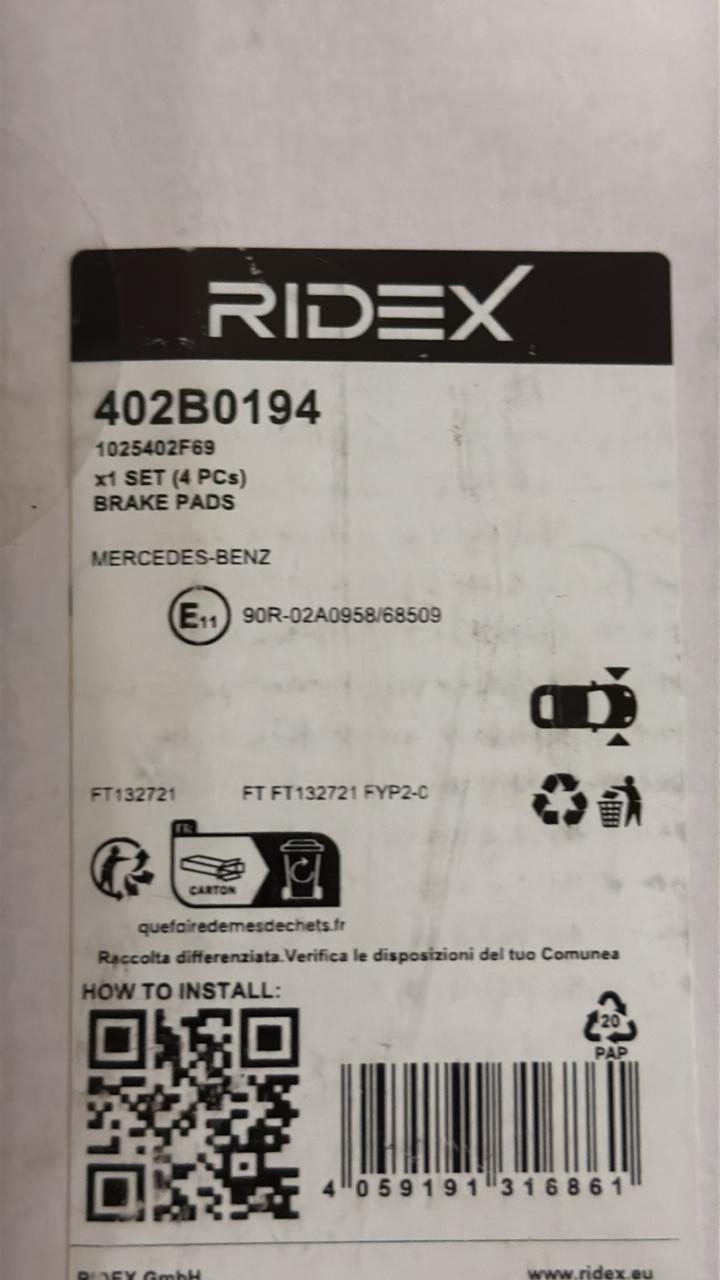 RIDEX BRAKE PADS 402B0194 1SET 4 PIECES
