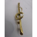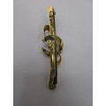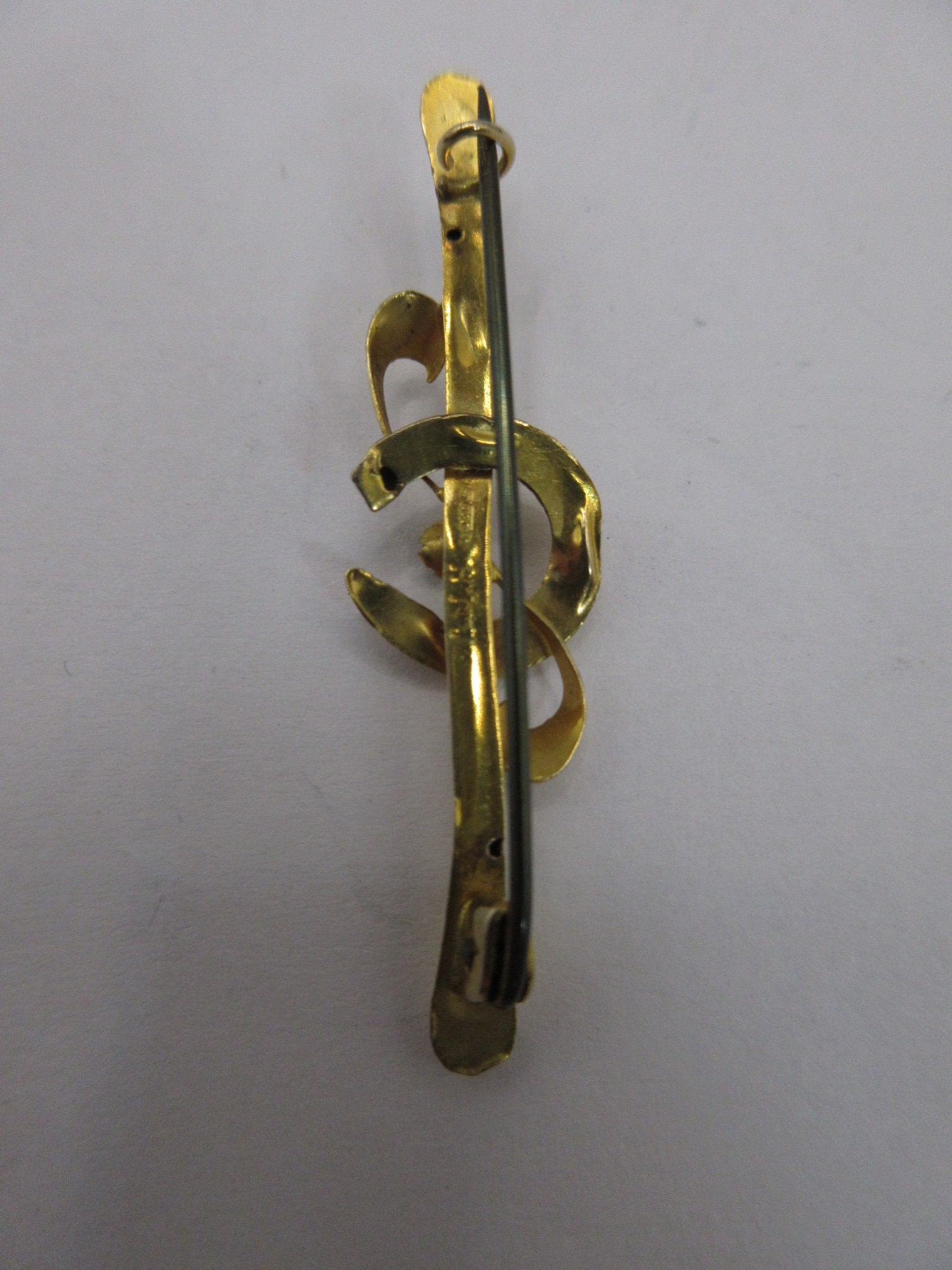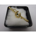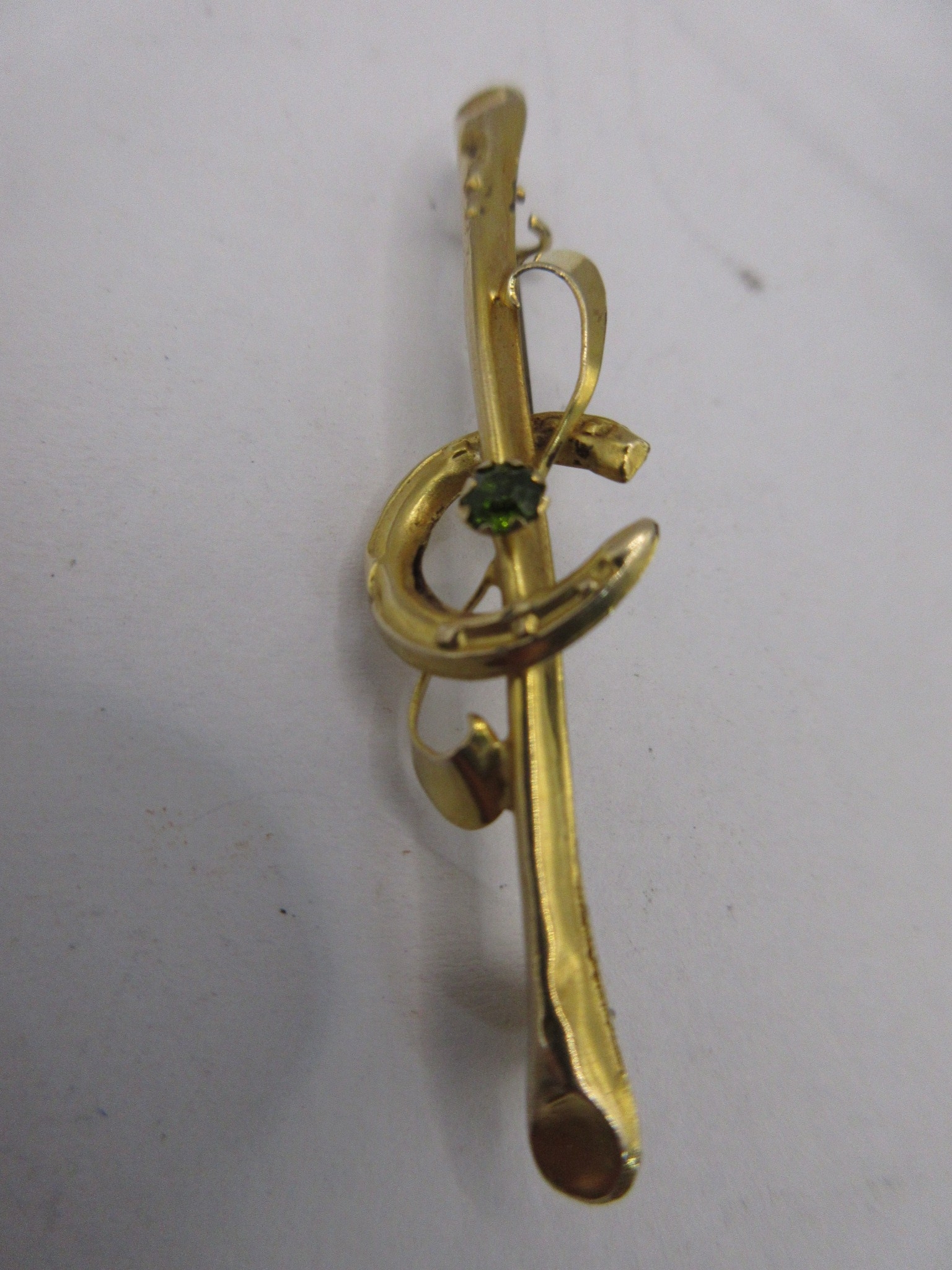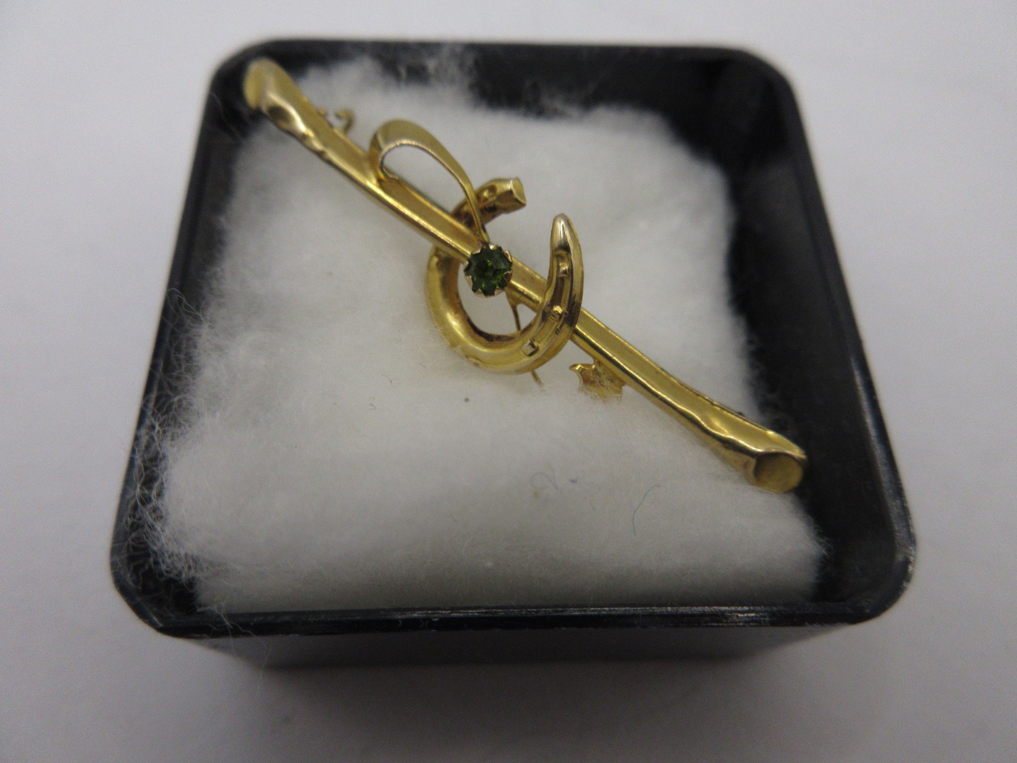 A 9 carat gold horseshoe and crop bar brooch set centrally with a green stone. Stamped AJH 9 .375 and partially distinct British hallmarks. The pin is base metal. Total gross weight approx. 1.3g. Length 45mm. With a black plastic box