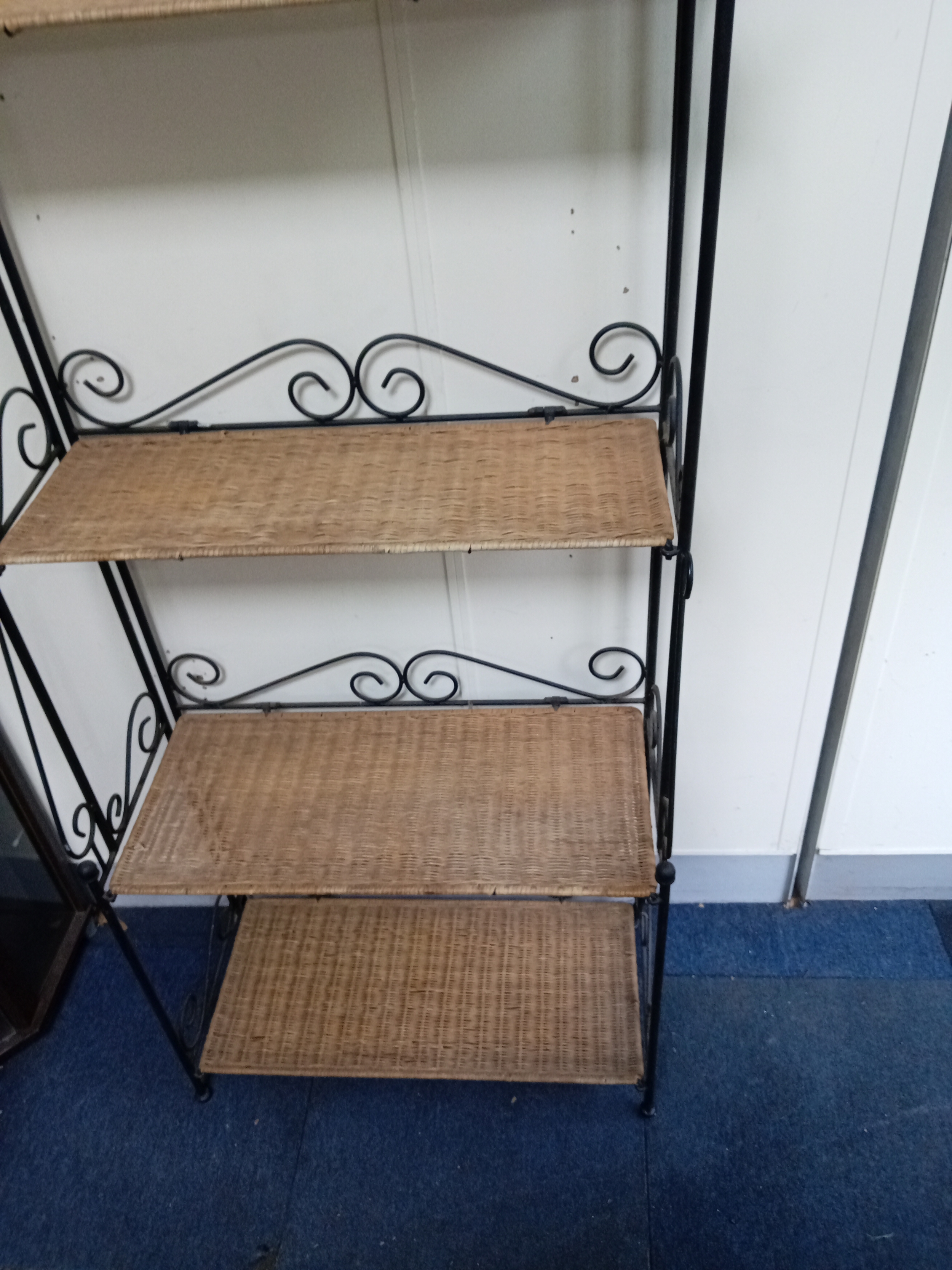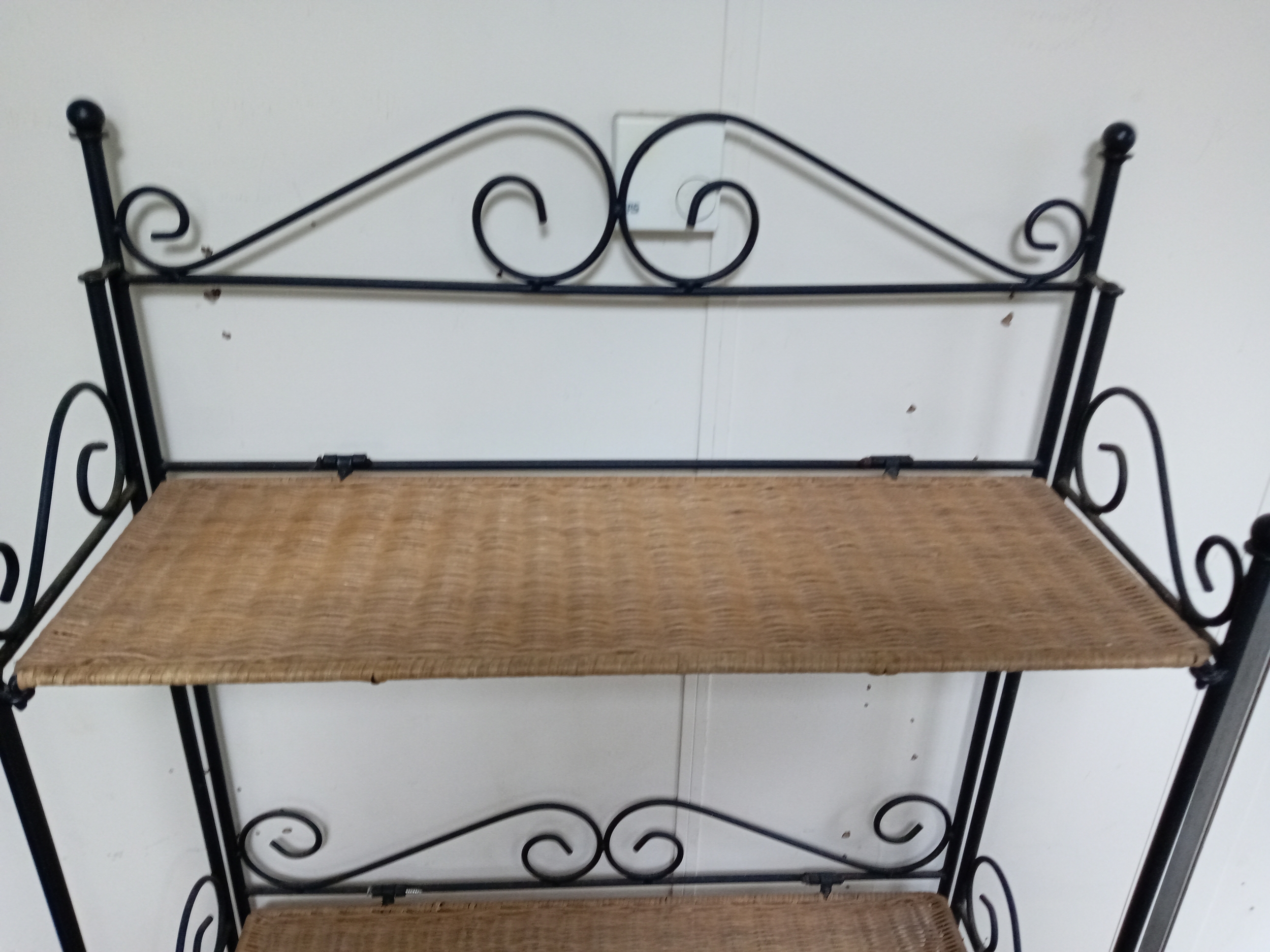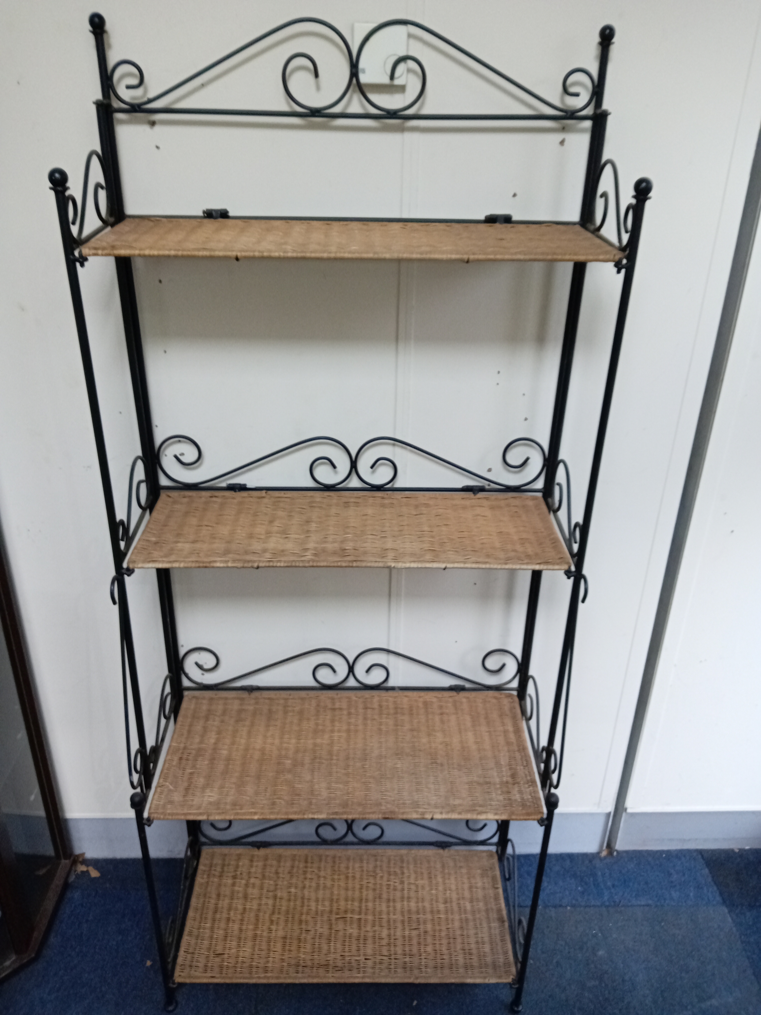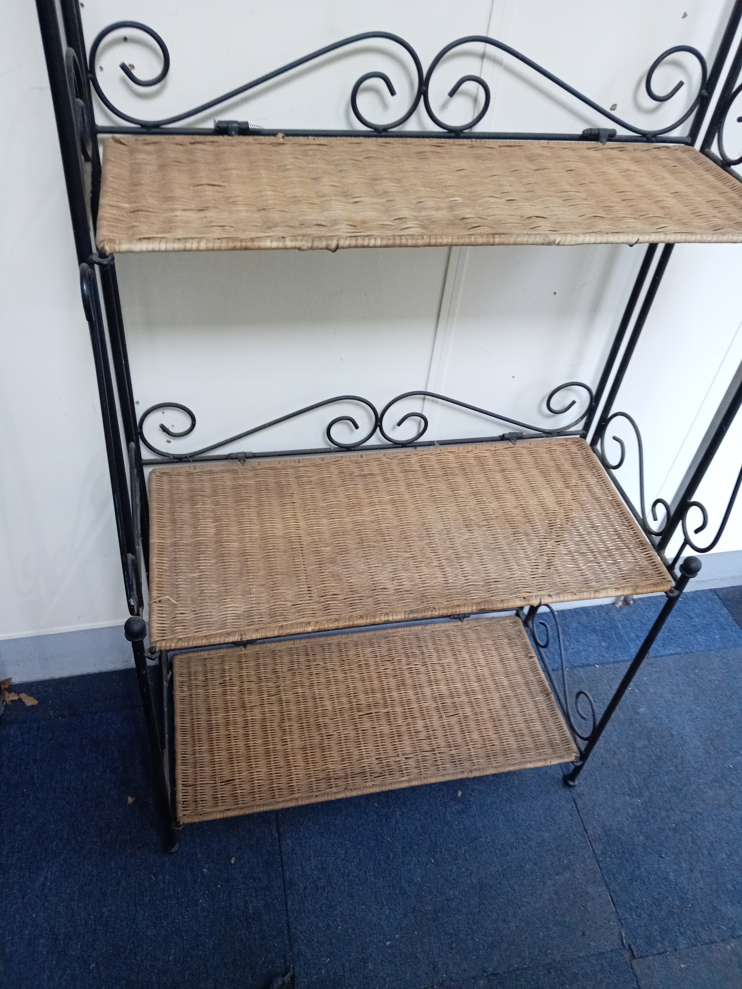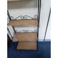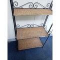 A Collapsible Wrought Iron and wicker shelving unit. Measure...