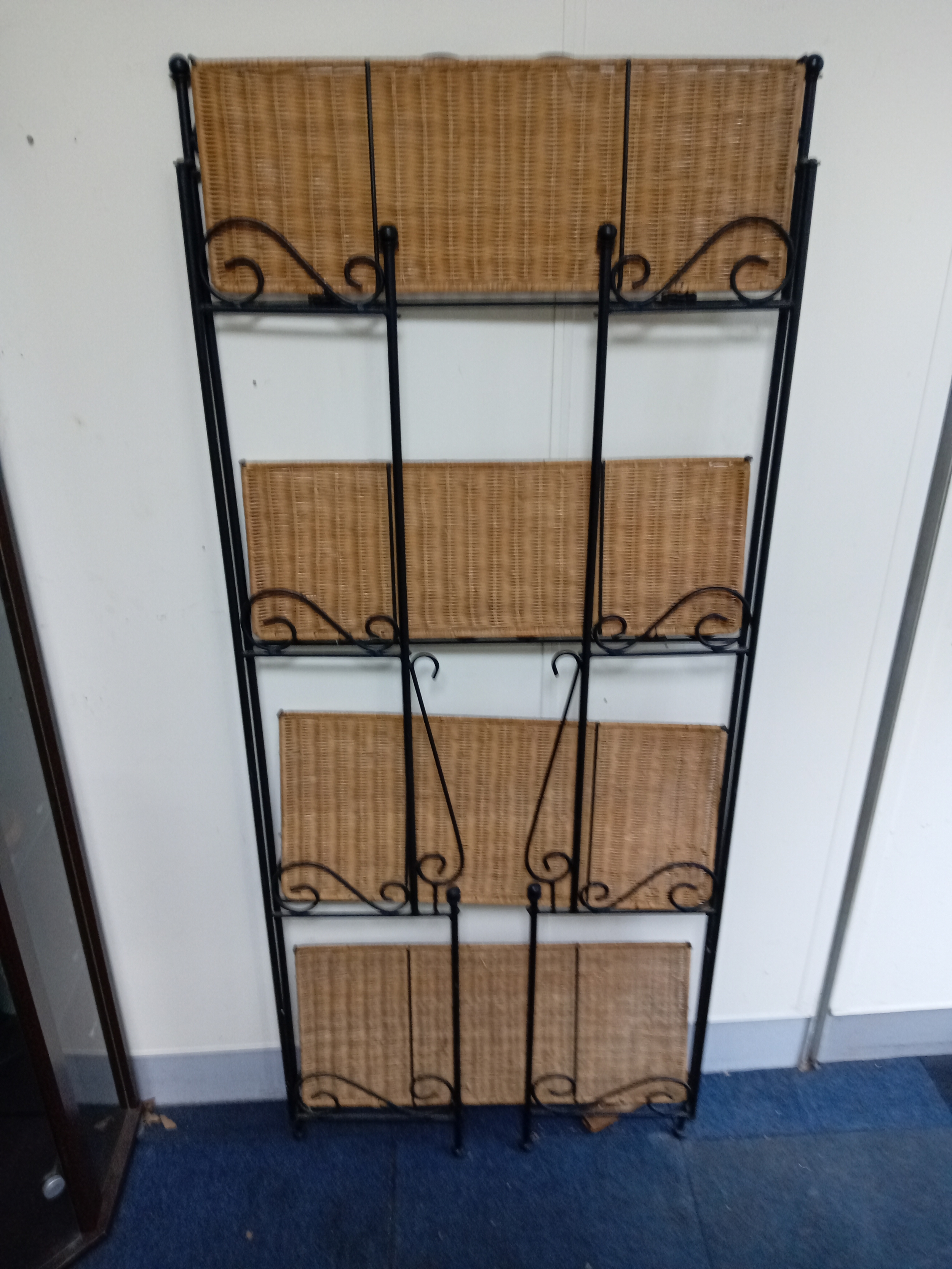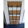 A Collapsible Wrought Iron and wicker shelving unit. Measures H 168cm x W 70cm x D 27cm. When collapsed Depth is 5cm.