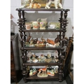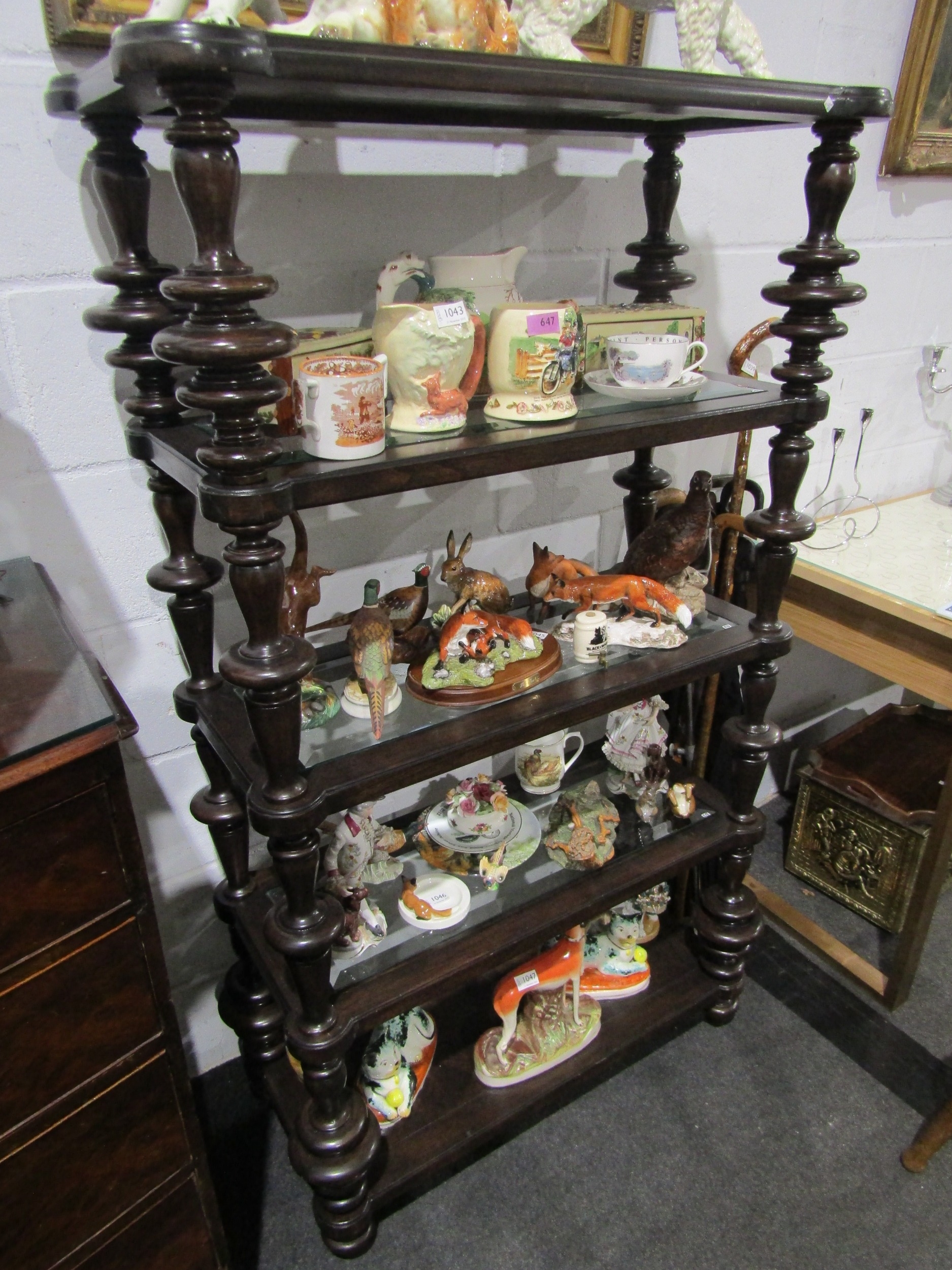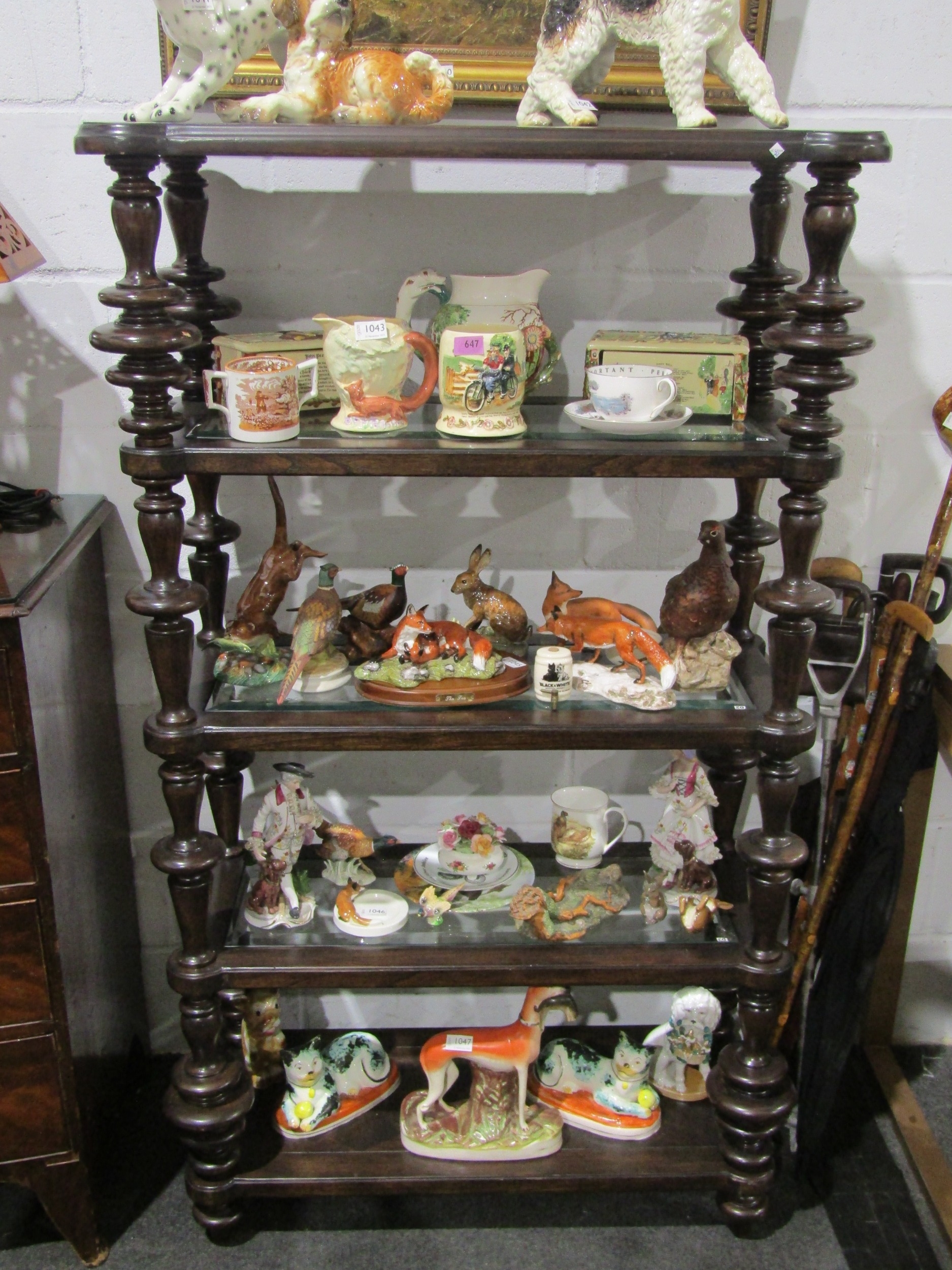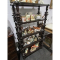 A far-Eastern hardwood shelving unit with turned supports, glass panel inserts, 158cm tall x 90cm wide x 42cm deep