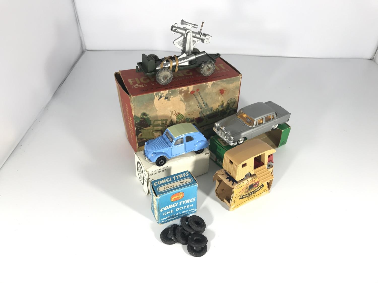 A Lone Ranger Modern Army series mobile fighting unit, a Mini Gama Mercedes-220 S #9350, a Matchbox Moko Lesney Series Horsebox mk7 #35 (box worn), a Corgi Citroen 2CV and a set of 8 Corgi replacement tyres.