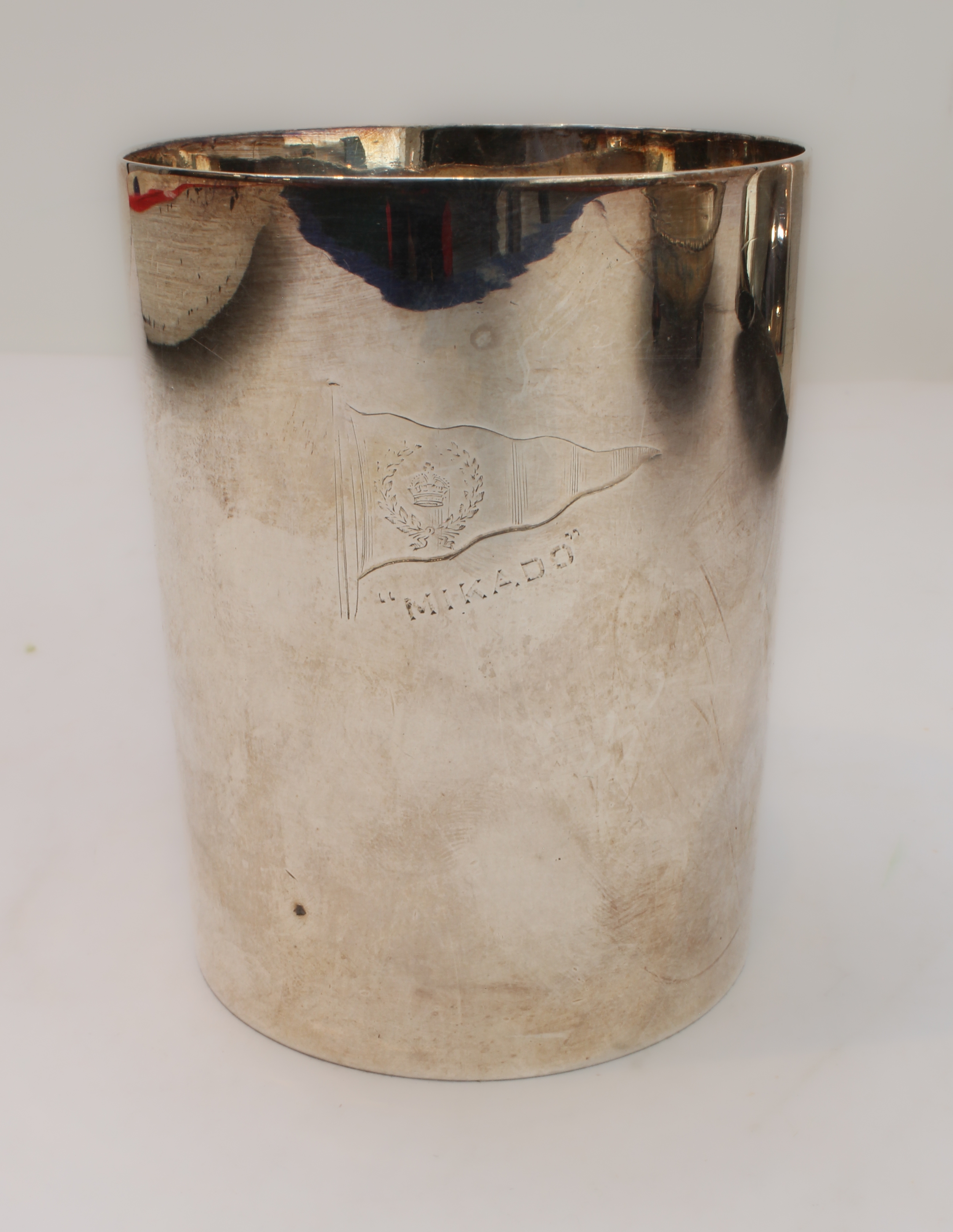 an early 20th century tankard of maritime interest, with engraved flag depicting a crown surrounded by a wreath and with 'Nicado' below.
