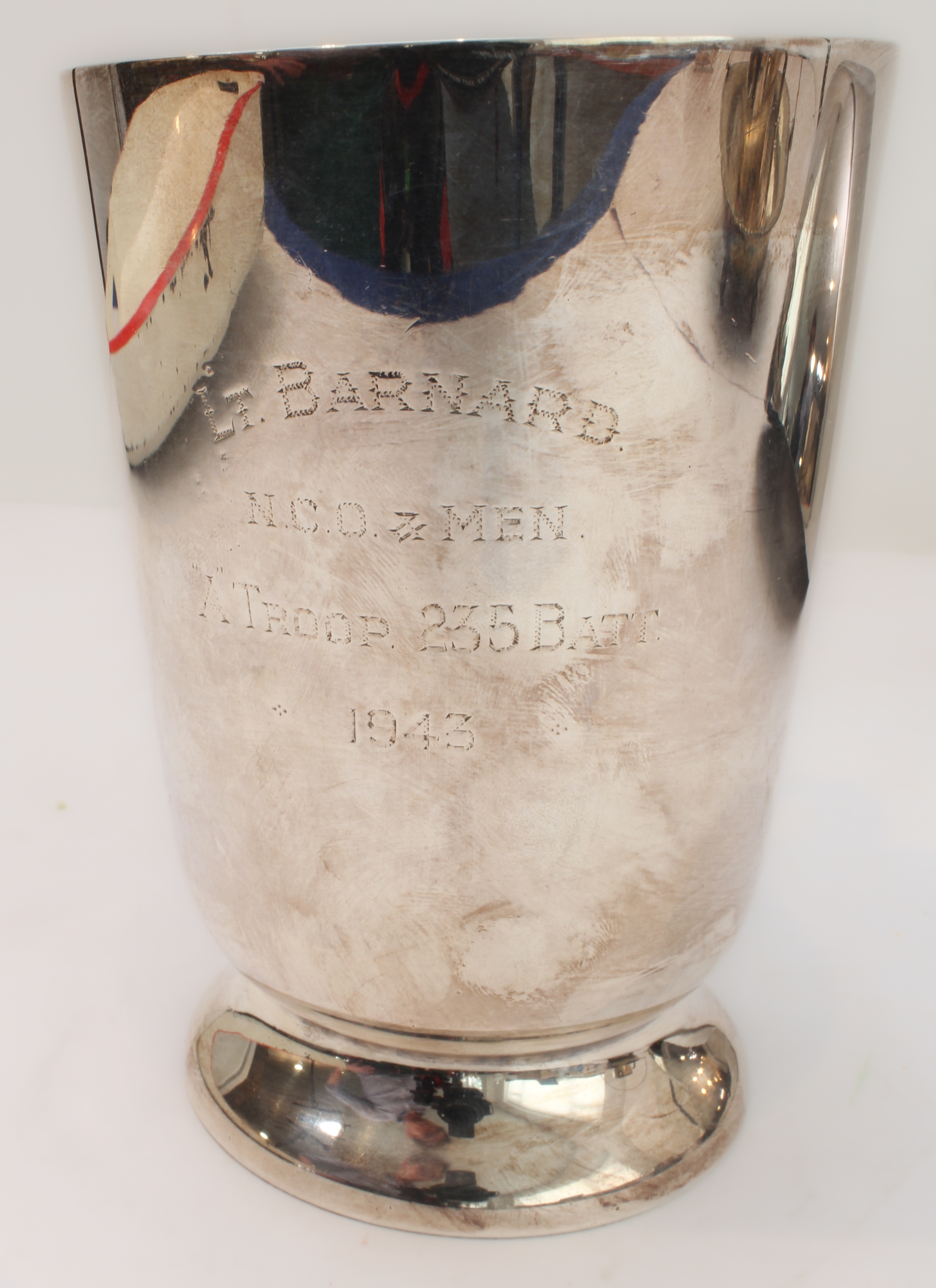 a presentation tankard engraved 'LT. Barnard - N.C.O. & Men, A Troop, 235 Batt., 1943';