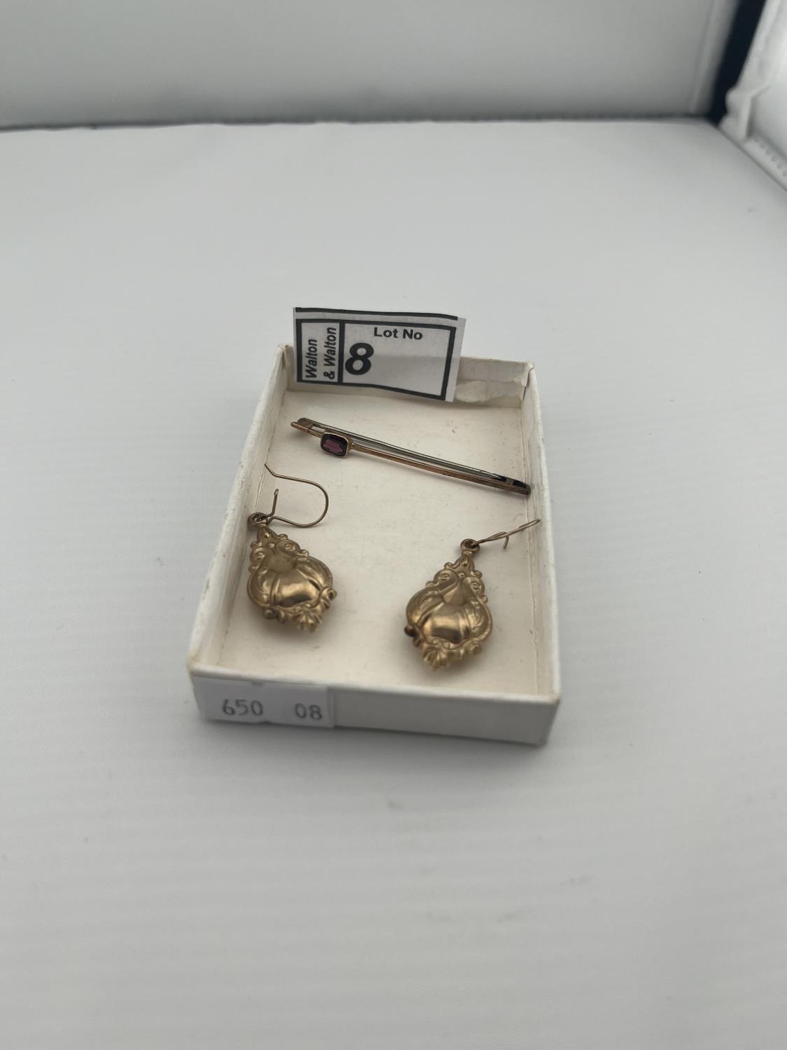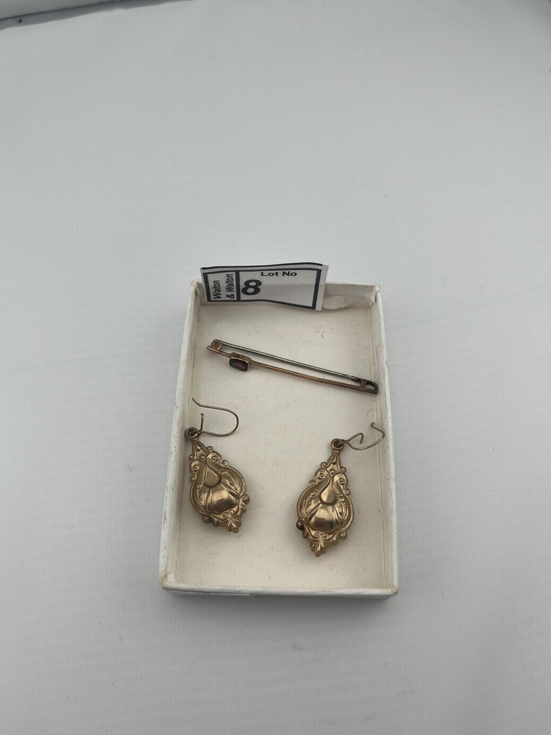 9ct Gold stone set brooch and a pair of earrings (tests as 9ct), 3.5g - Only 10% buyer's premium