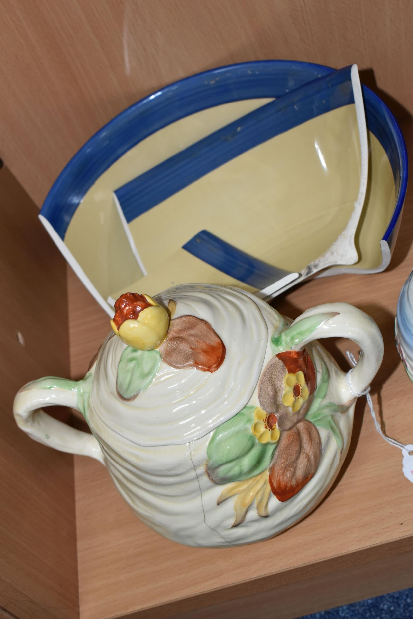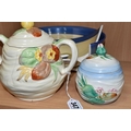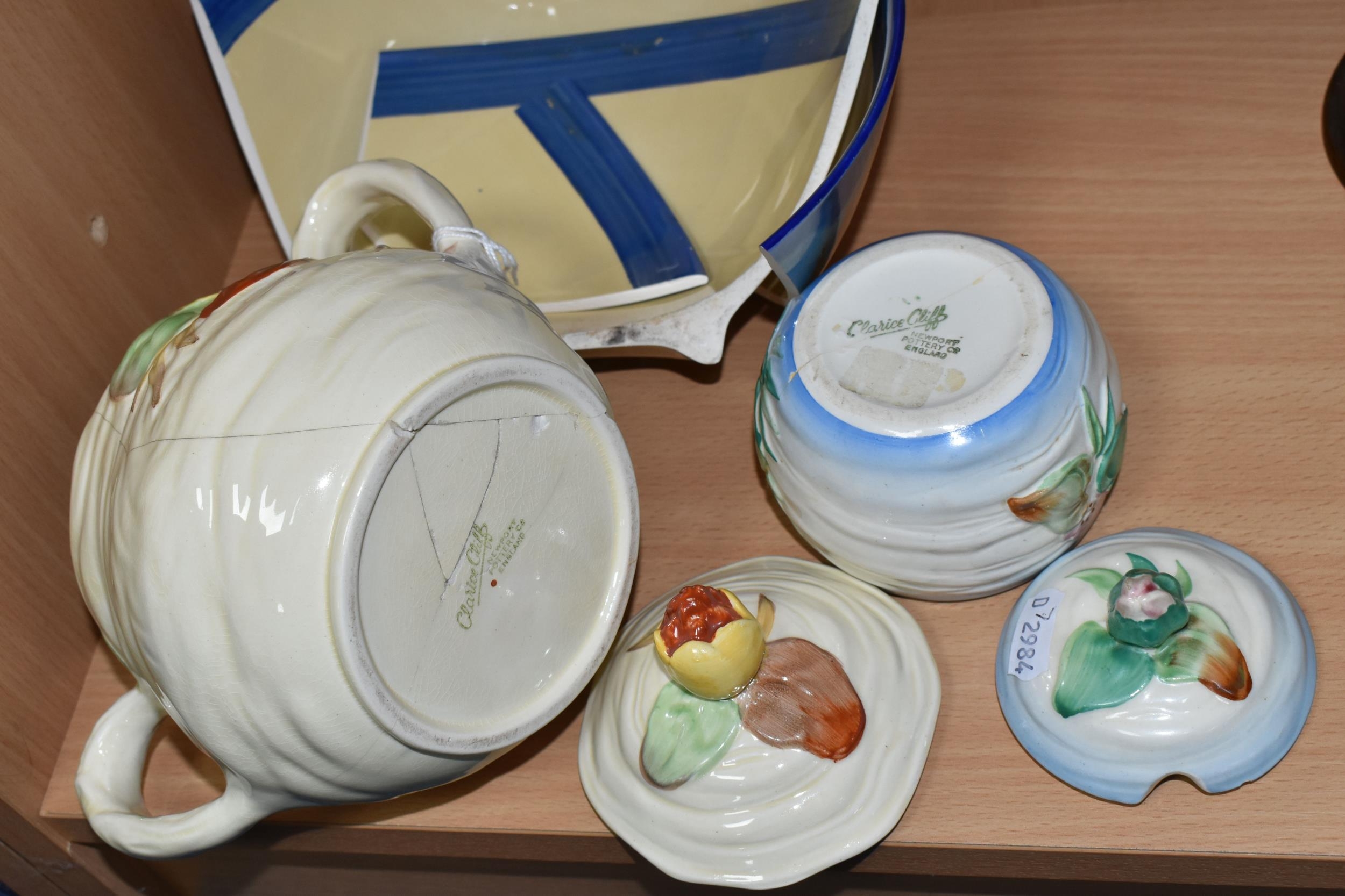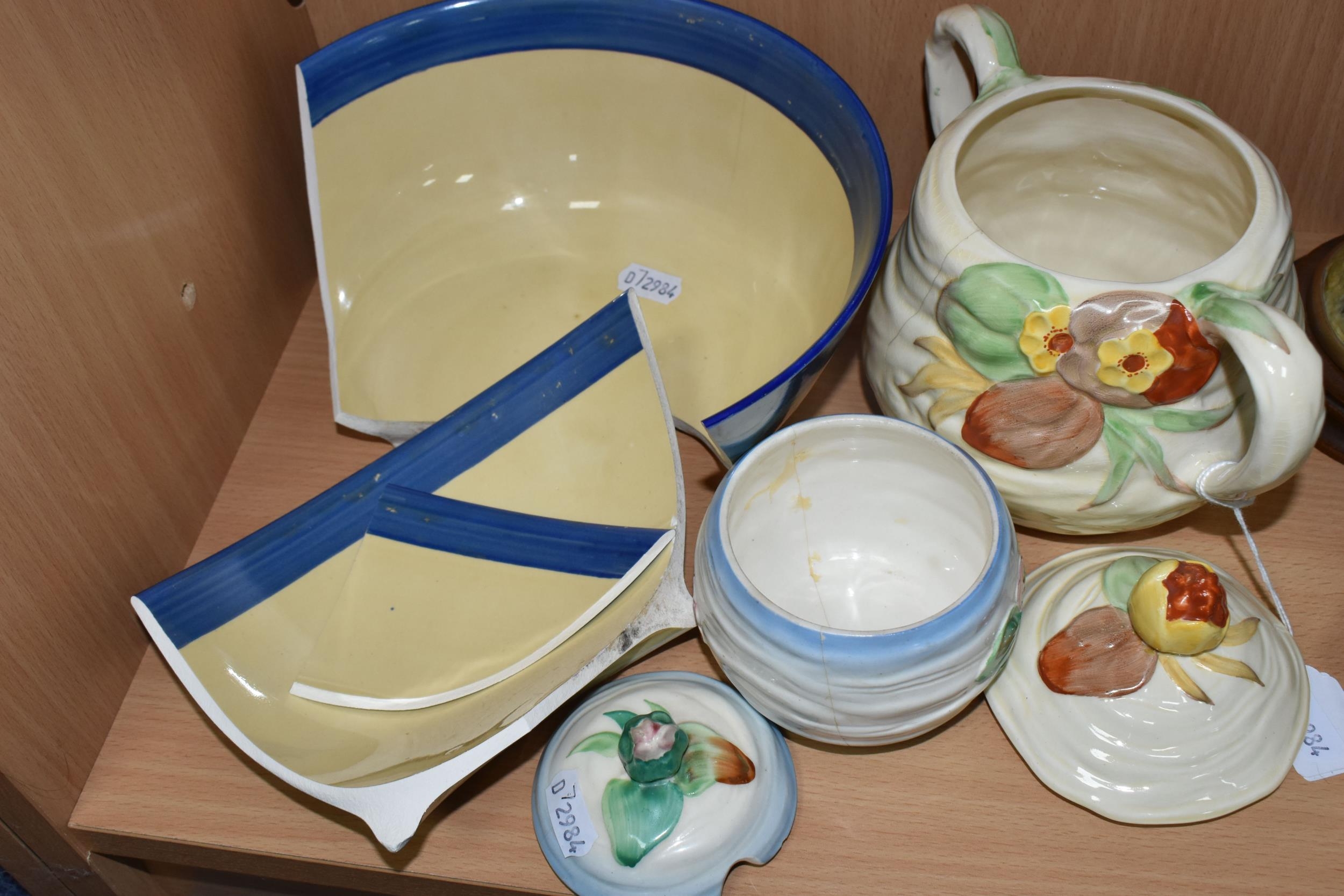 A GROUP OF CLARICE CLIFF CERAMICS, comprising Clarice Cliff for Newport Pottery biscuit barrel and preserve pot in the Waterlily pattern, together with three pieces of a Bizarre Delecia bowl (3) (Condition Report: all pieces have condition issues, biscuit barrel has extensive repairs to the body of the piece, lid appears ok, preserve pot has been broken almost in half and repaired, its lid has a chip and a hairline crack, the bowl is in three pieces which do fit together to form the majority of the original bowl, it also has a hairline crack)