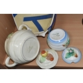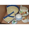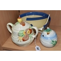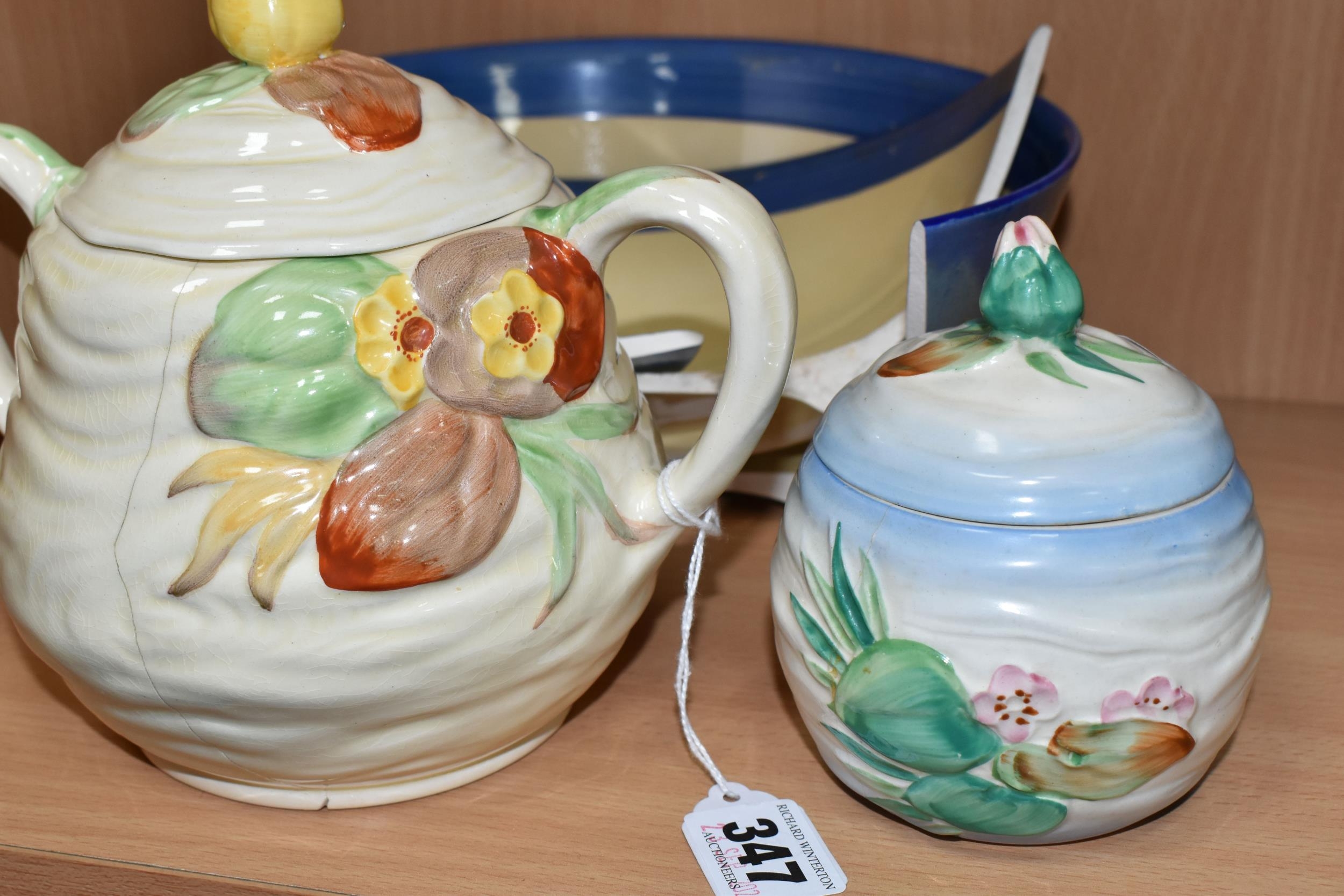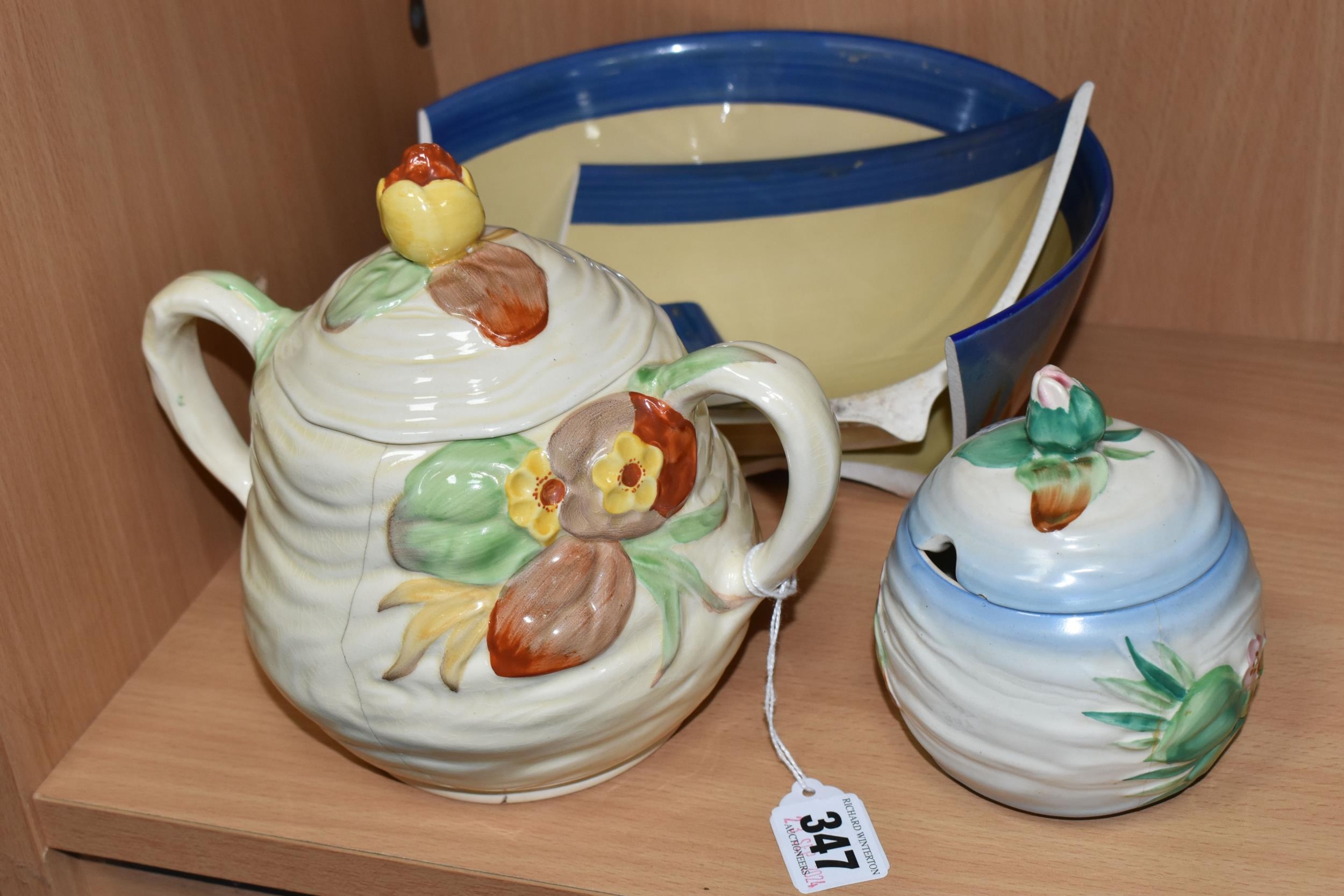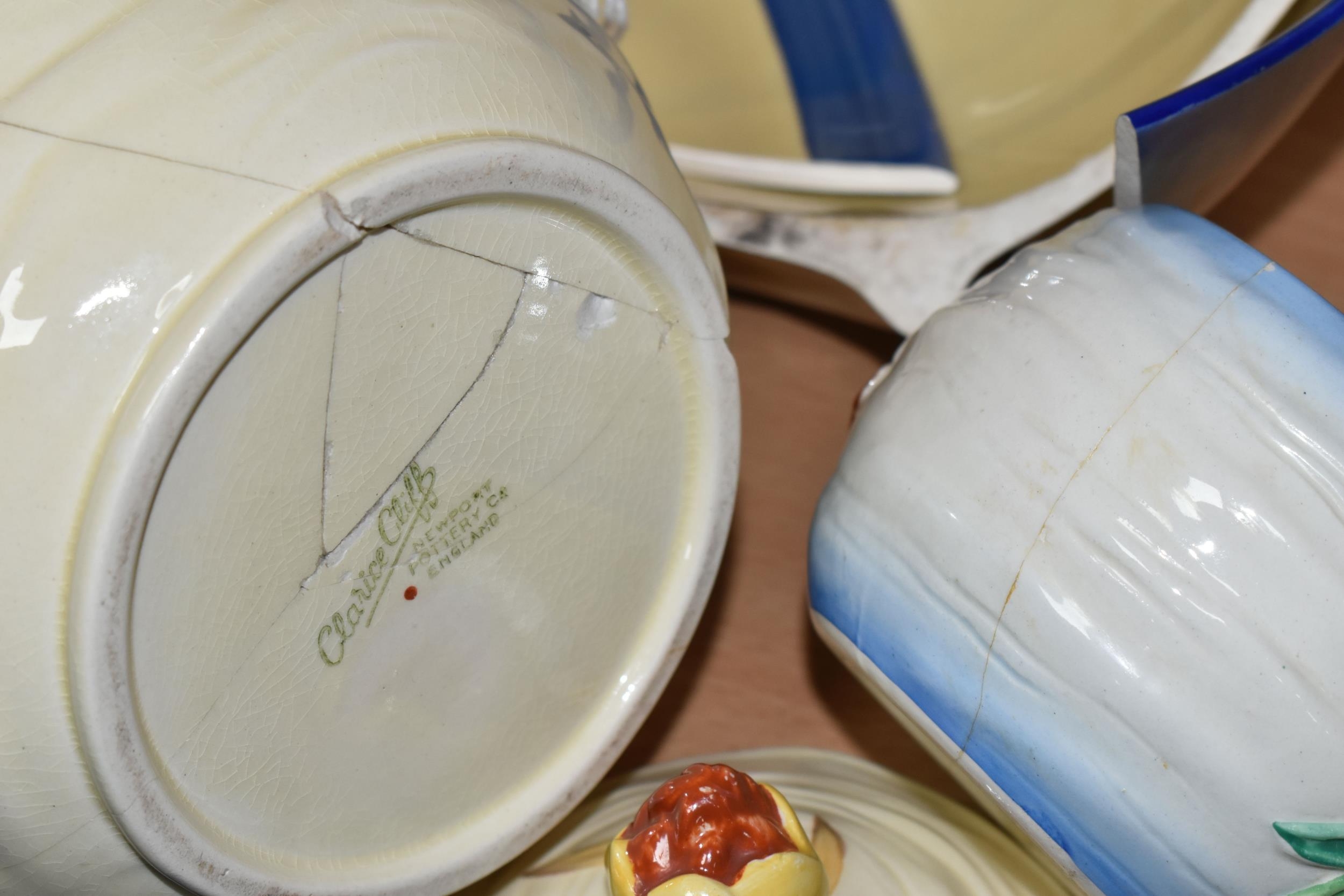 A GROUP OF CLARICE CLIFF CERAMICS, comprising Clarice Cliff for Newport Pottery biscuit barrel and preserve pot in the Waterlily pattern, together with three pieces of a Bizarre Delecia bowl (3) (Condition Report: all pieces have condition issues, biscuit barrel has extensive repairs to the body of the piece, lid appears ok, preserve pot has been broken almost in half and repaired, its lid has a chip and a hairline crack, the bowl is in three pieces which do fit together to form the majority of the original bowl, it also has a hairline crack)