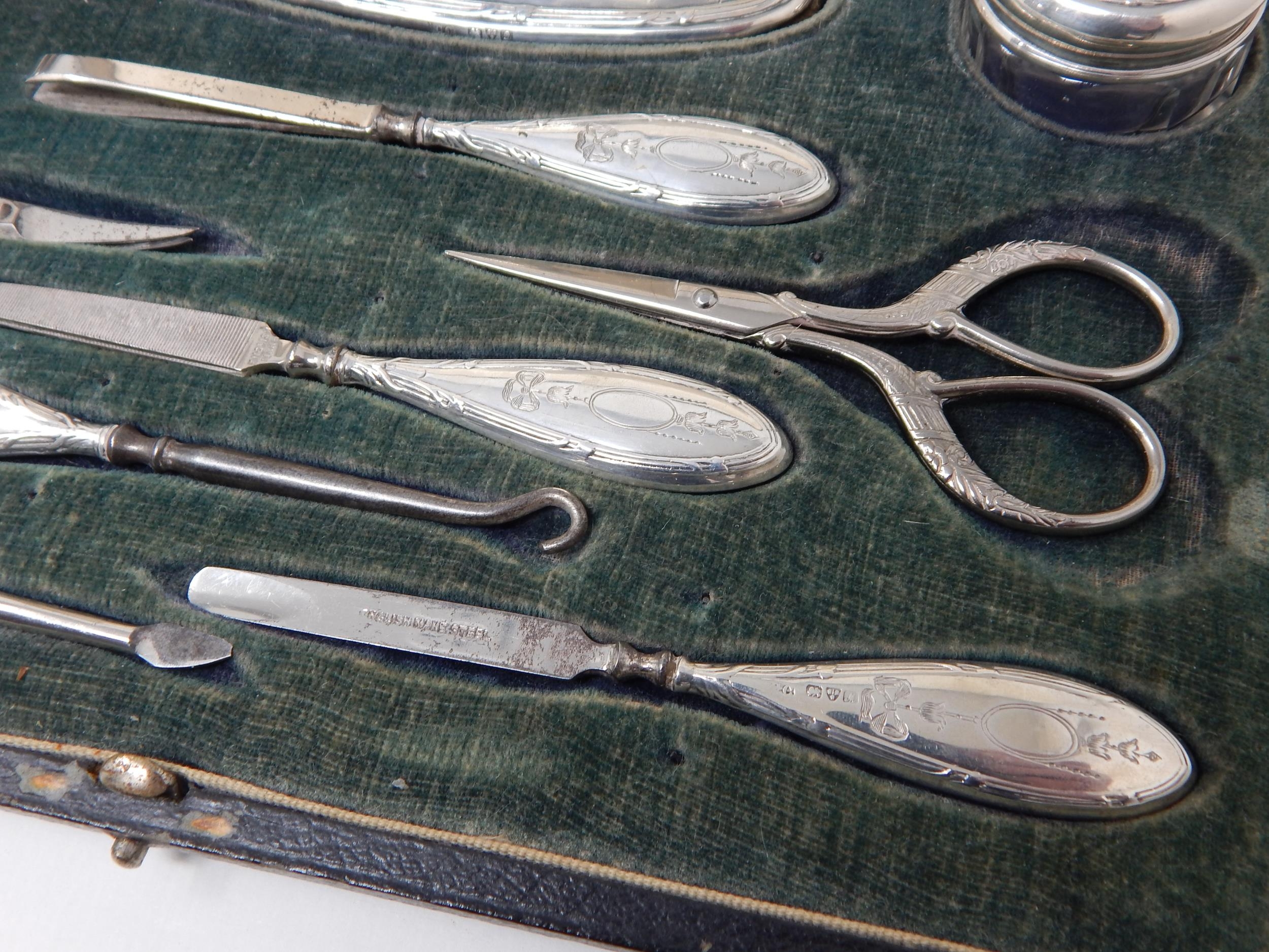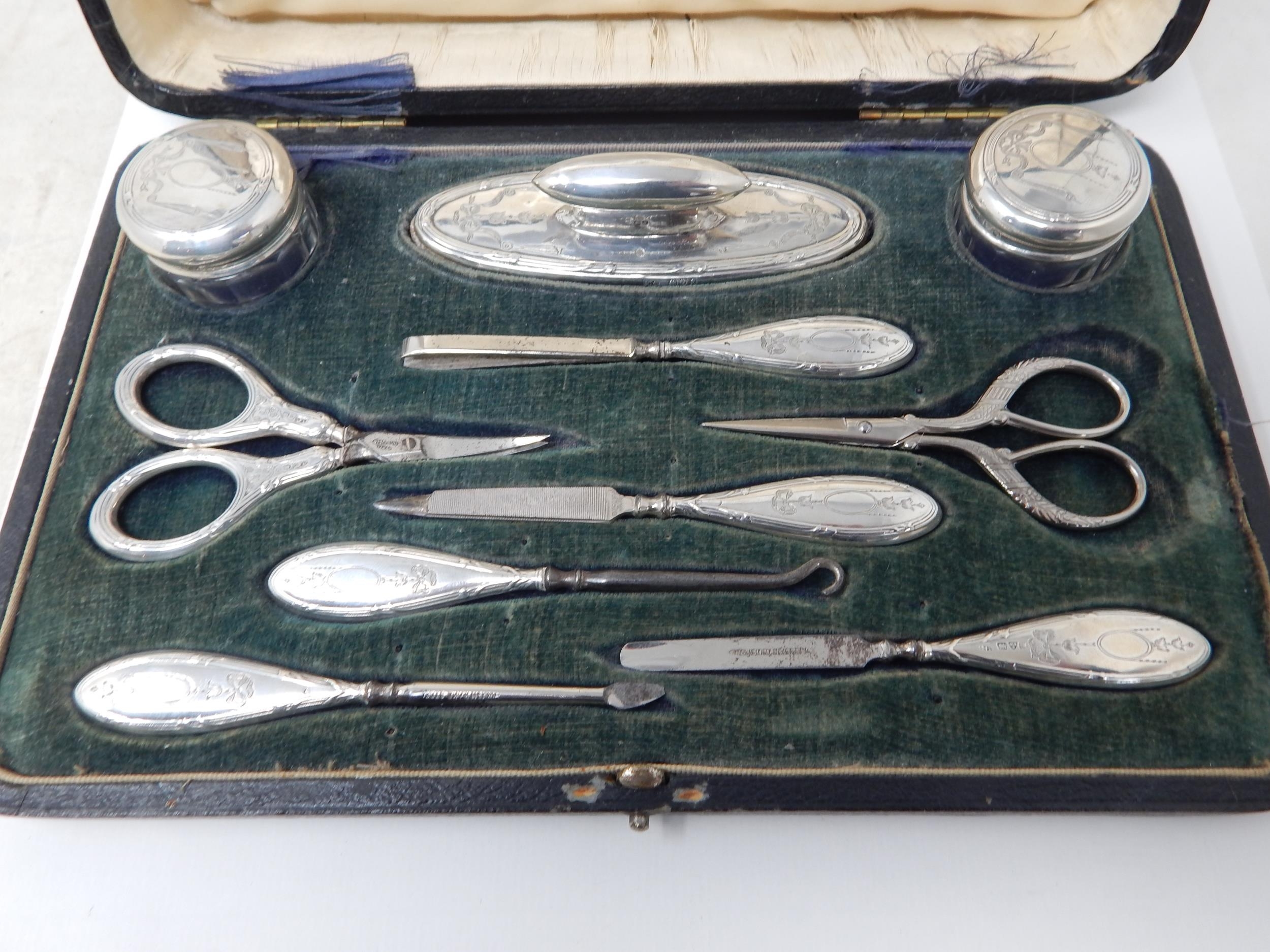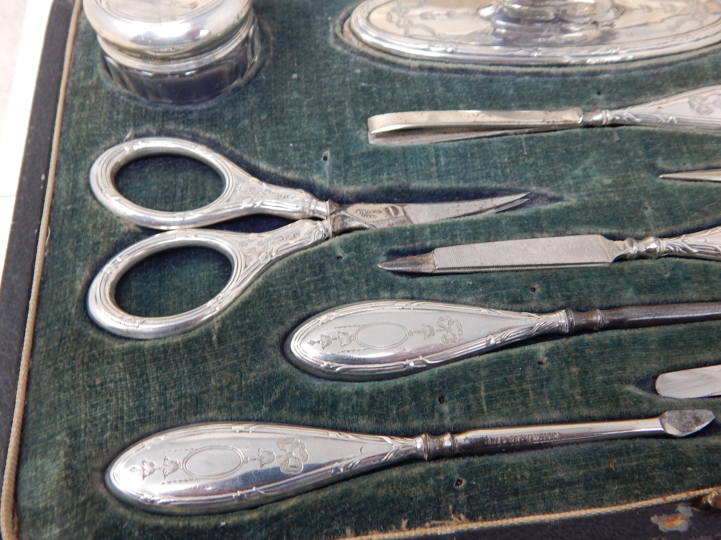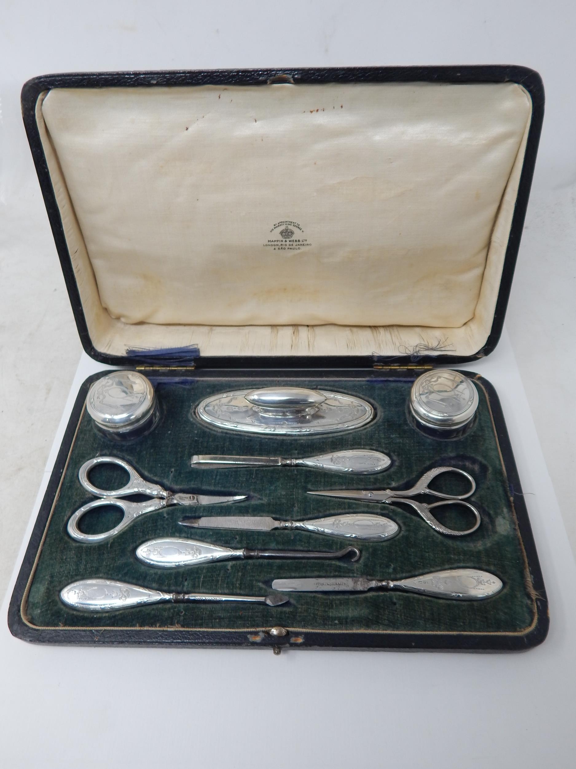 Antique Silver Mounted Ten Piece Manicure Set Comprising Rouge Pots, Buffer, Scissors etc in Original Fitted Case: Hallmarked Chester 1912 by Colen Cheshire & Retailed by Mappin & Webb