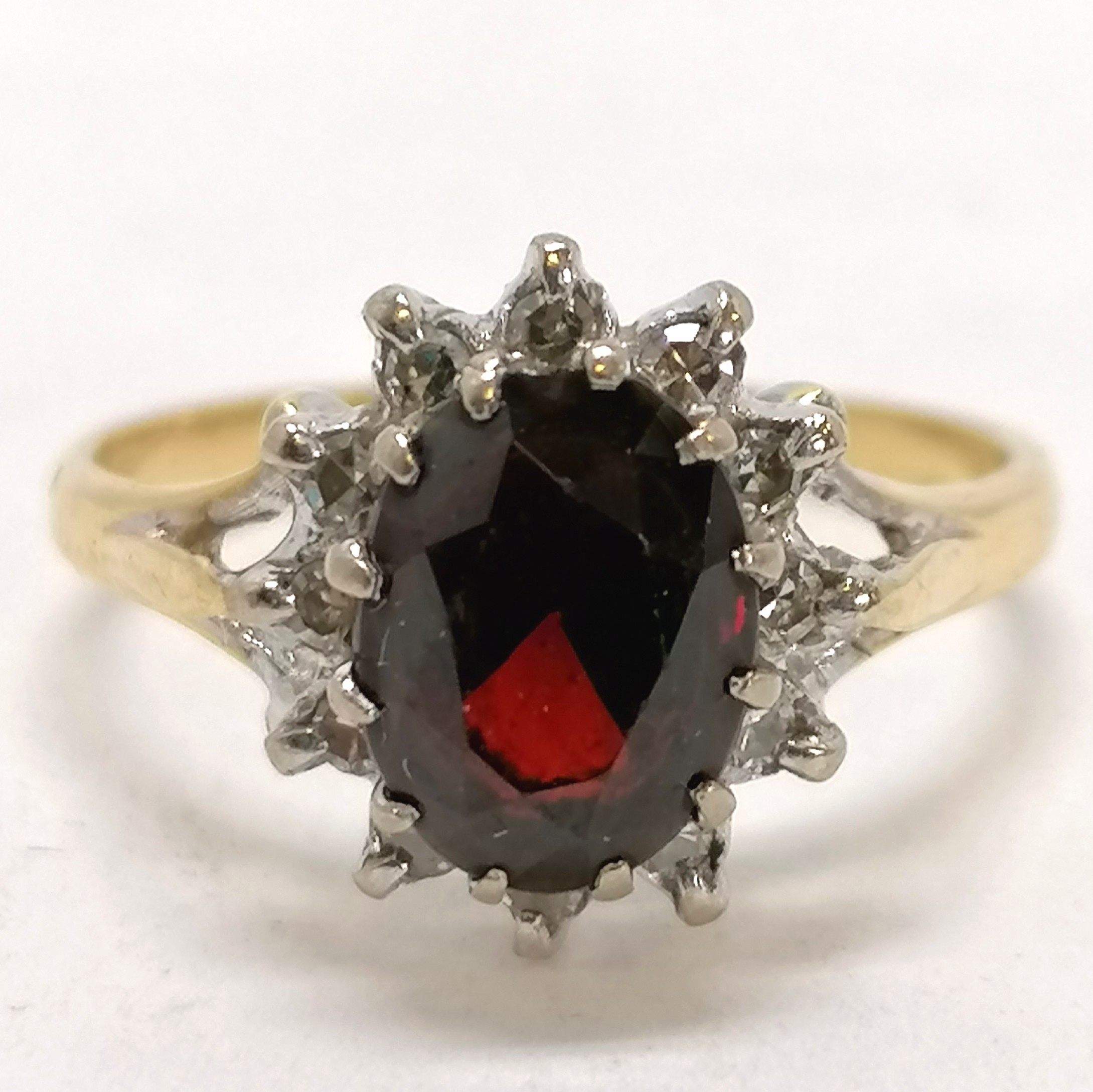 18ct marked gold garnet & diamond cluster ring - size N & 3.8g total weight