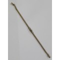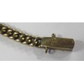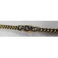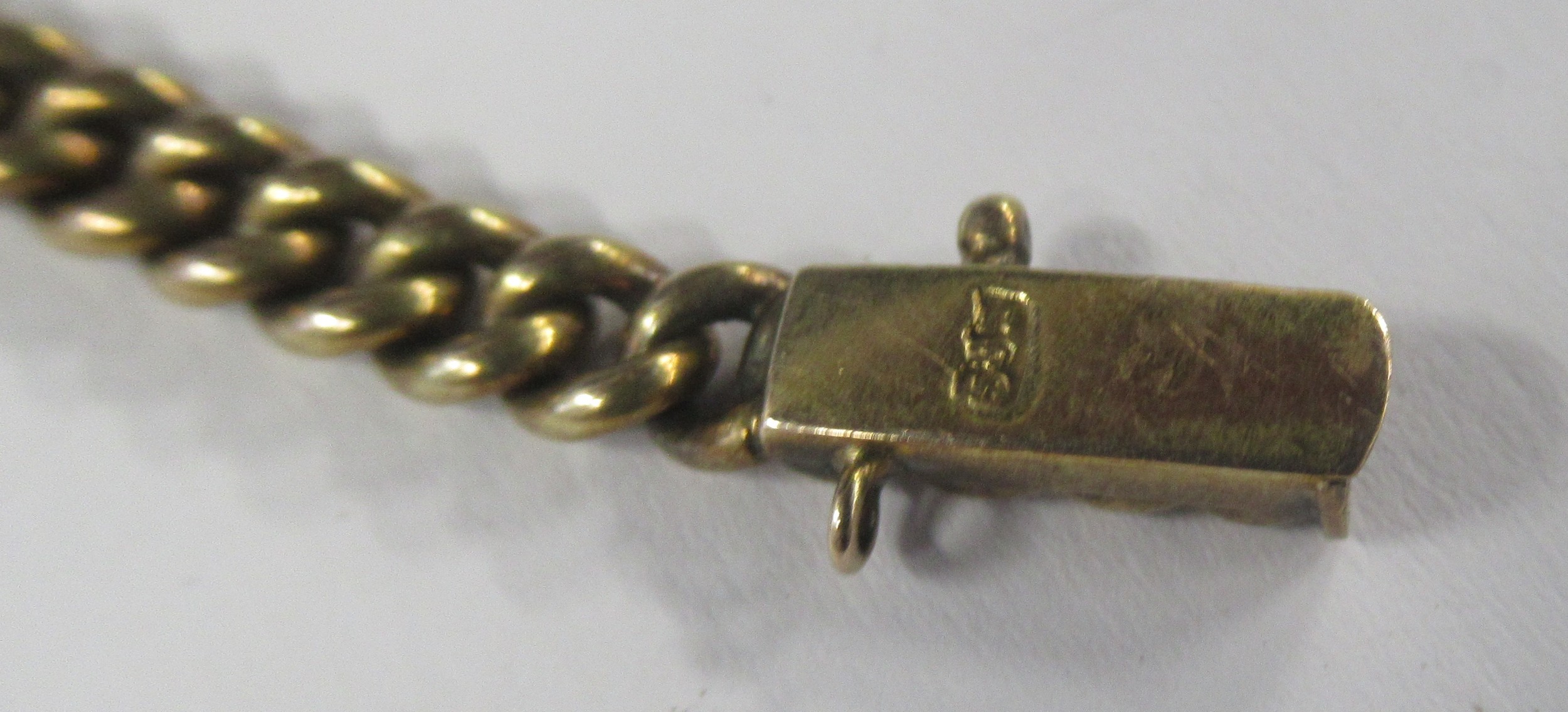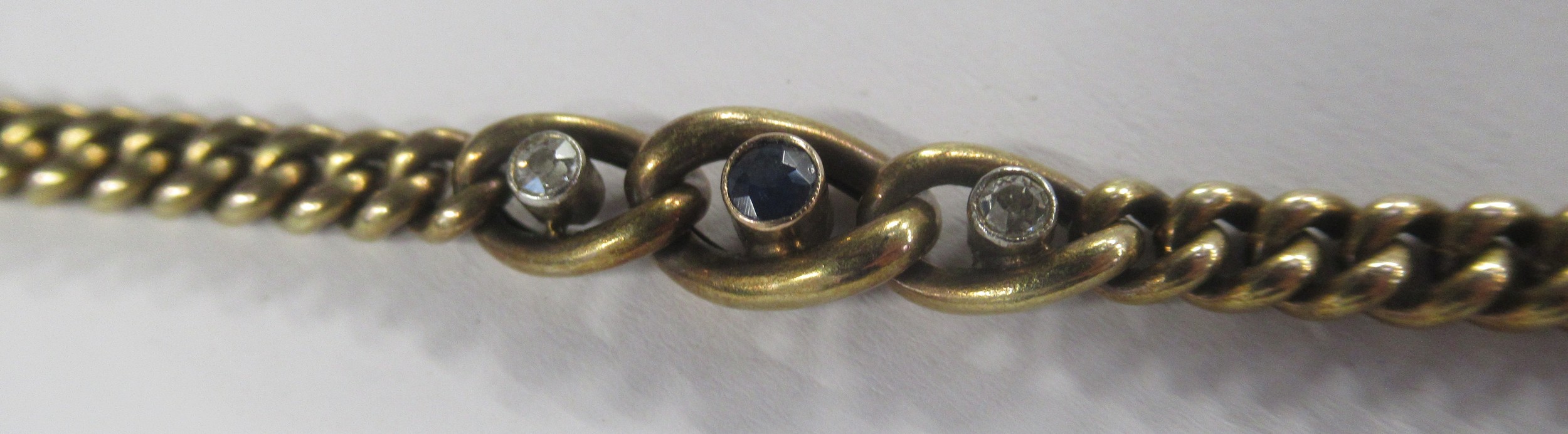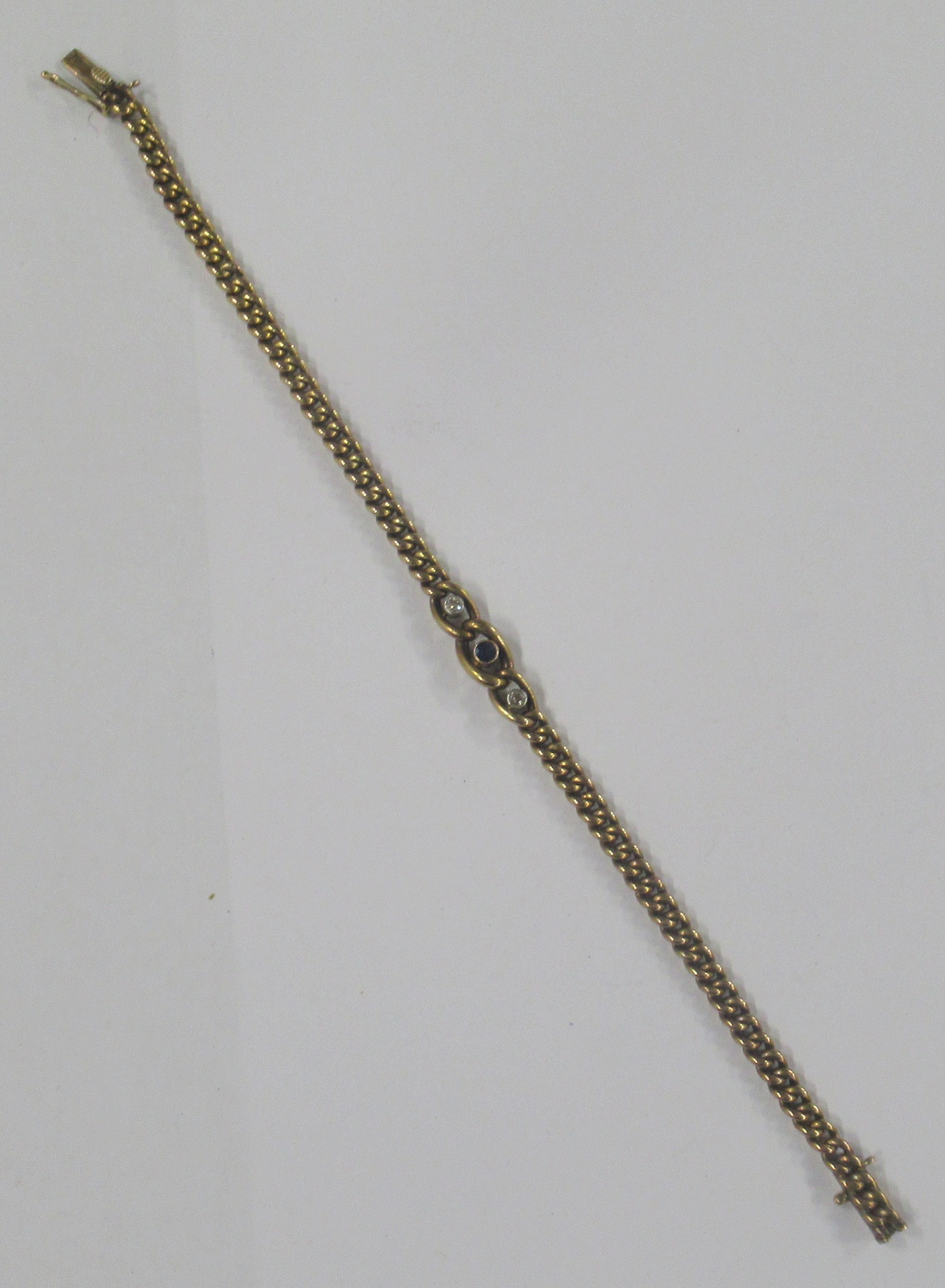 A 14ct gold curb link bracelet, rub over set with a round cut sapphire flanked by two old cut diamonds, est. total diamond weight 0.10ct, stamped '585', weight 5.1g