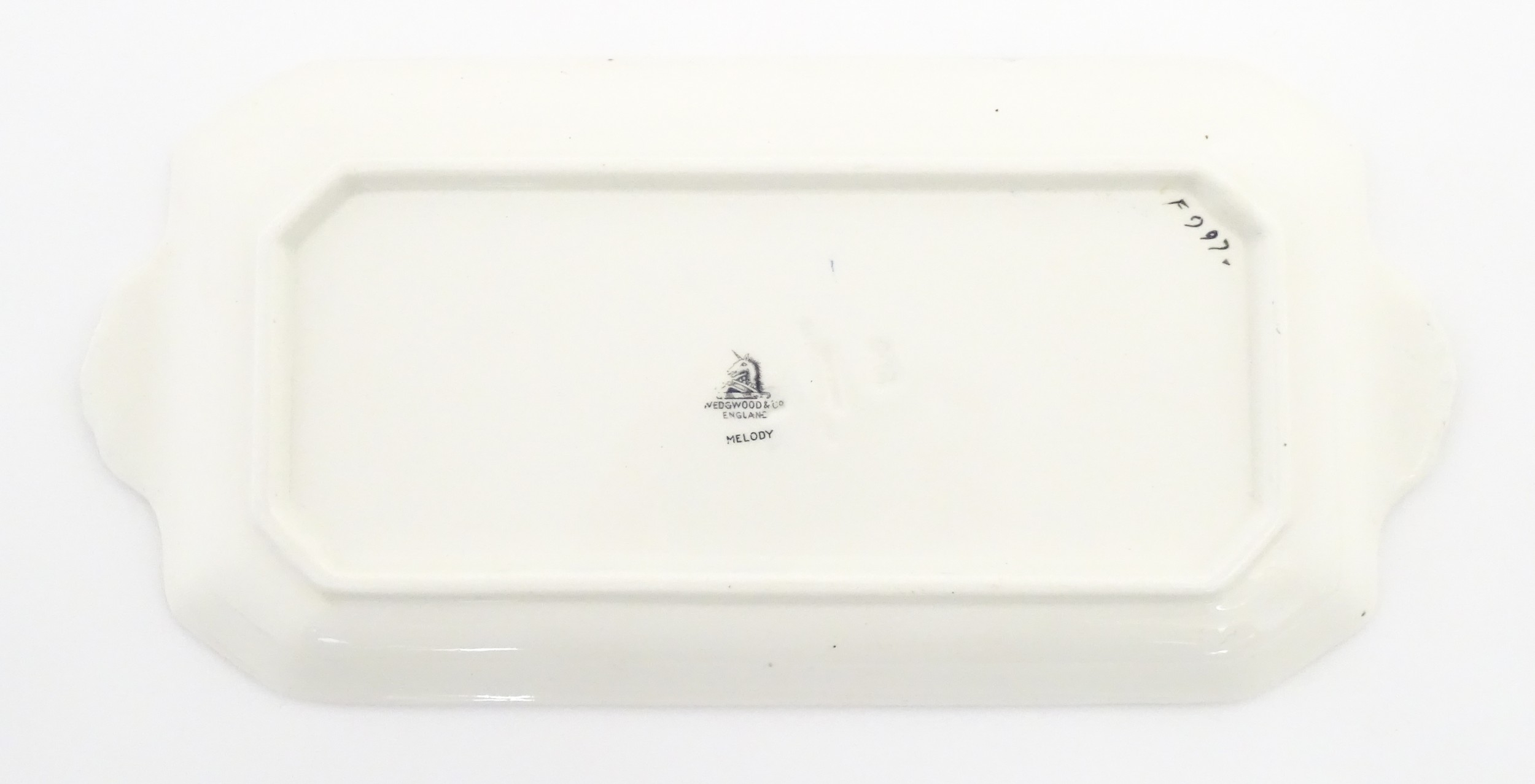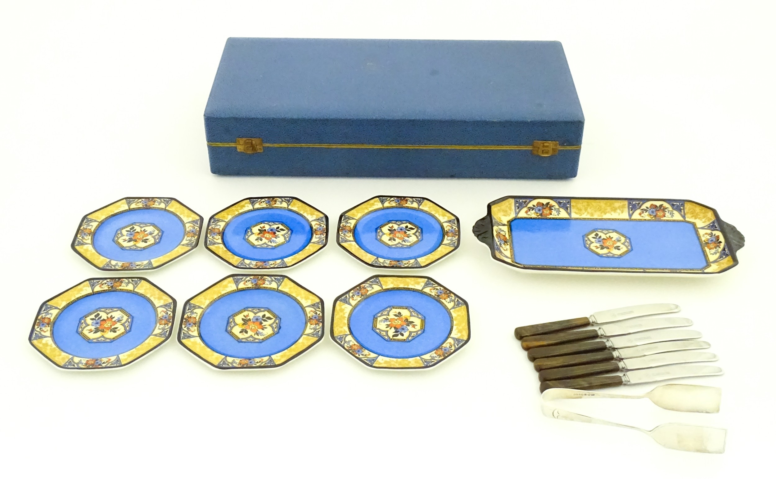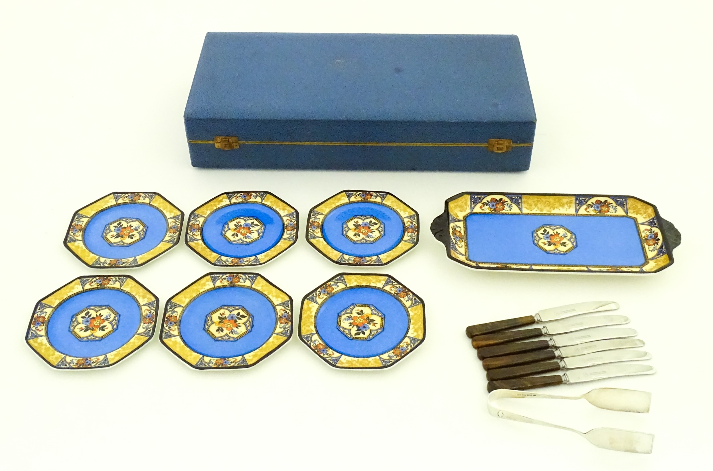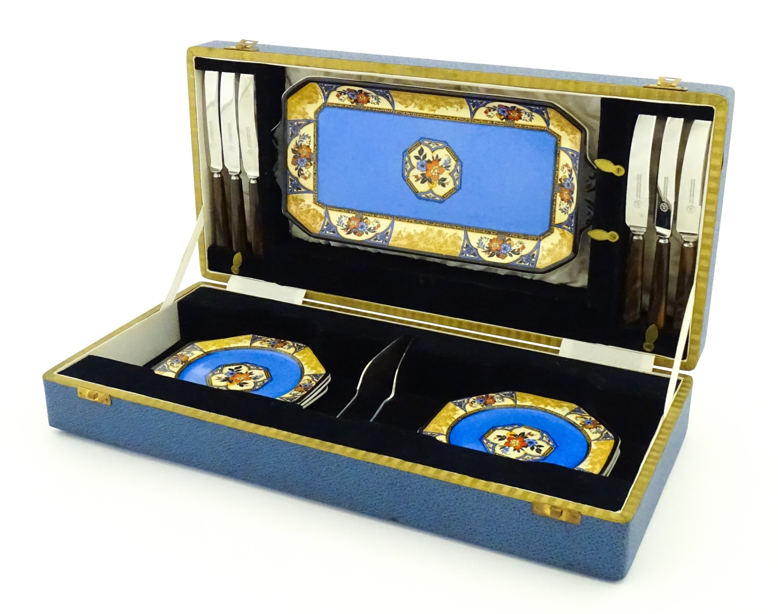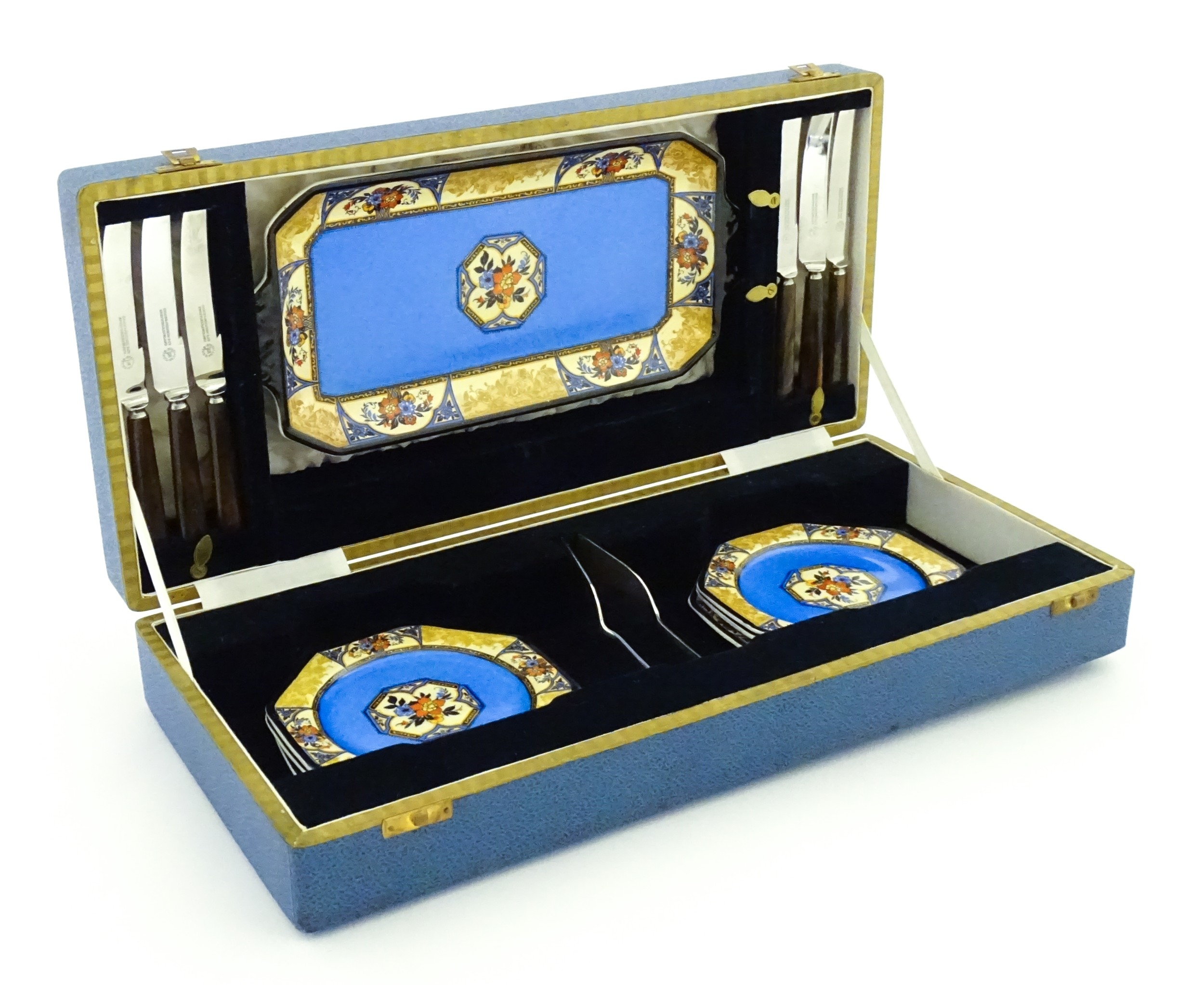 A cased Wedgwood cake / sandwich service in the Melody pattern comprising serving plate, cake plates, knives and silver plate serving tongs. Case approx. 17 3/4" wide