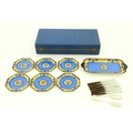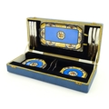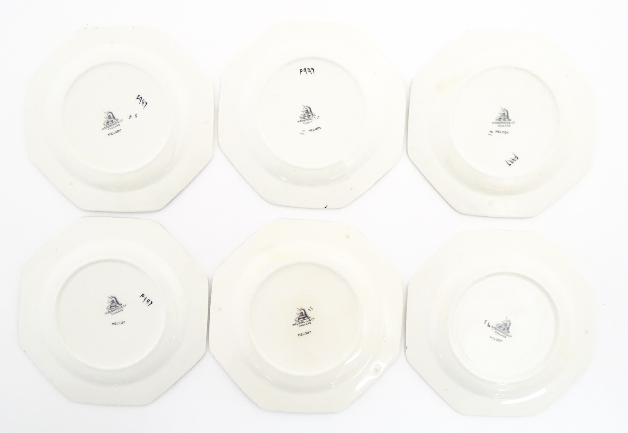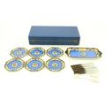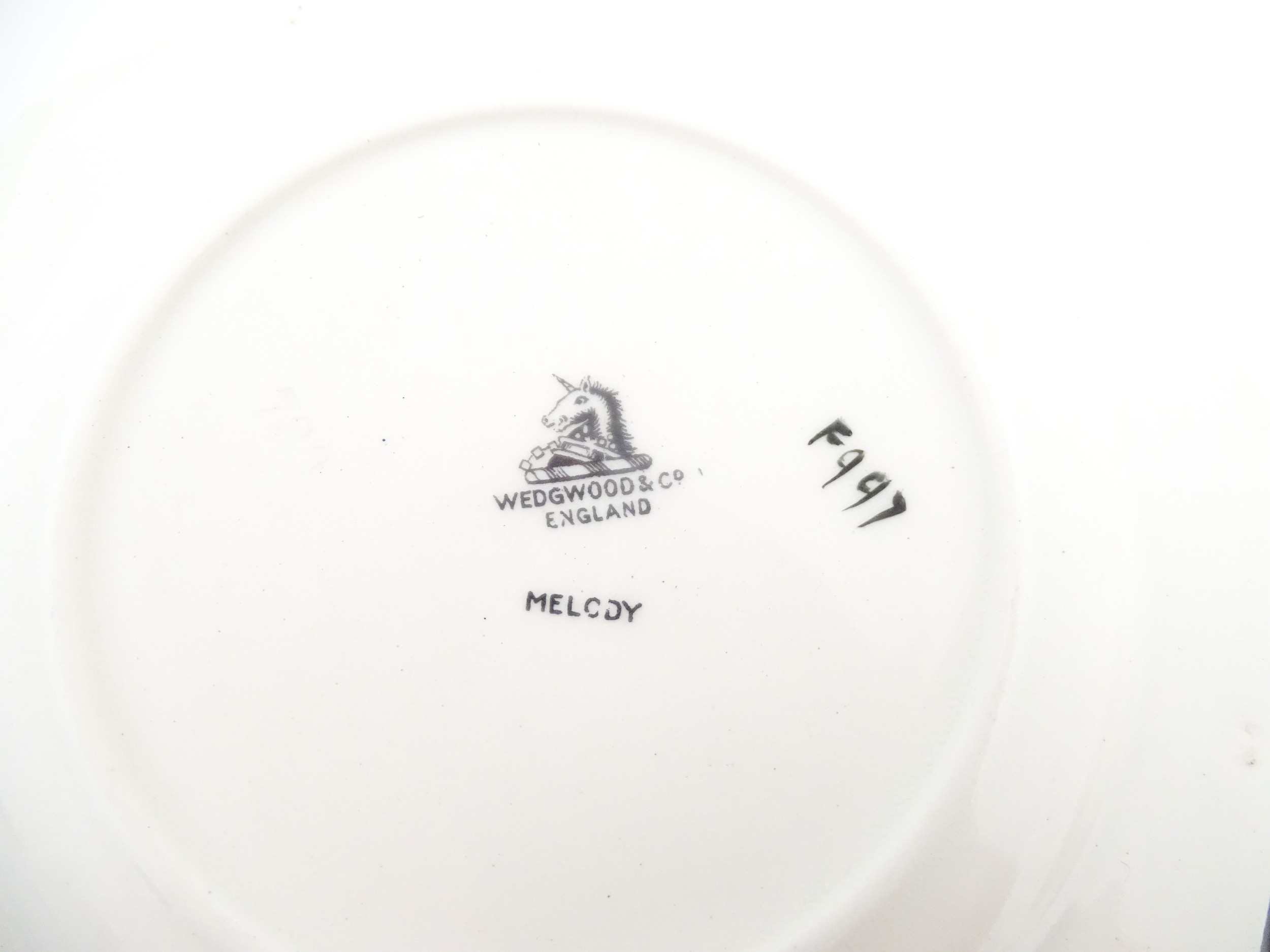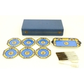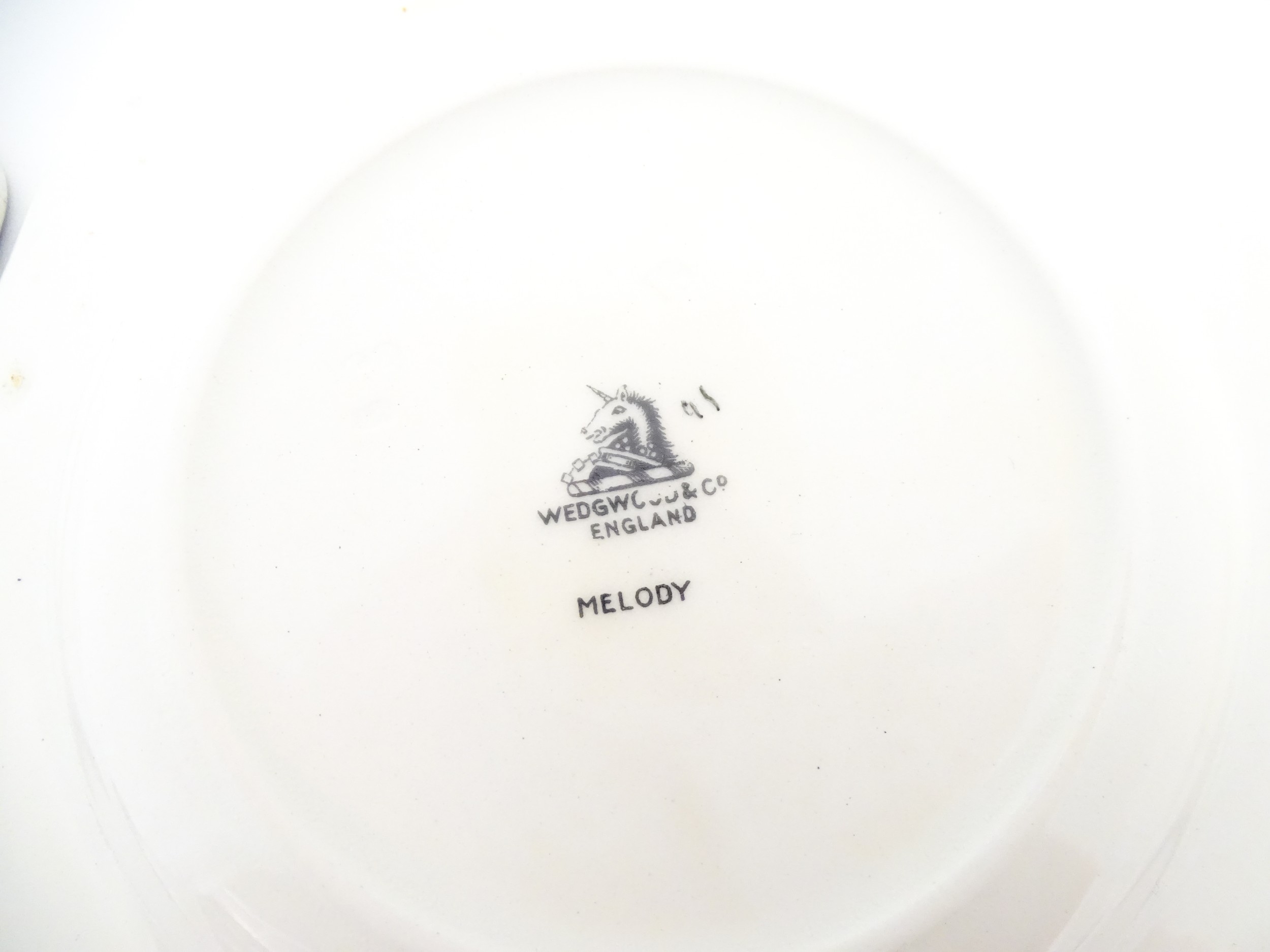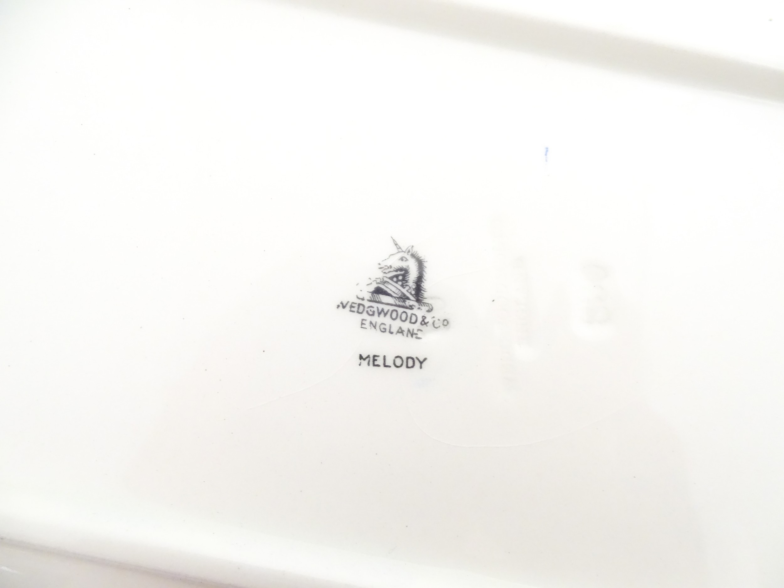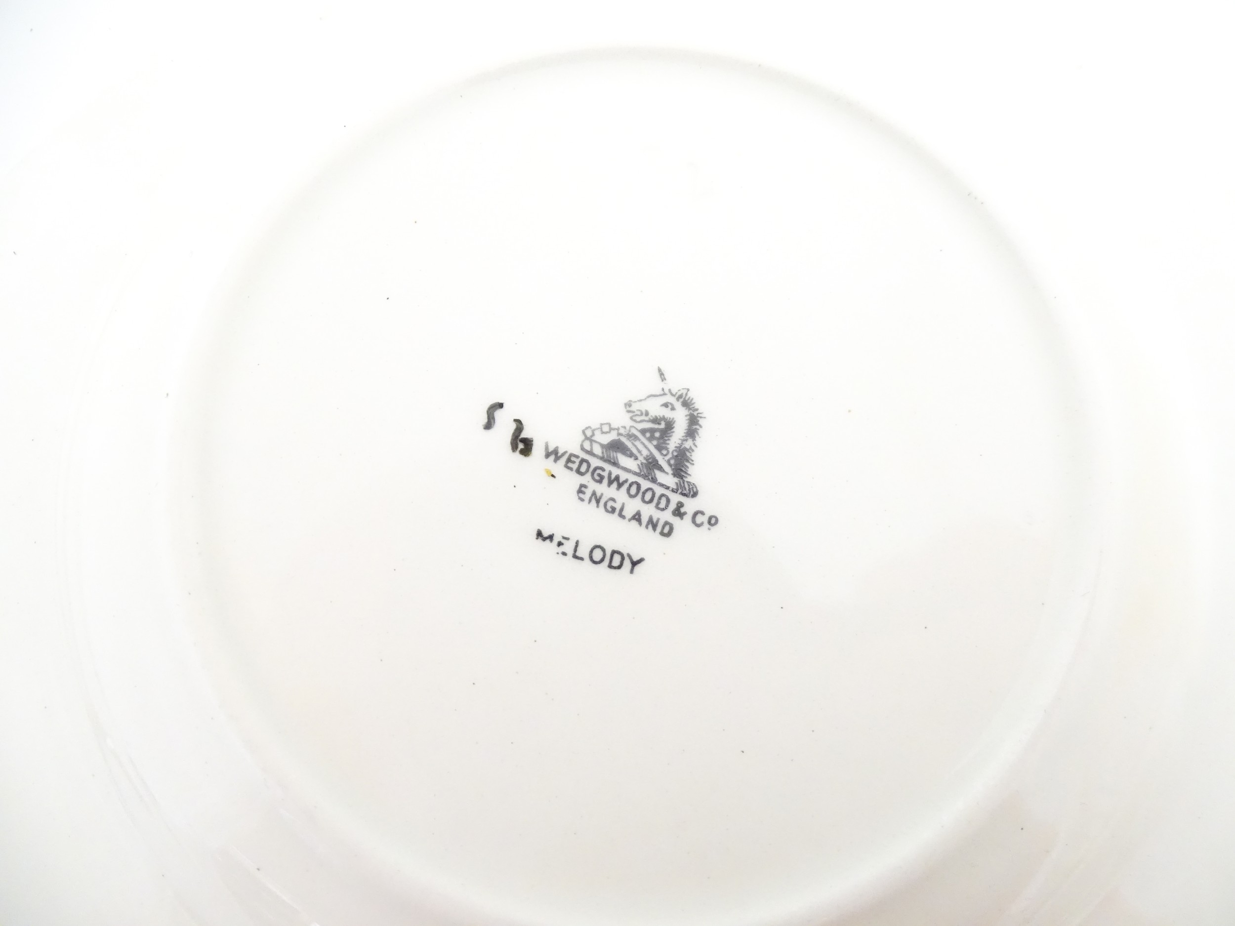 A cased Wedgwood cake / sandwich service in the Melody pattern comprising serving plate, cake plates, knives and silver plate serving tongs. Case approx. 17 3/4" wide