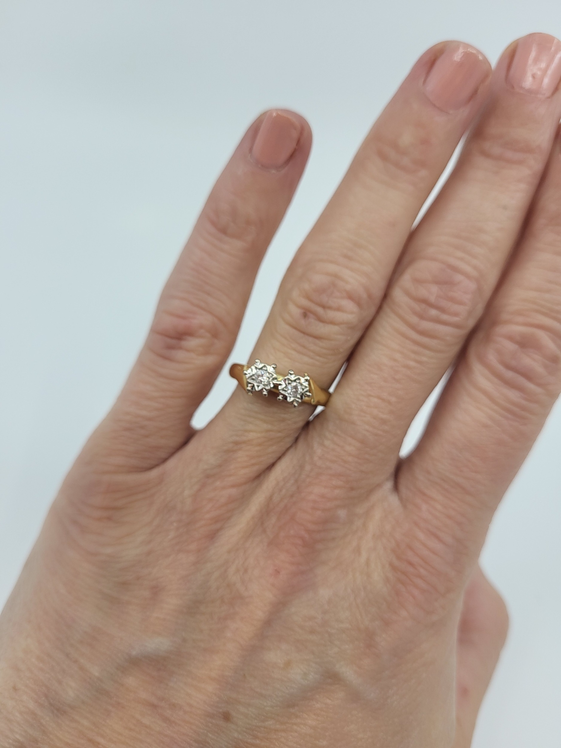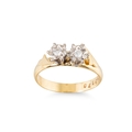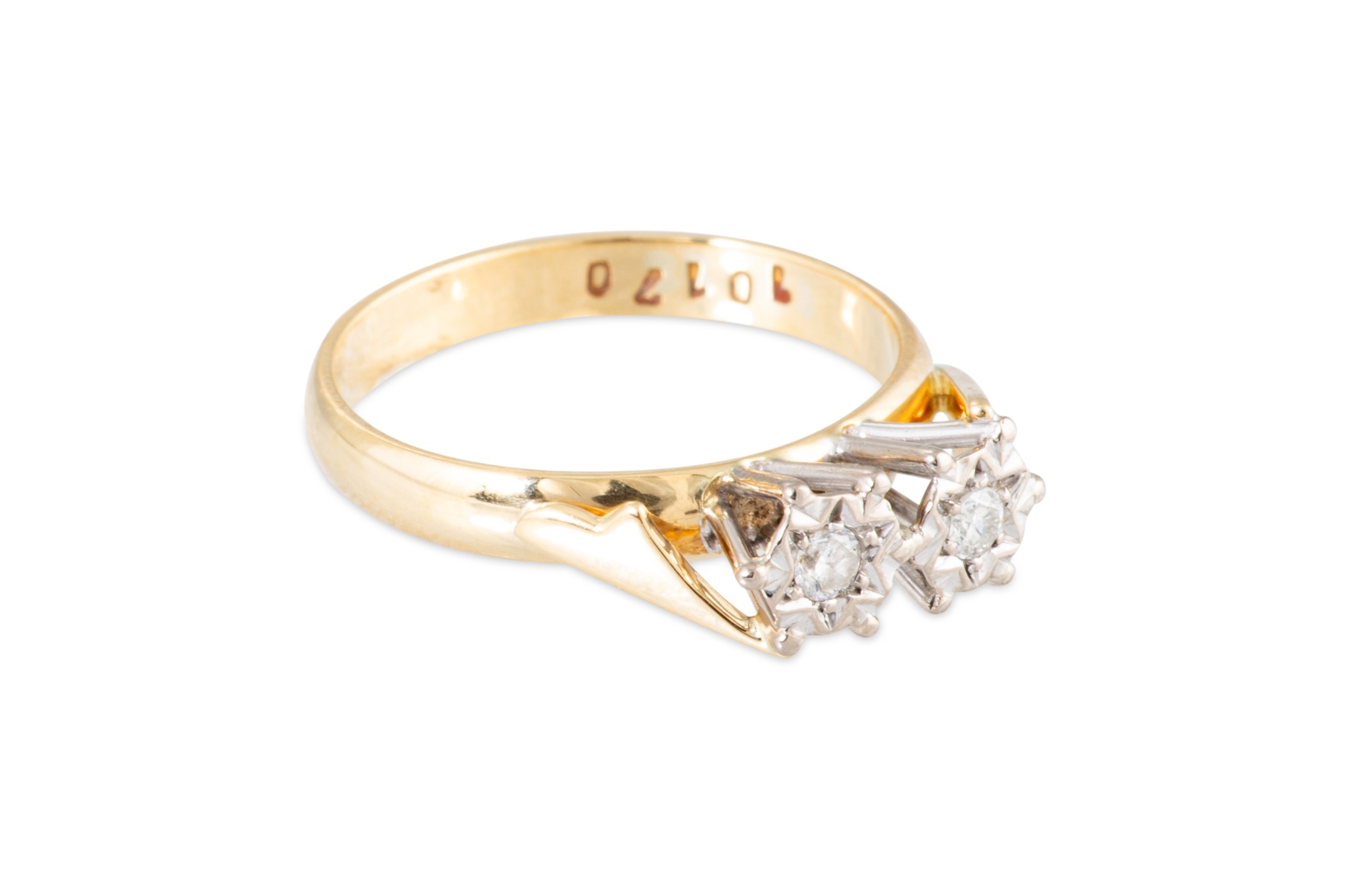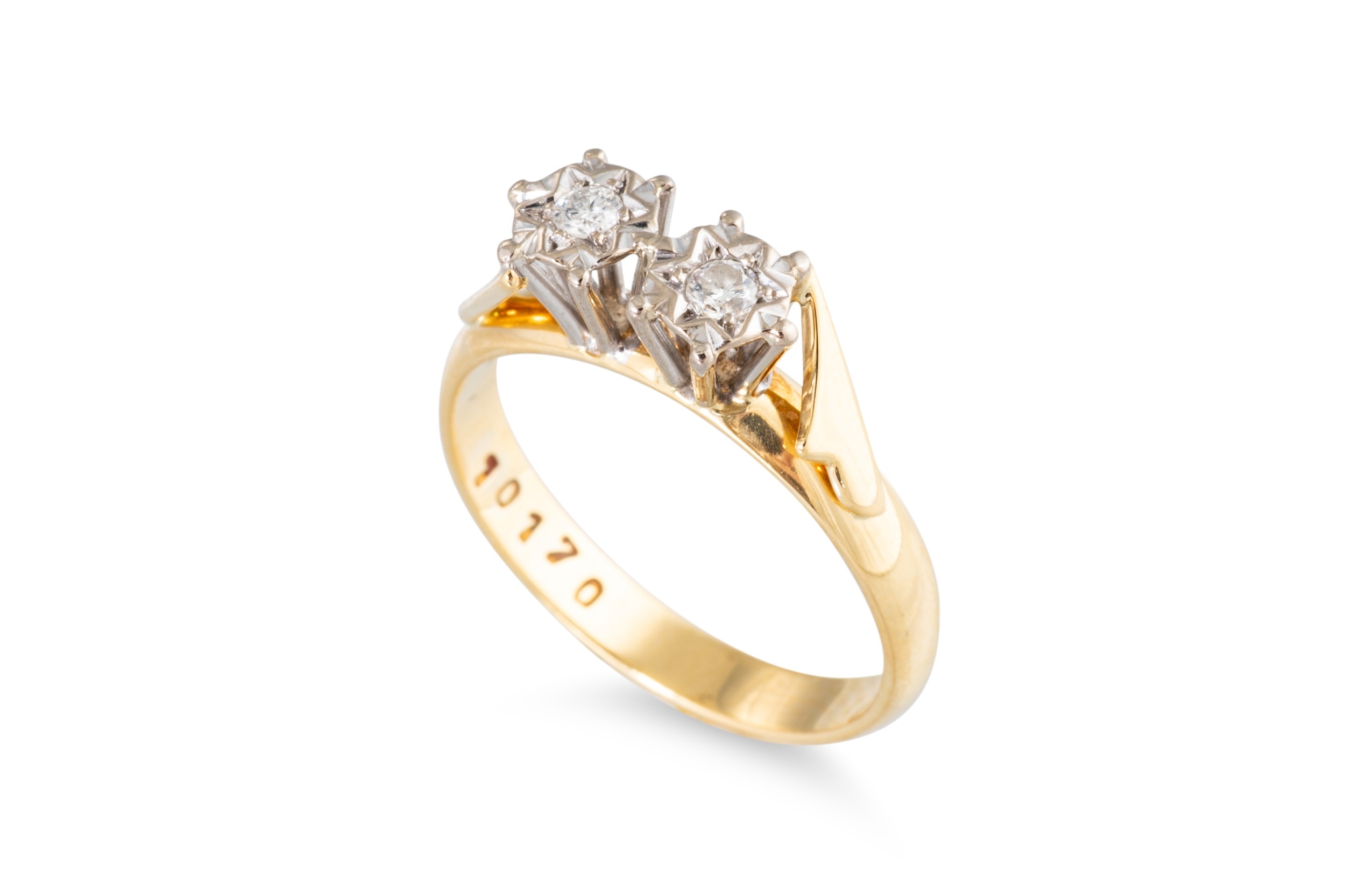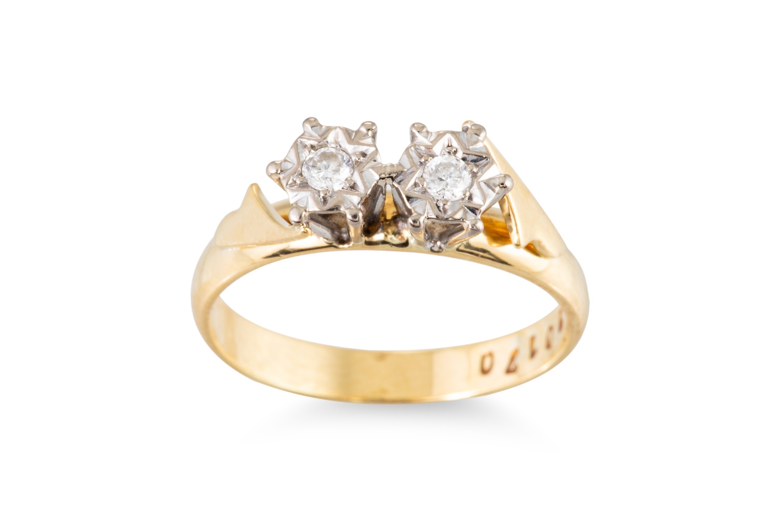 AN IRISH DIAMOND TWO-STONE DRESS RING, high illusion setting, mounted in 18ct yellow gold, by O'Connors, Dublin hallmark, size O