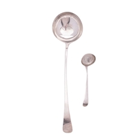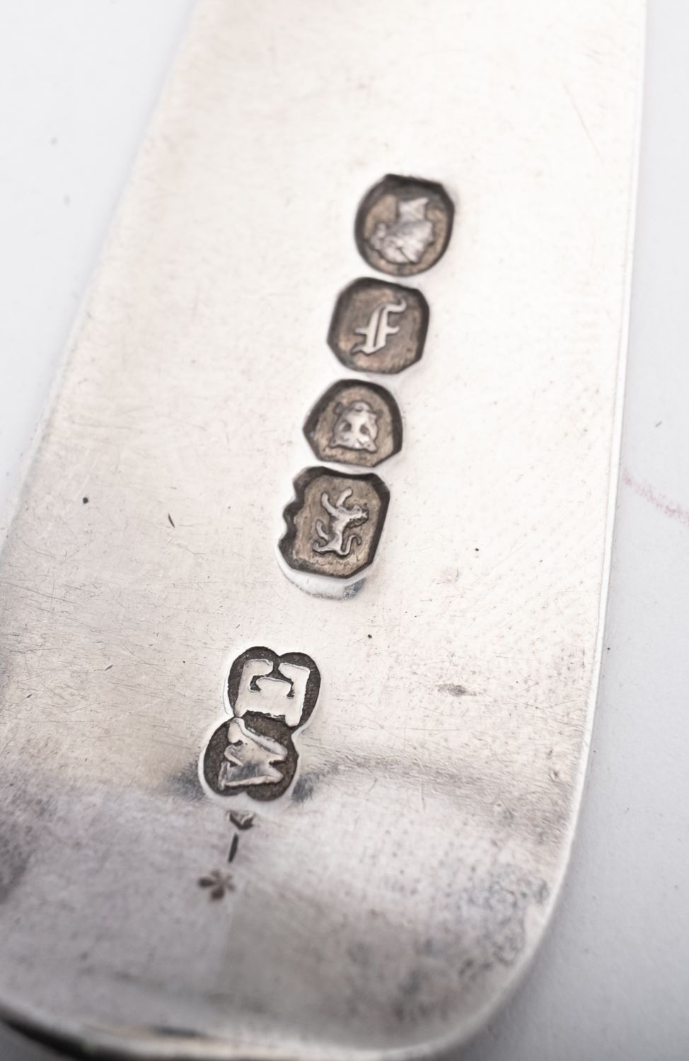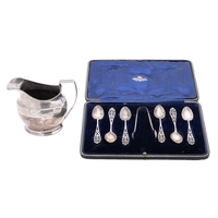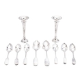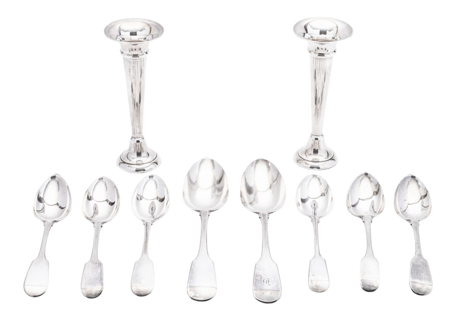 A small group of Fiddle pattern silver flatware, 2 tablespoons (one initialled) & 6 dessert spoons, mixed makers & dates, together with a pair of modern silver spill vases (loaded); the vases 6'' (15.2cm) high; 12.25ozt (10)