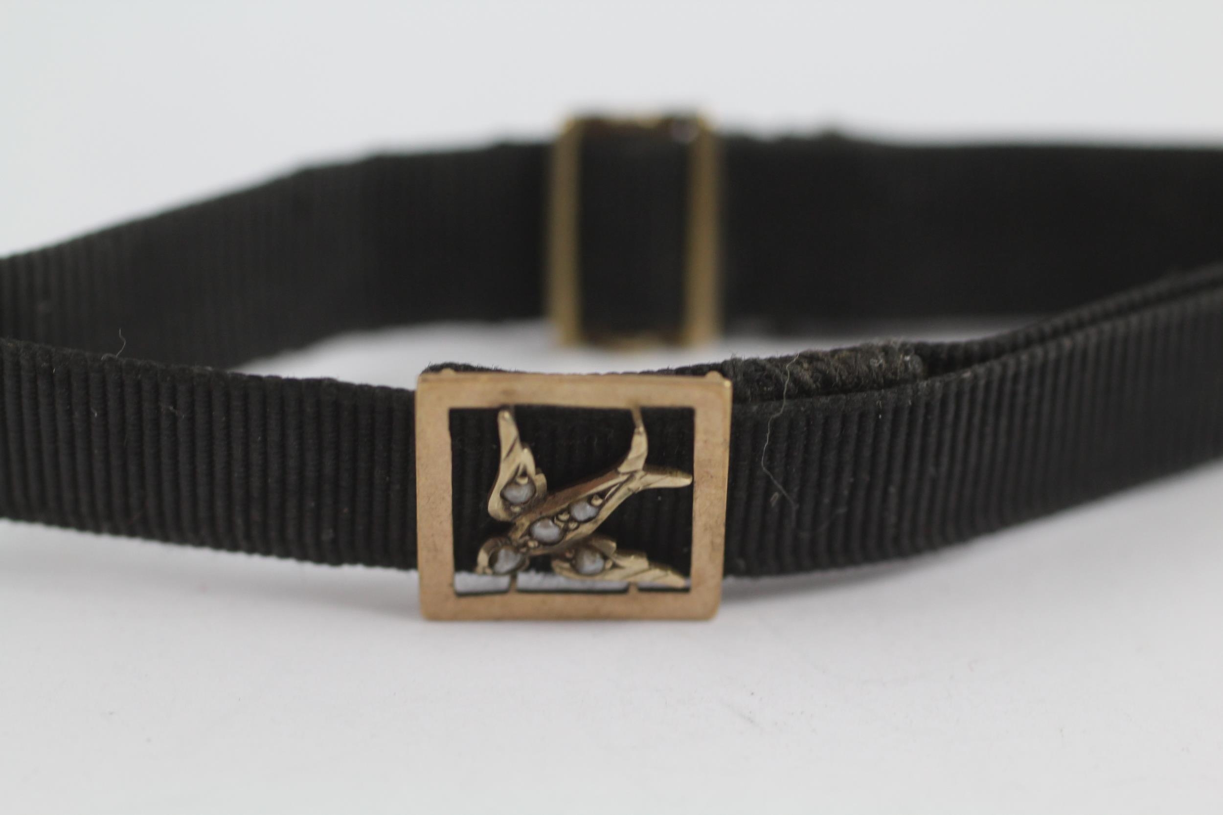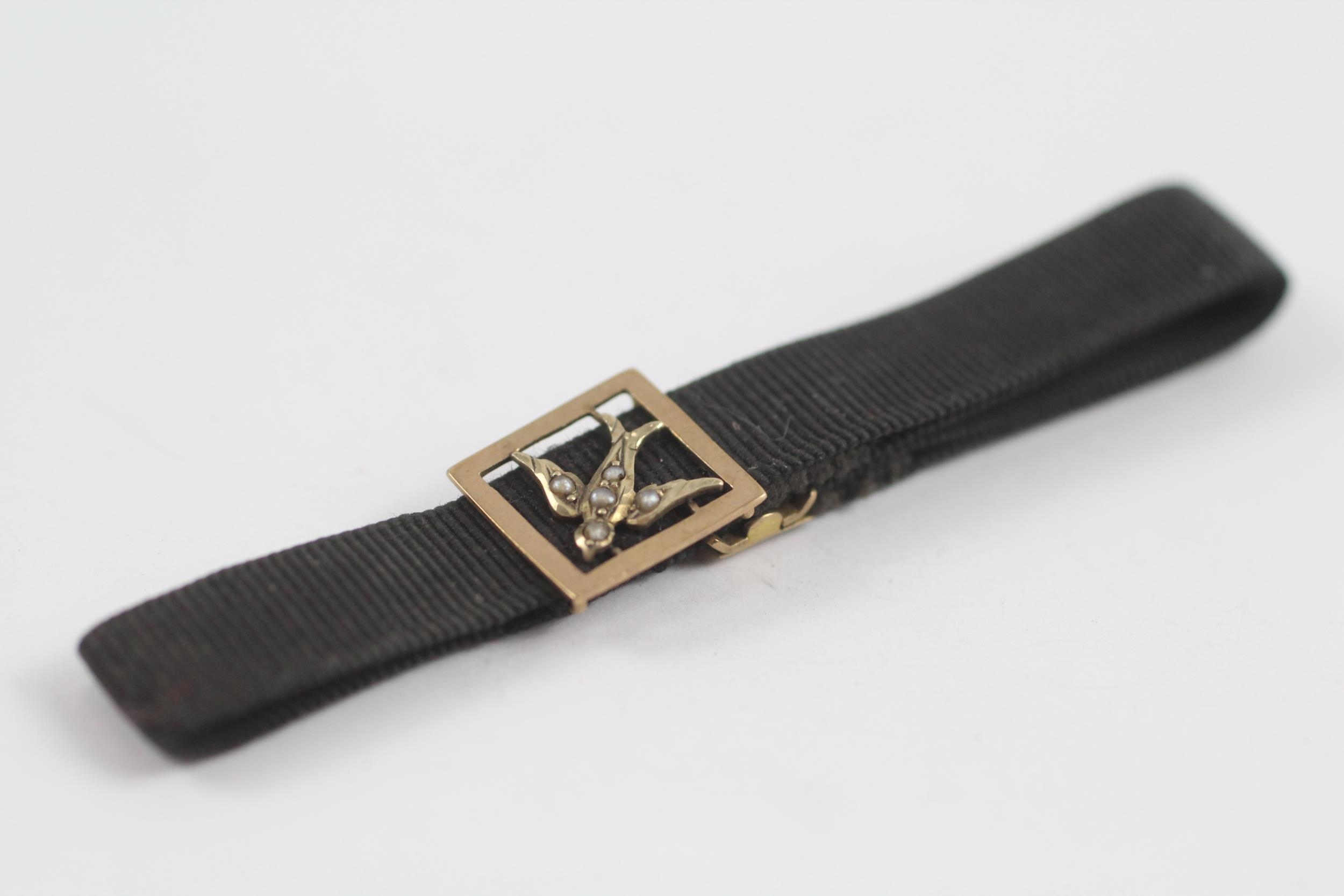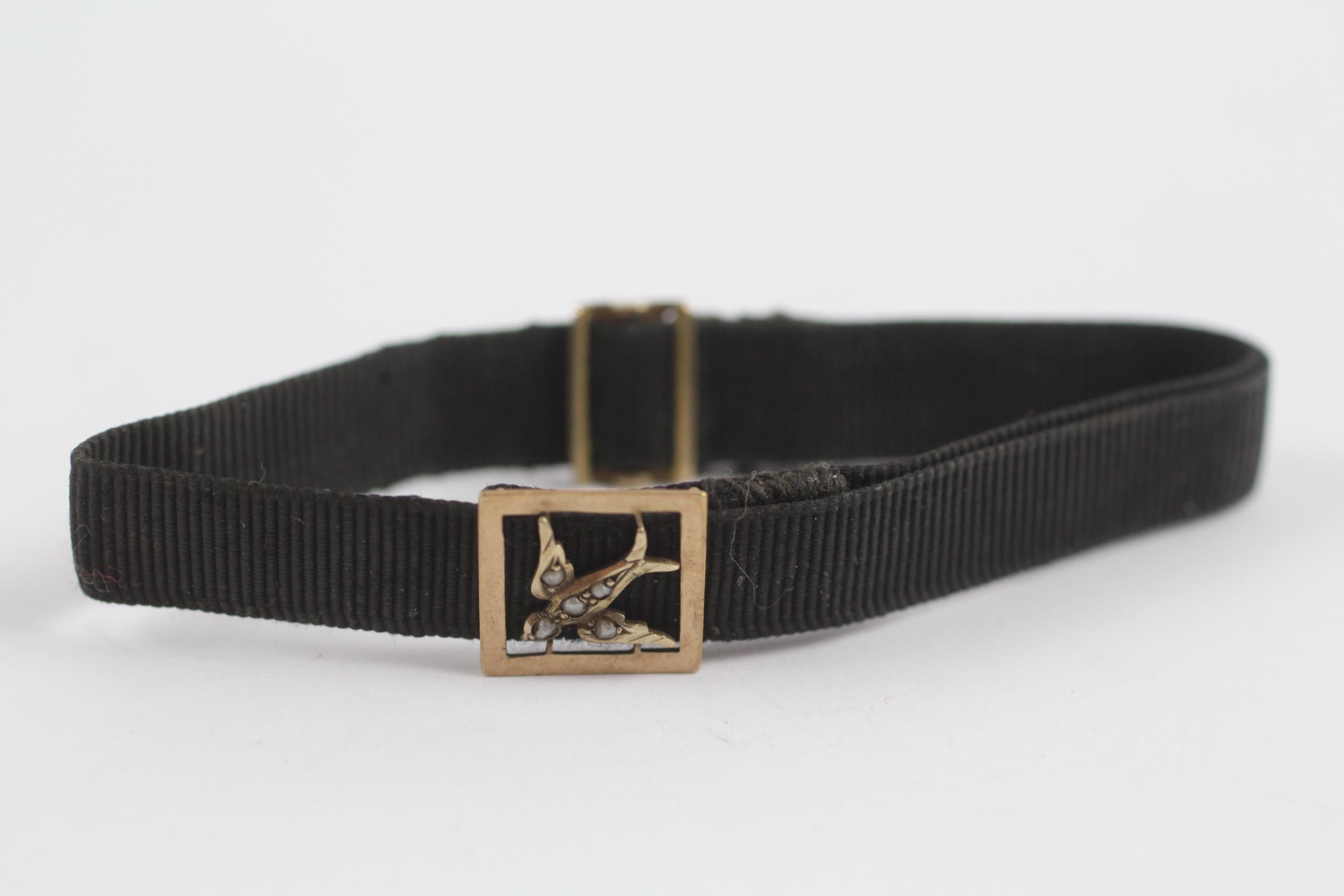 9ct Gold Victorian Seed Pearl Set Swallow Slider Pendant And Clasp On A Grossgrain Bracelet (2.6g)