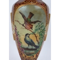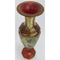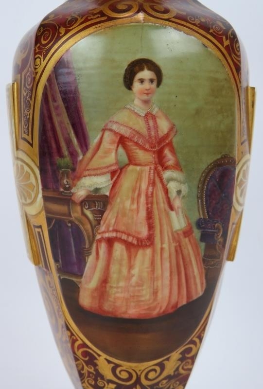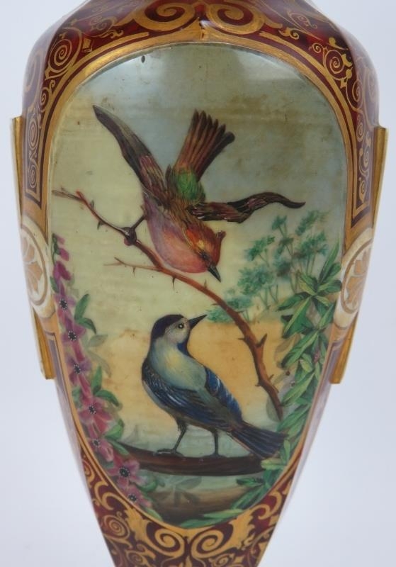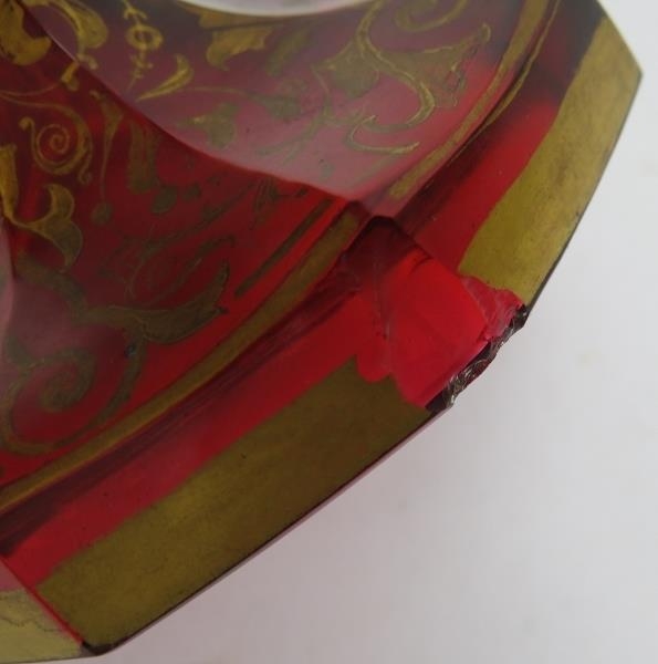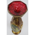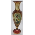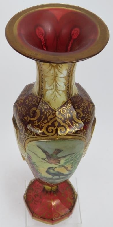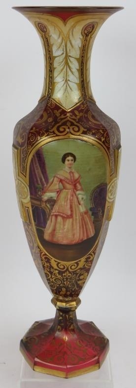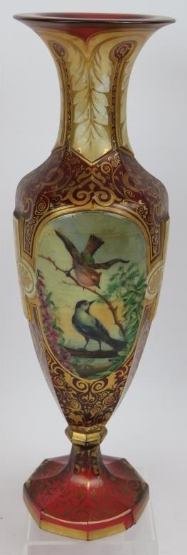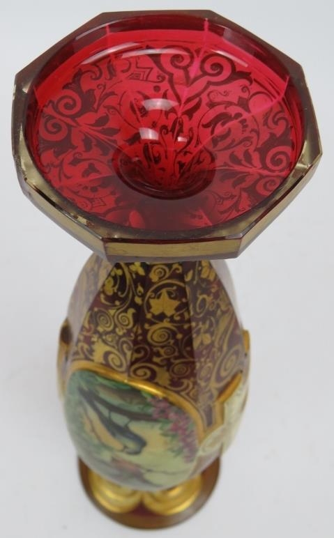 A fine 19th century hand decorated and gilded Bohemian cranberry glass vase featuring hand painted panels of a lady and two birds. Height 32cm.