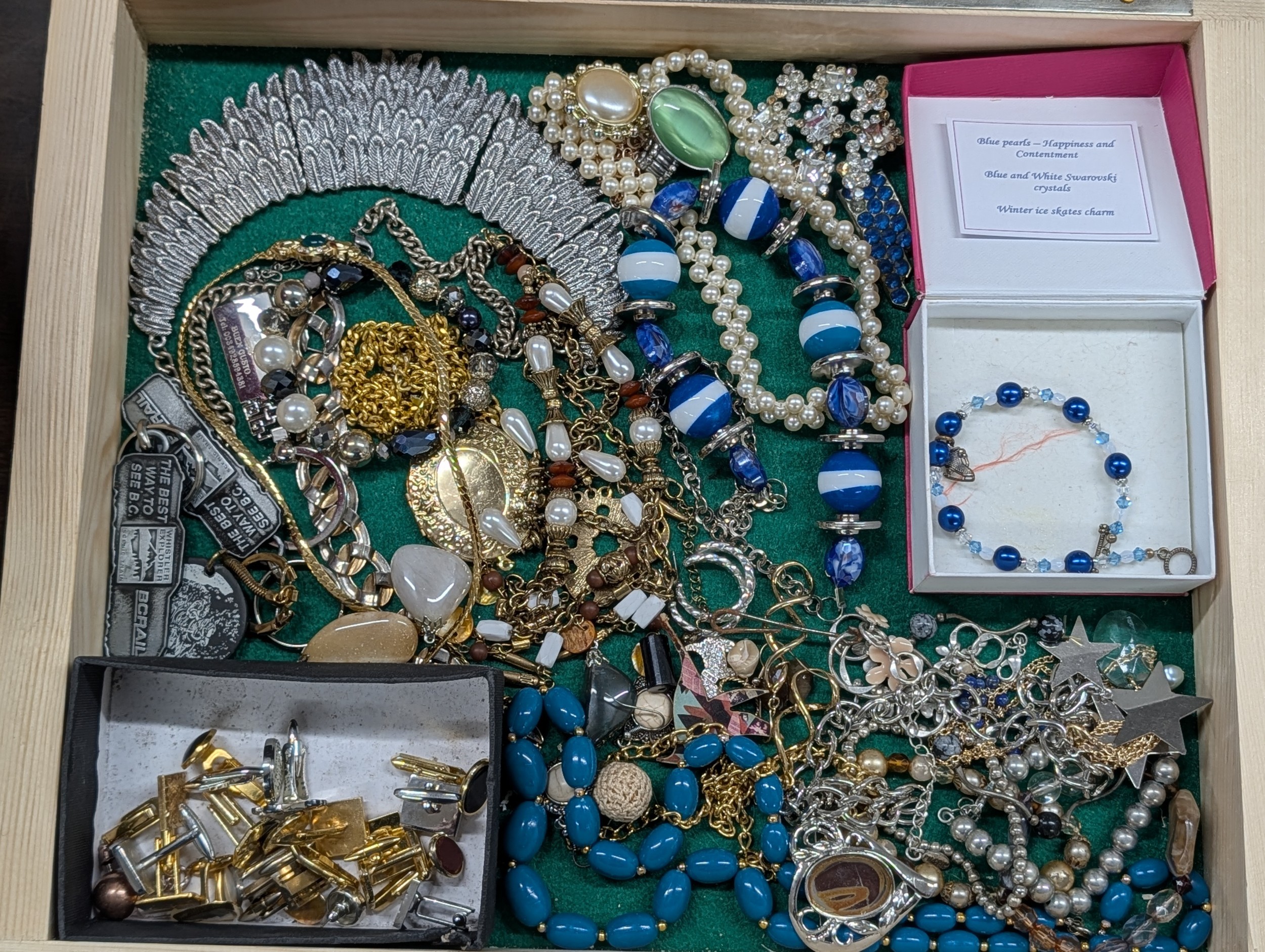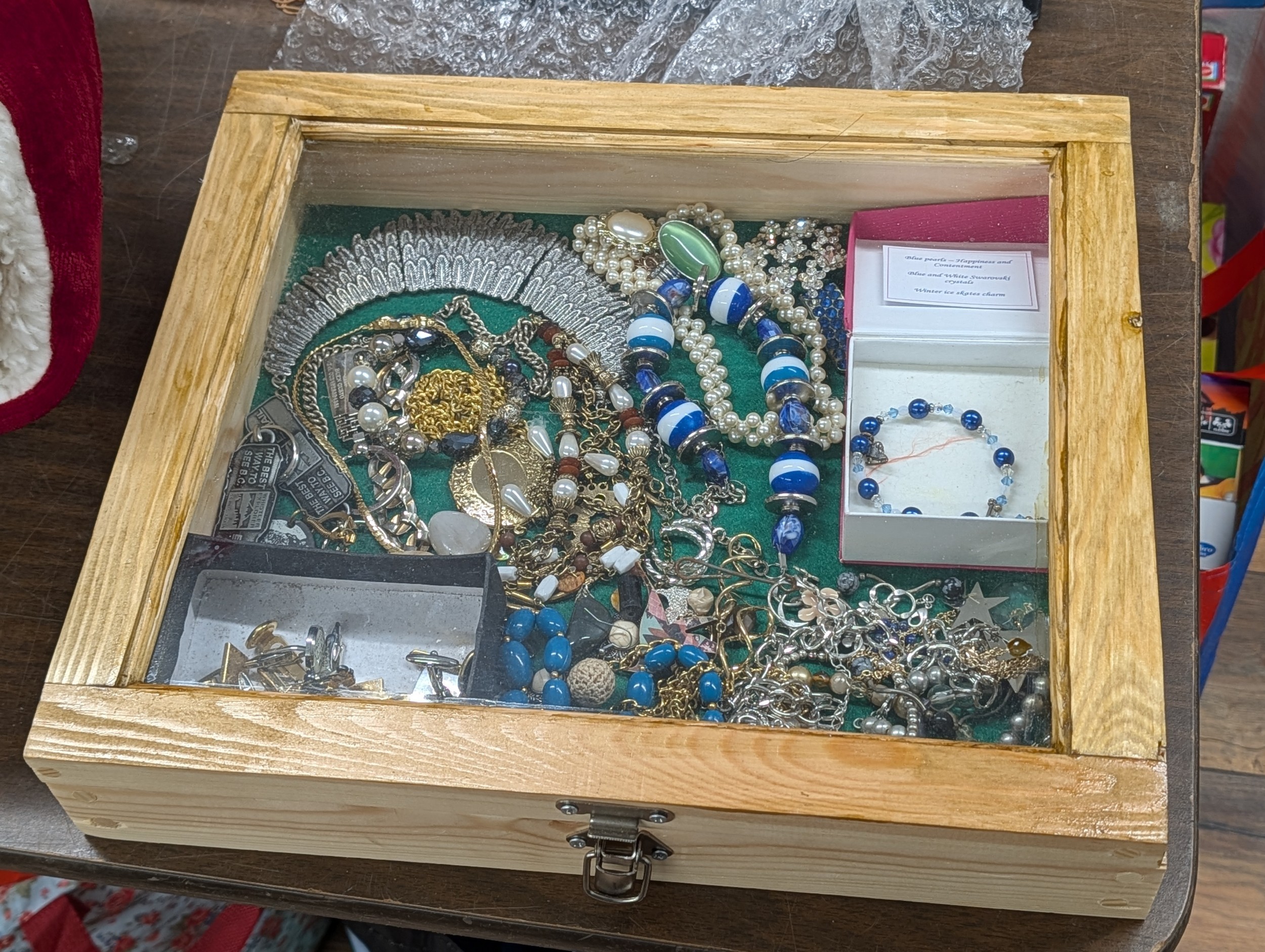 Assortment of Costume Jewellery and Accessories in Wooden Counter Top Display Show Case