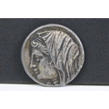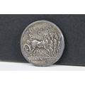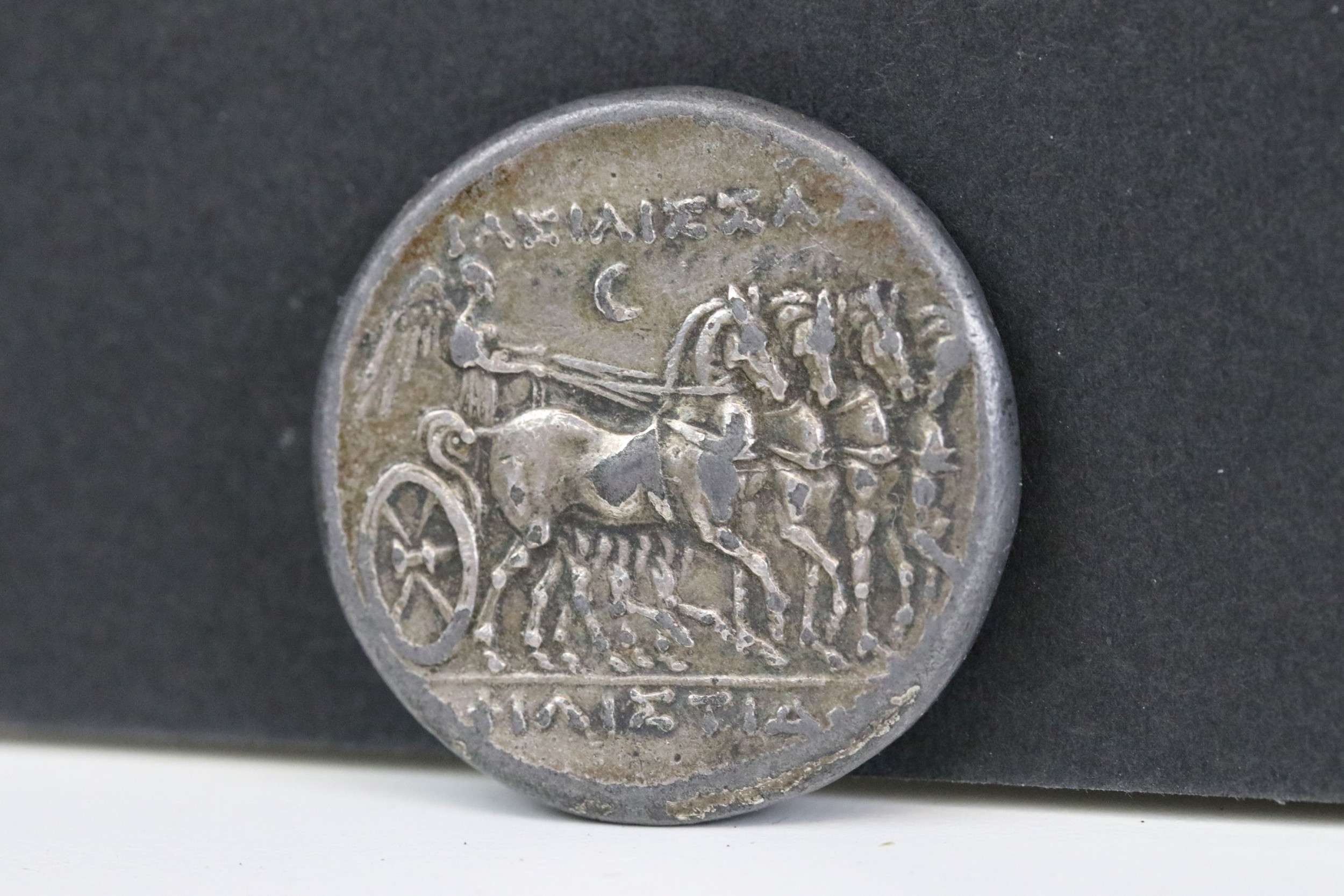 An ancient Greek 16 Litrai Philistis King Hieron II hammered silver coin, c.275BC - c.215BC, obverse Diademed and veiled bust of Philistis to left, reverse Nike driving quadriga moving slowly to right. Above, eight-pointed star and to right, Κ., minted Syracuse, Italy.