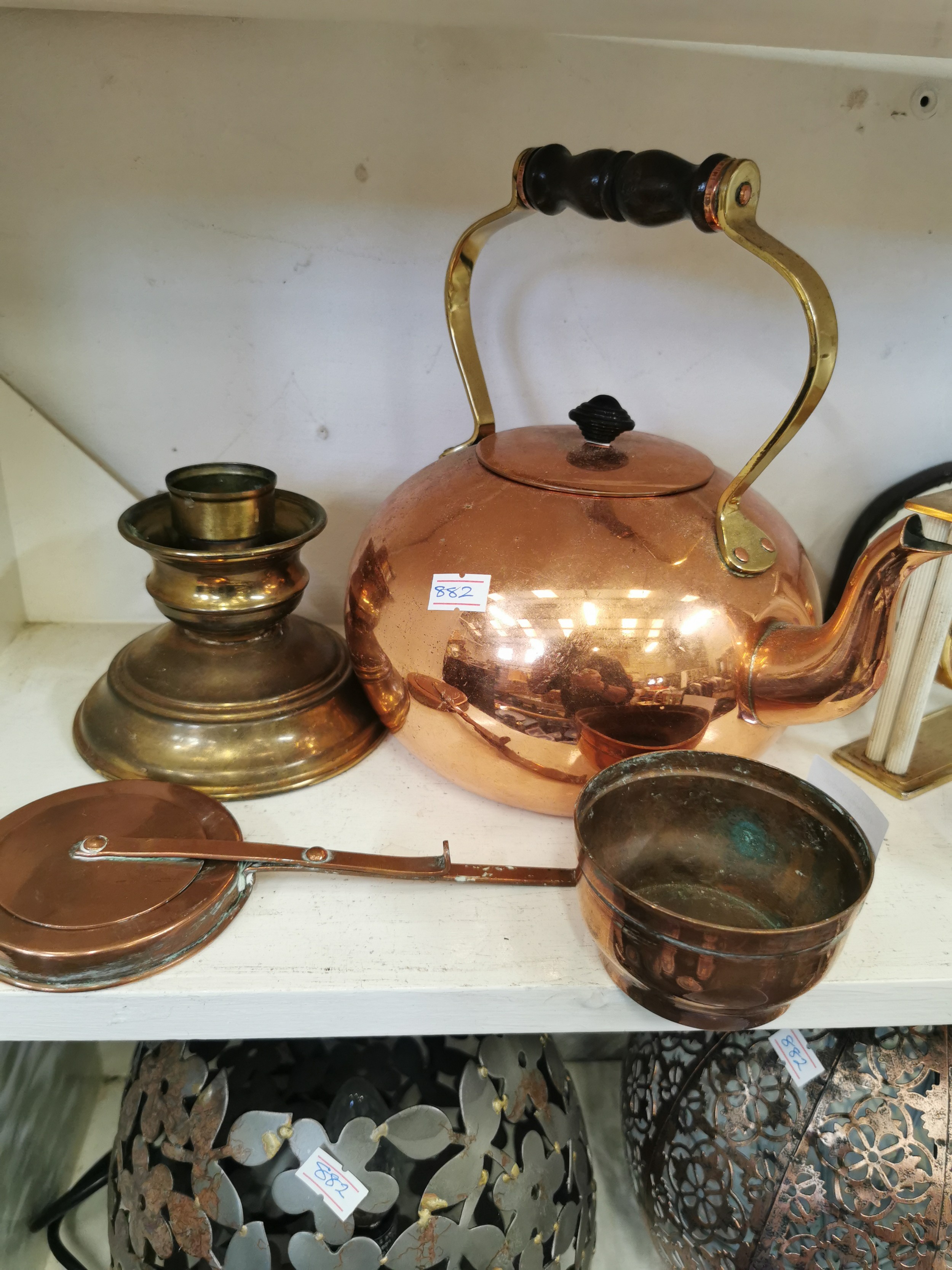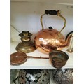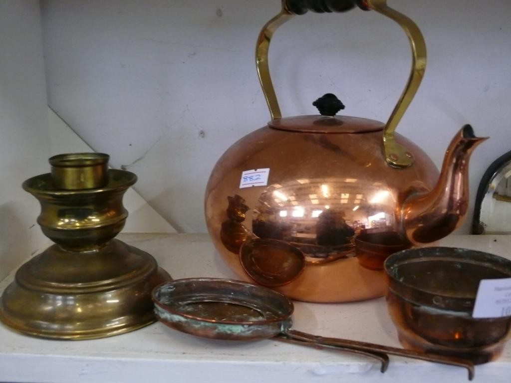 COPPER COATED KETTLE, BRASS CANDLESTICK AND 2 COPPER PIECES