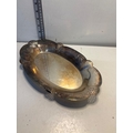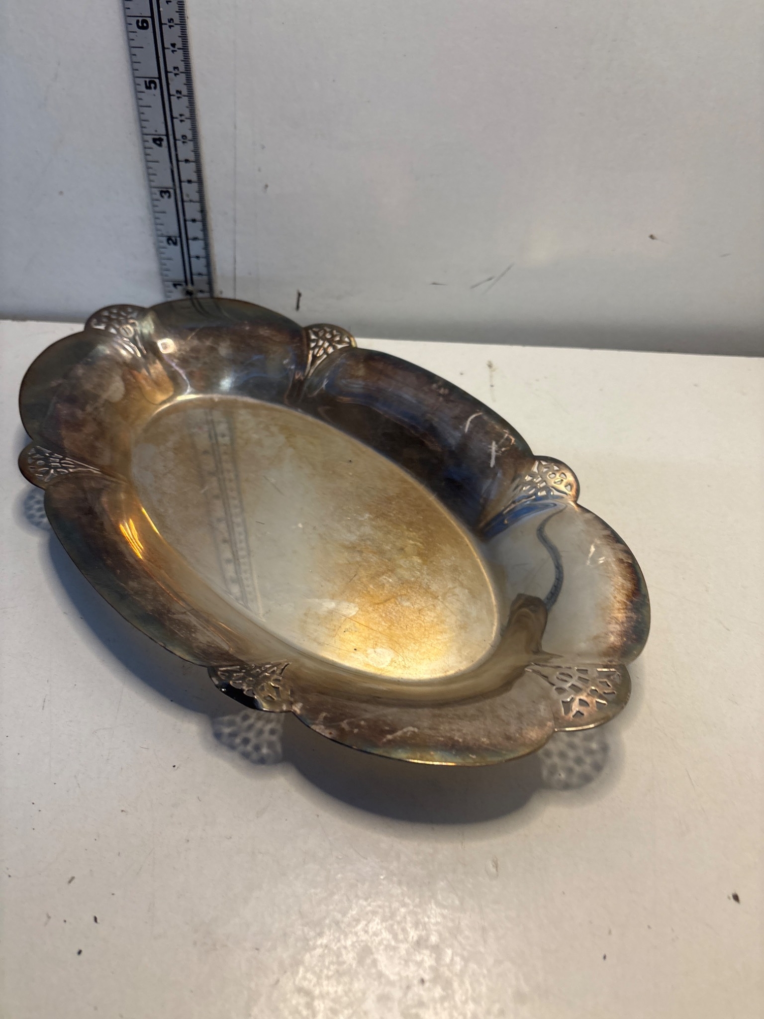 Oval silver plated bowl with scalloped edges and decorative accents.