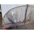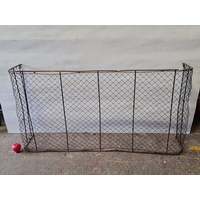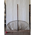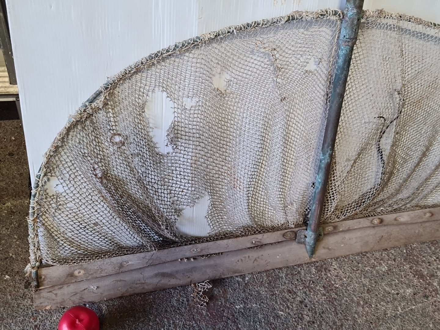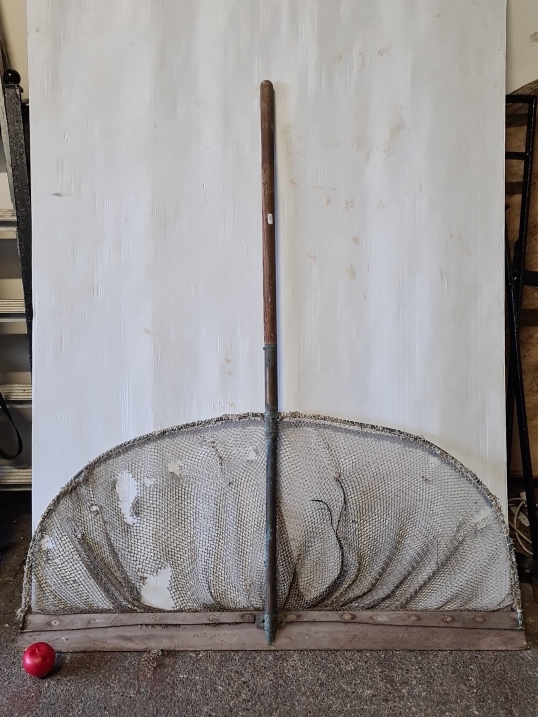 A large long-handled fishing landing net, with semicircular metal frame and mesh, fitted to a timber spreader bar with metal ferrule and riveted construction. A few holes in the net to give them a chance.