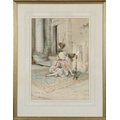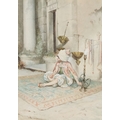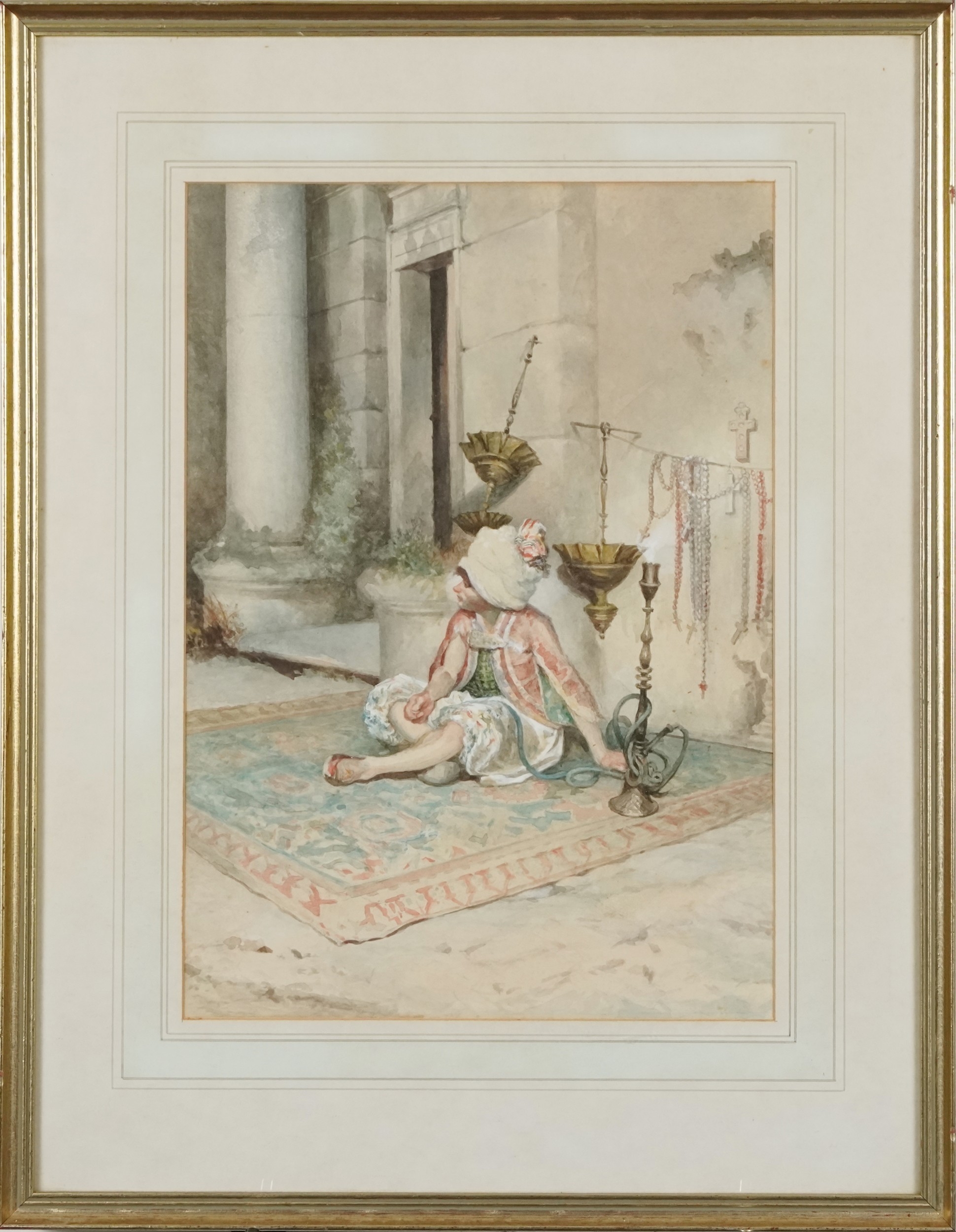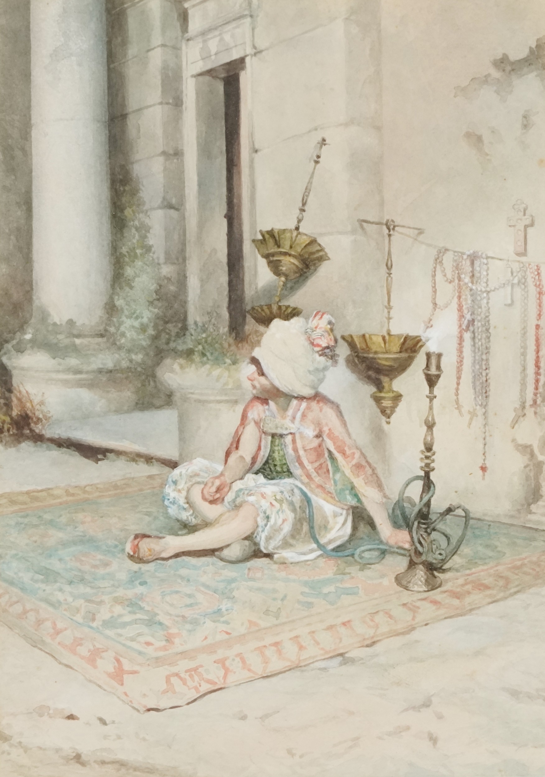 Young man seated on a rug, 20th century continental school watercolour on paper, unsigned, framed and glazed, 38cm x 26cm.