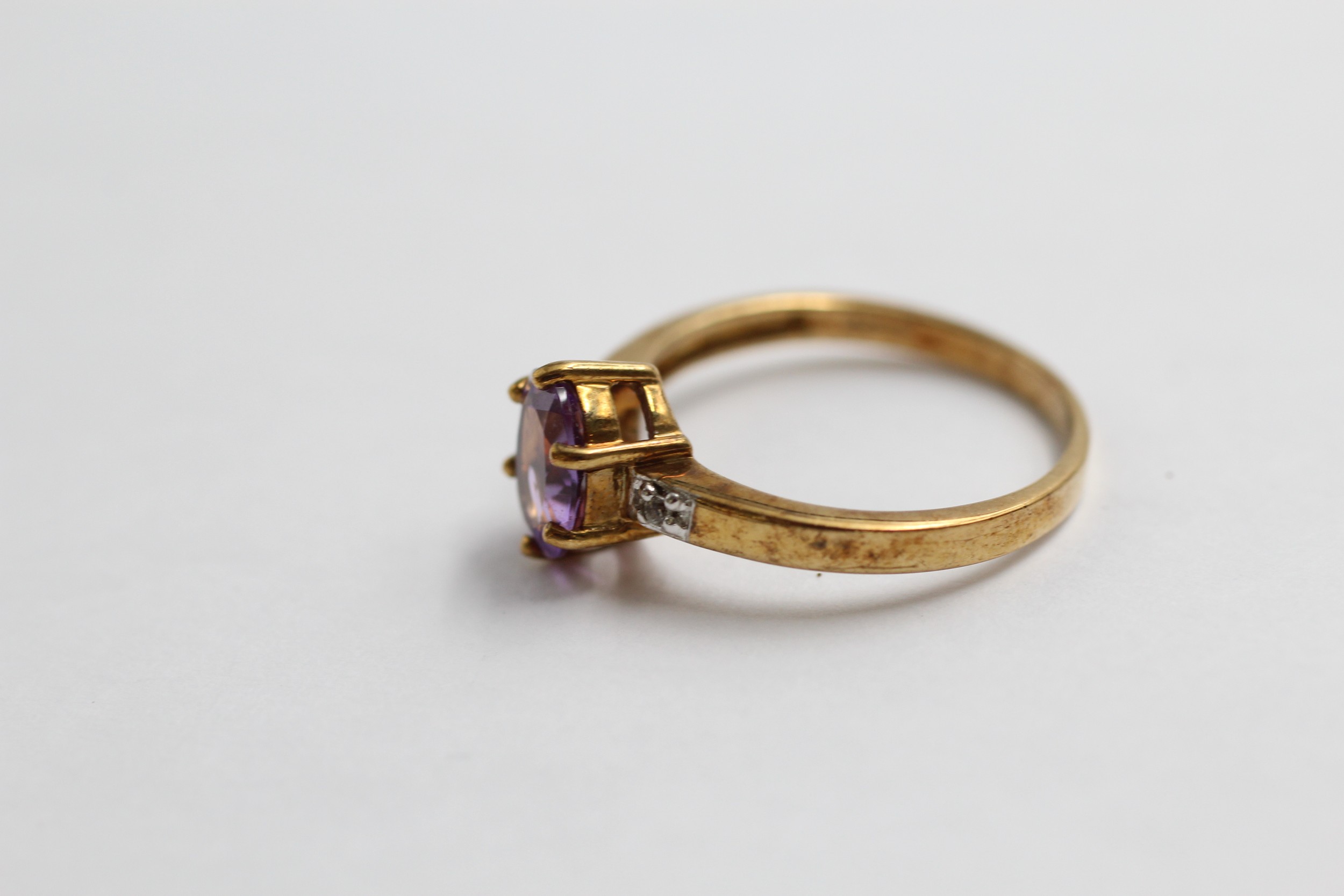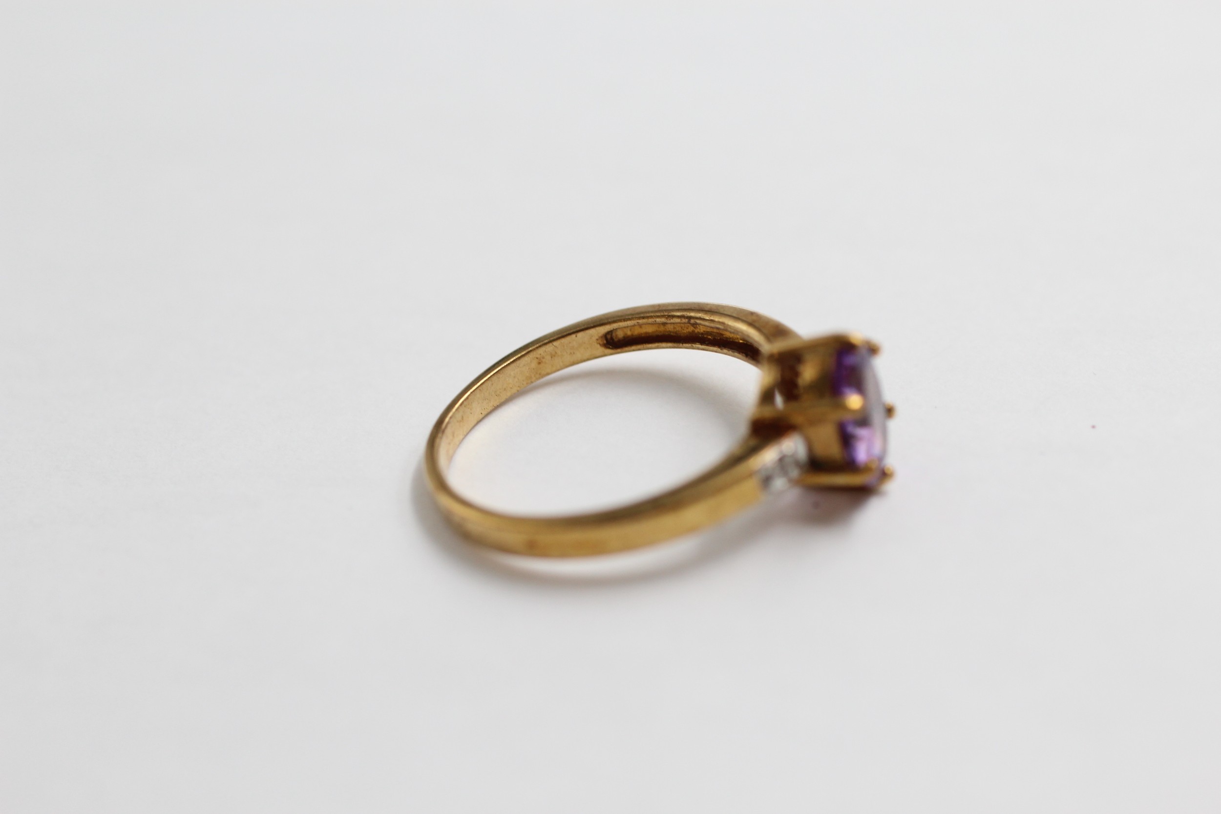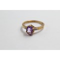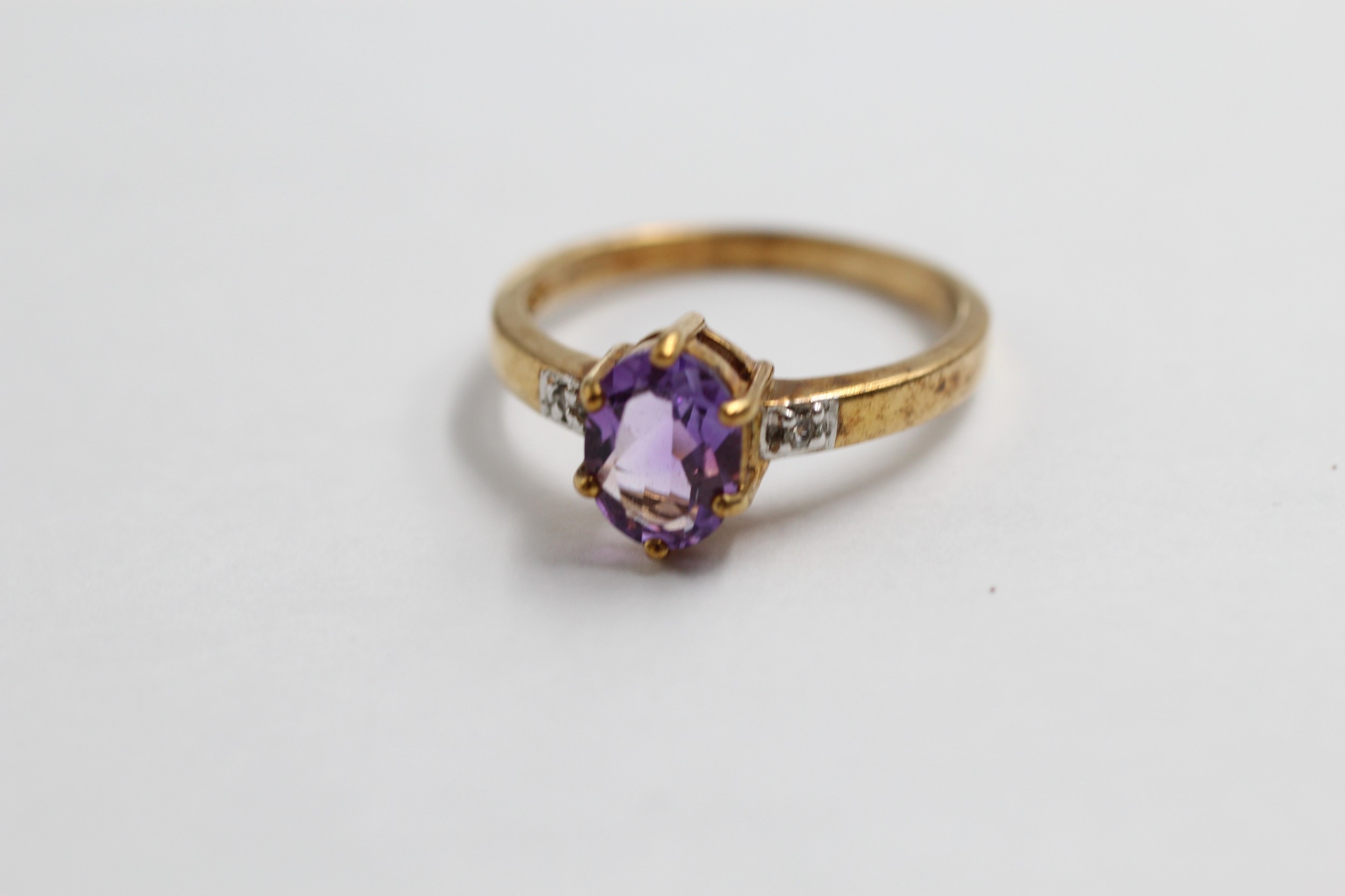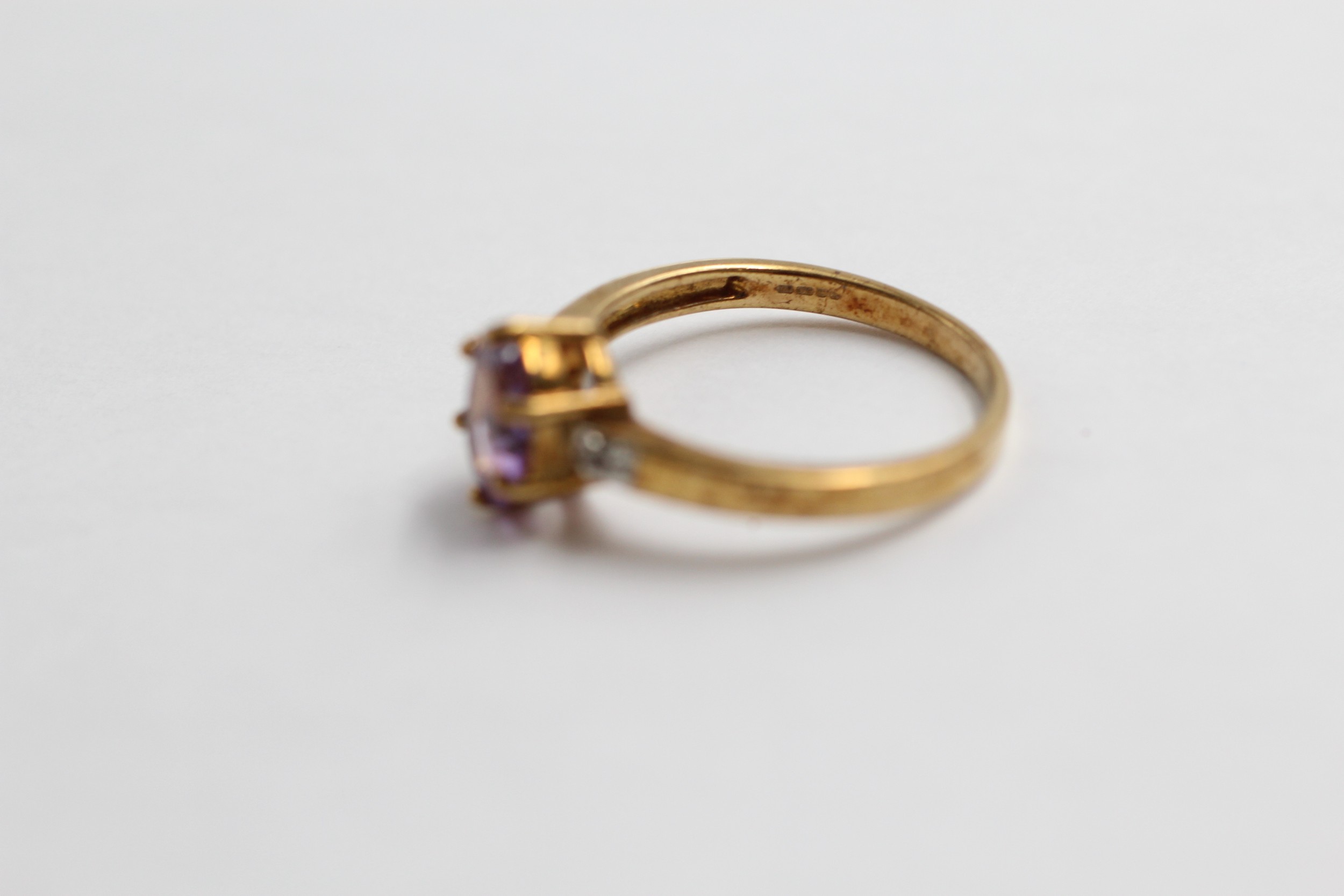 9ct Gold Amethyst Single Stone Ring With Diamond Sides (2.3g)- Size N