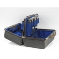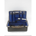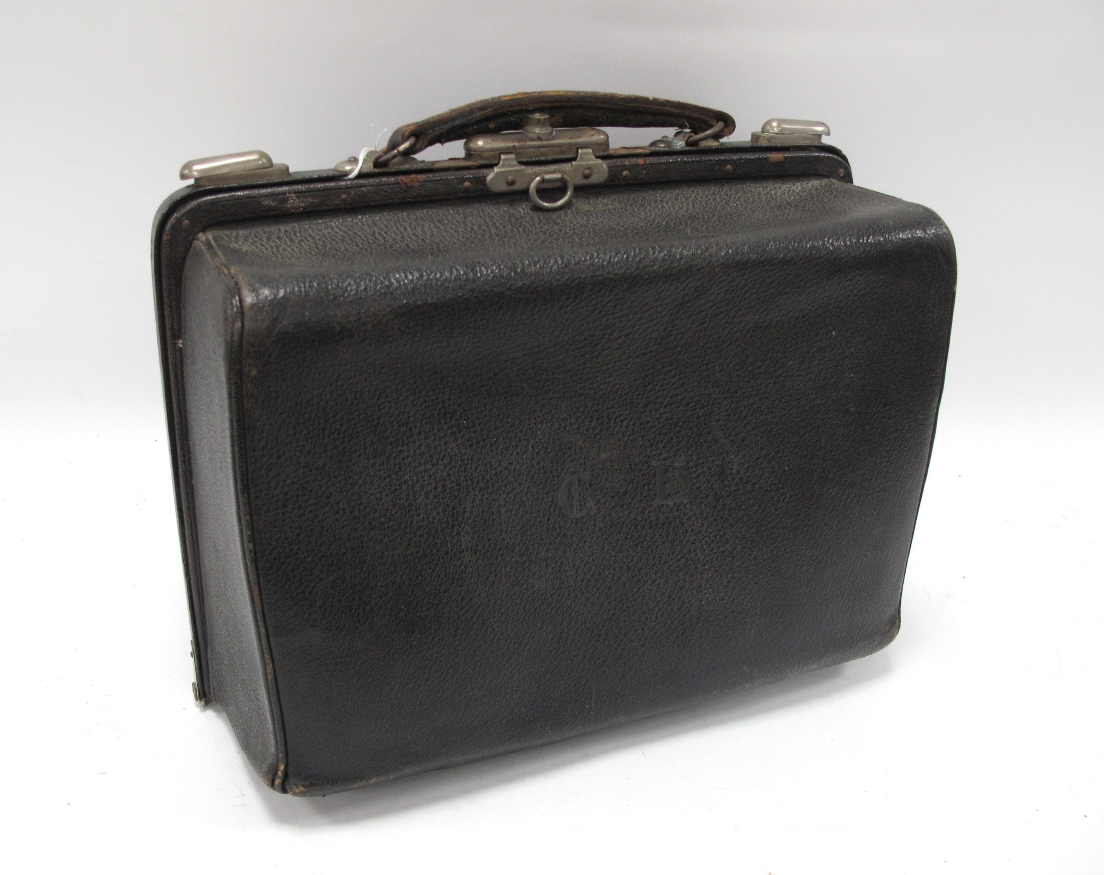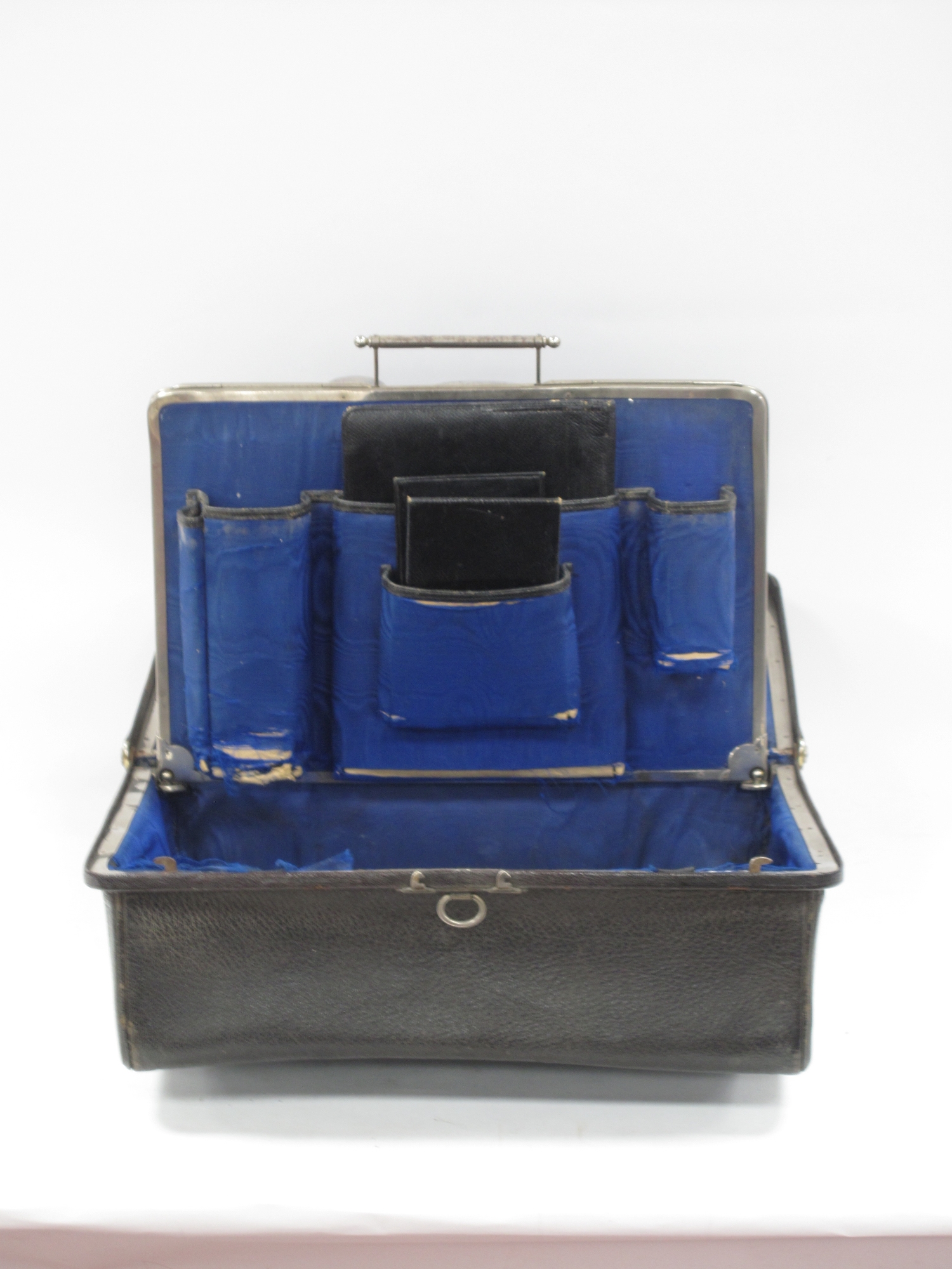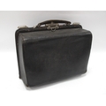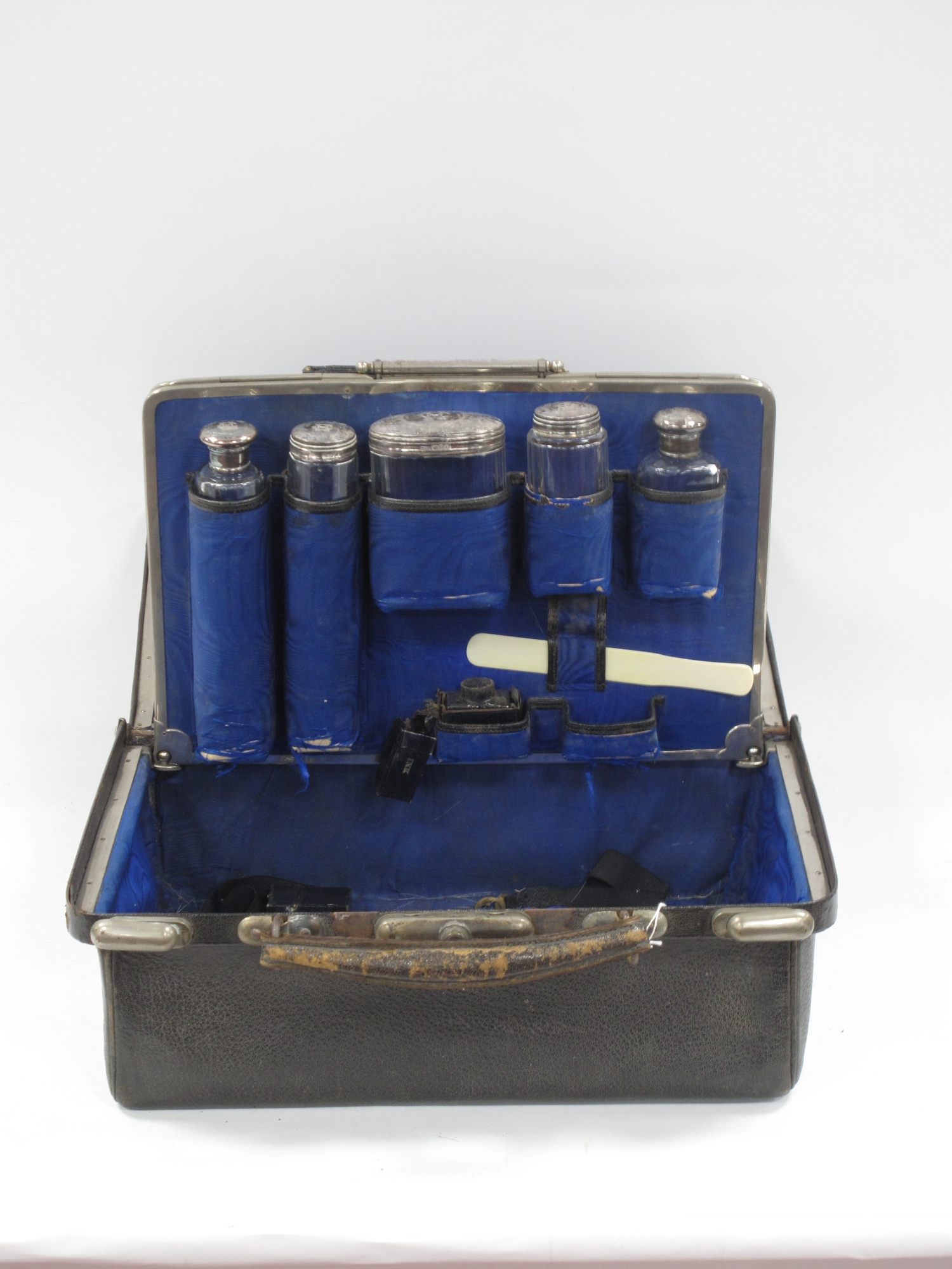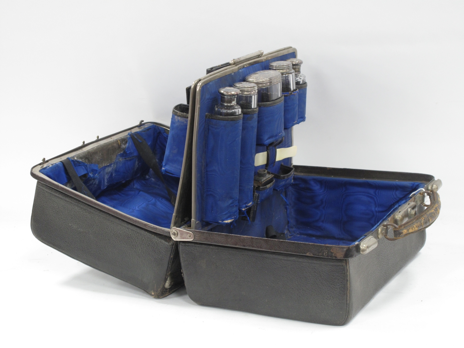 Late XIX Century Black Morocco Gladstone Bag, containing five silver topped bottles, Birmingham & London 1899, and other items, 36cm wide.
