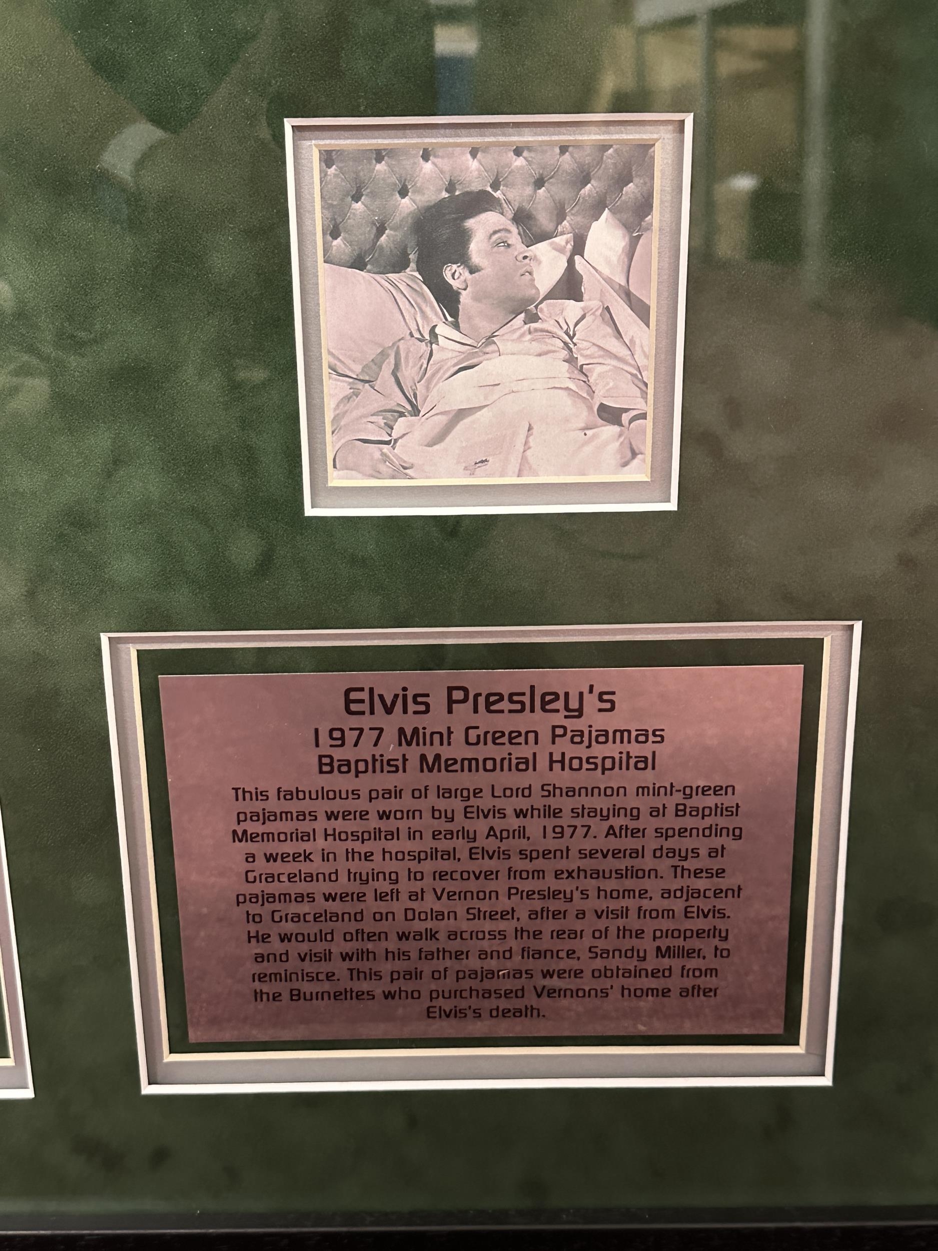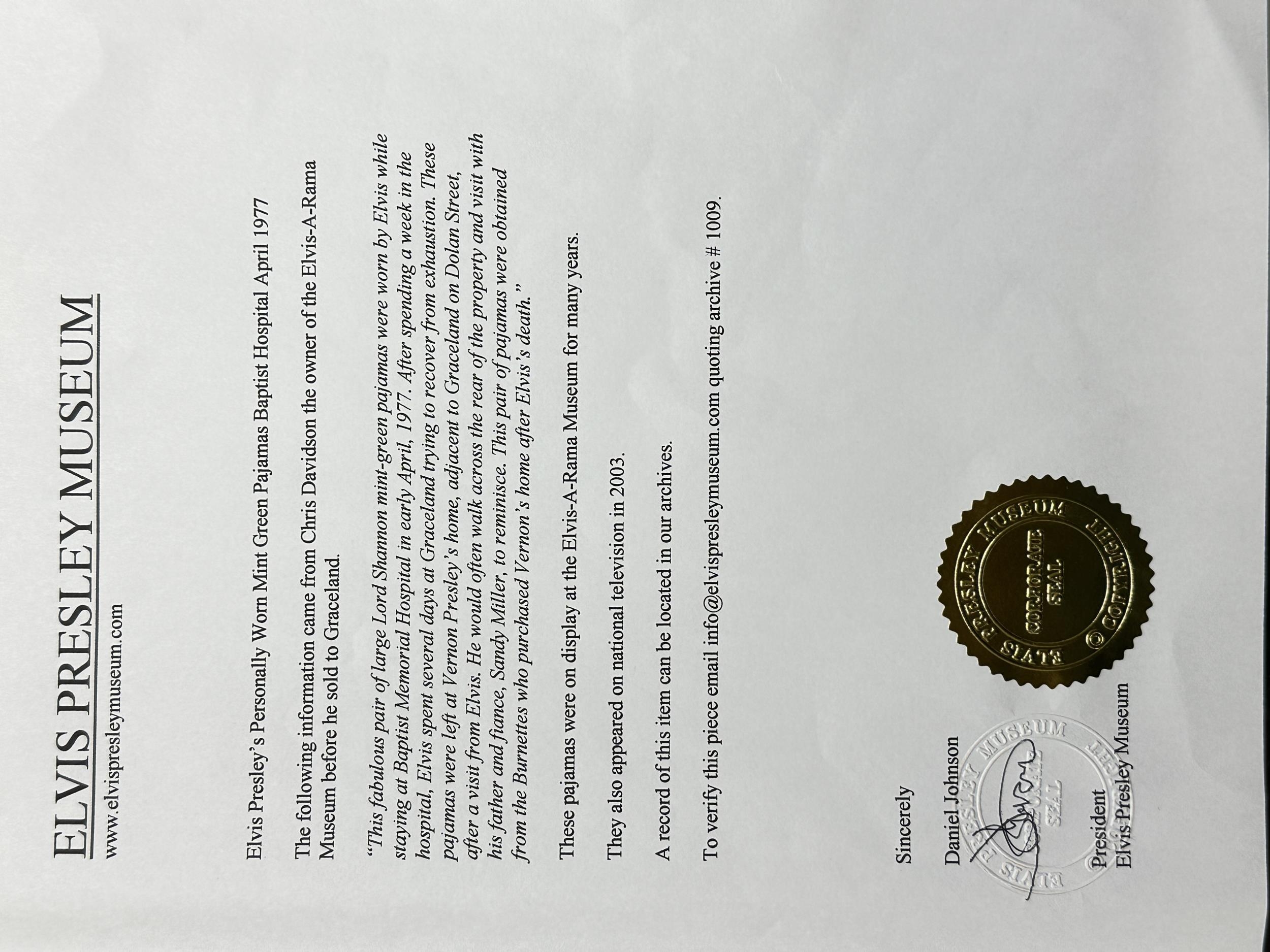 Elvis Presley: Elvis Presley's Personally Worn Mint Green Pyjamas from Baptist Hospital April 1977 less than five months before his death. Chris Davidson the owner of the ELVIS-A-RAMA MUSEUM before he sold to Graceland states in the COA:
