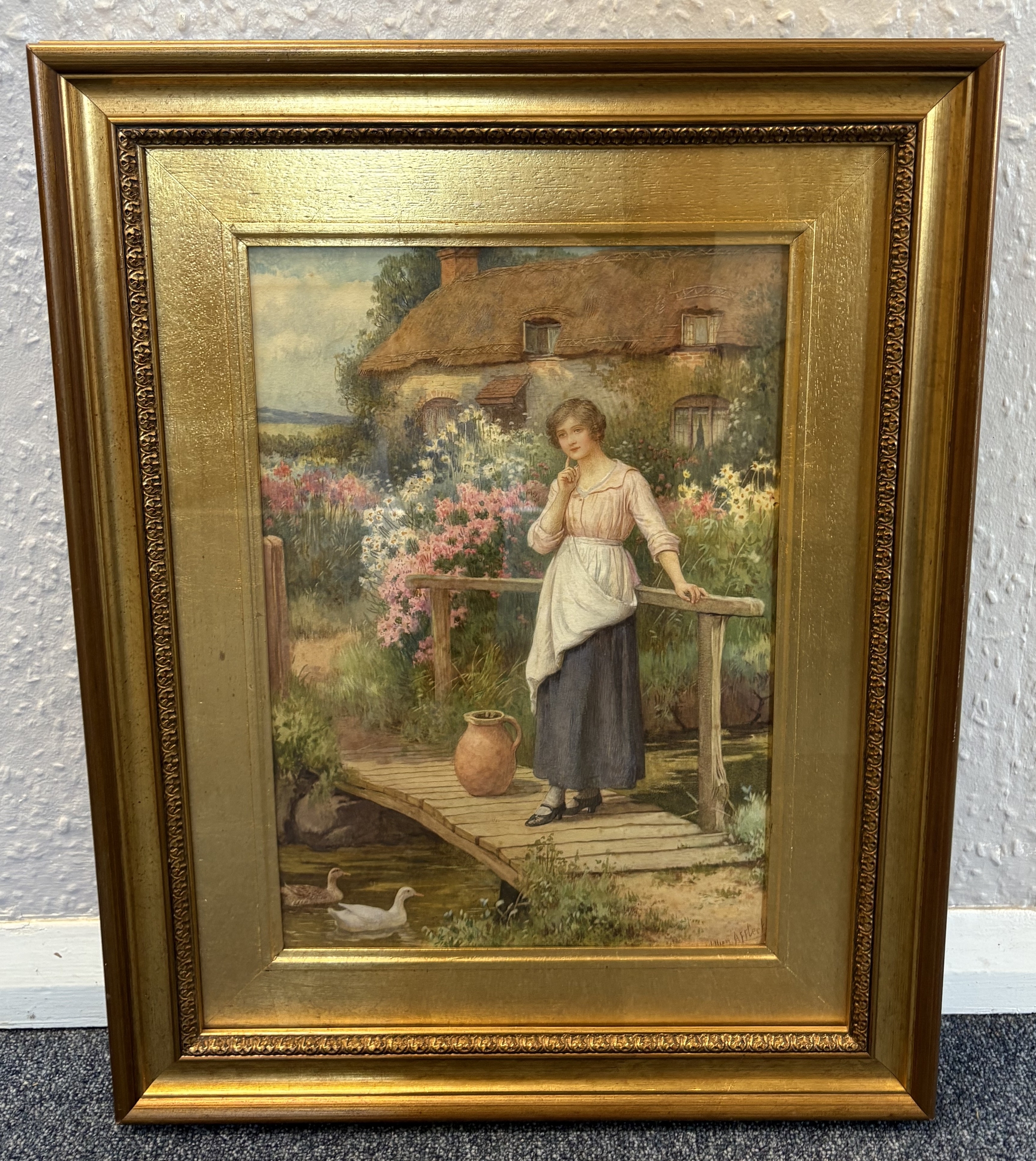 WILLIAM AFFLECK: (British, 1869 - 1943): A gilt framed and glazed watercolour depicting a lady standing on a bridge before a thatched cottage. Signed to bottom right. Approx. 26 cm x 38 cm (ss). Est. £200 - £300.