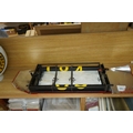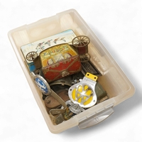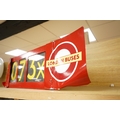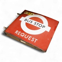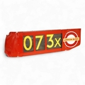 A London Transport bus destination blind box, complete with mechanism and three numerical destination blinds, with later applied sheets of red painted steel bolted to each side, mechanism with winding handle and row selector to the reverse, 65cm wide (not including side pieces), 30.5cm high