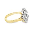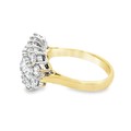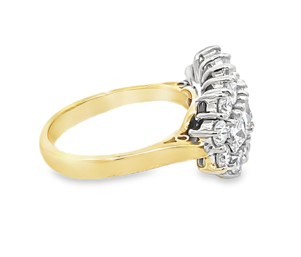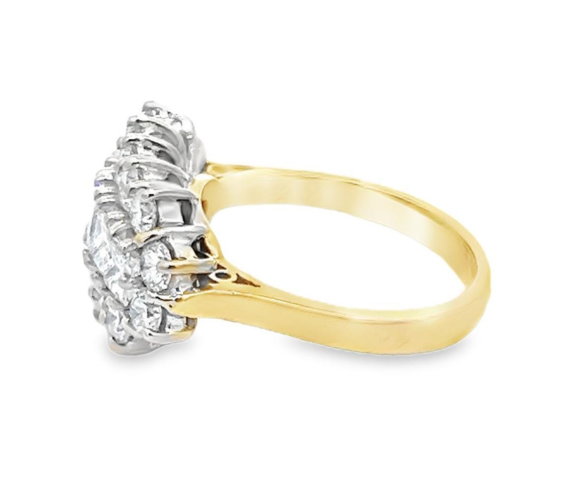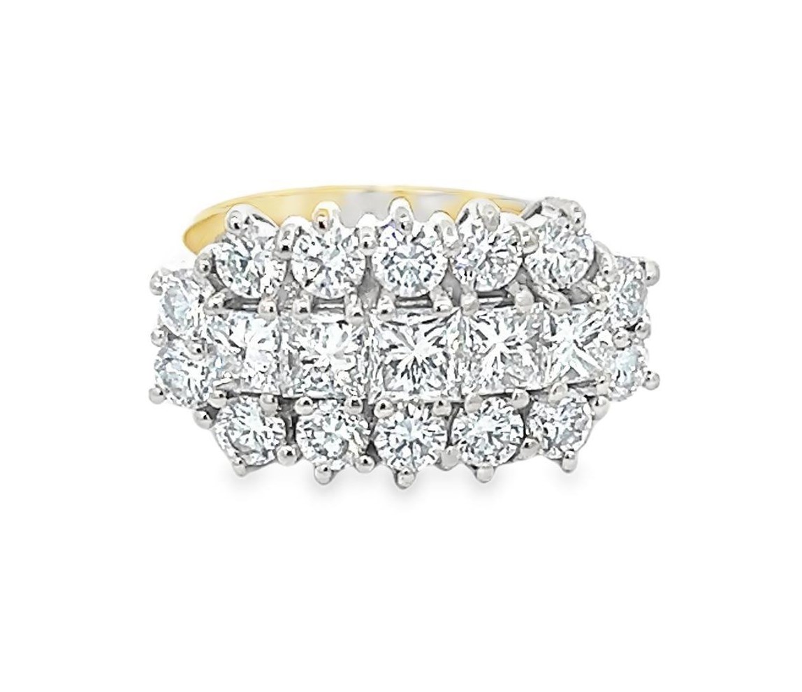 Diamond 18ct yellow and white gold cluster ring, size M. Five graduated princess cut diamonds surrounded by fourteen round brilliant cut diamonds. Total diamond weight 2.55ct. Colour G, Clarity VS1/2. 8.0g