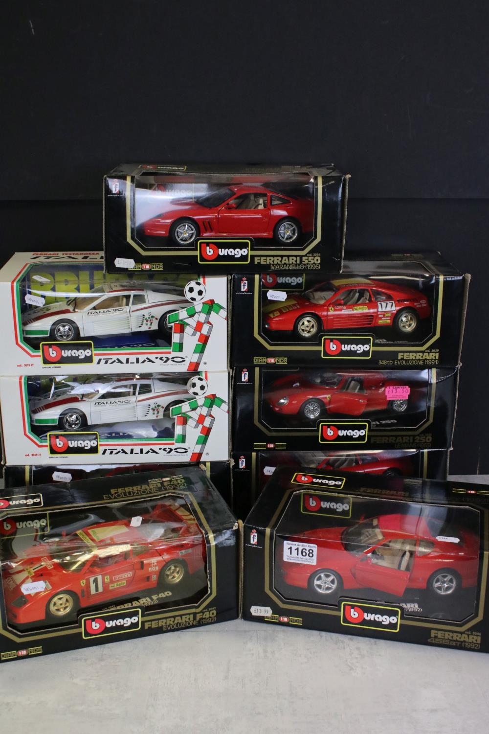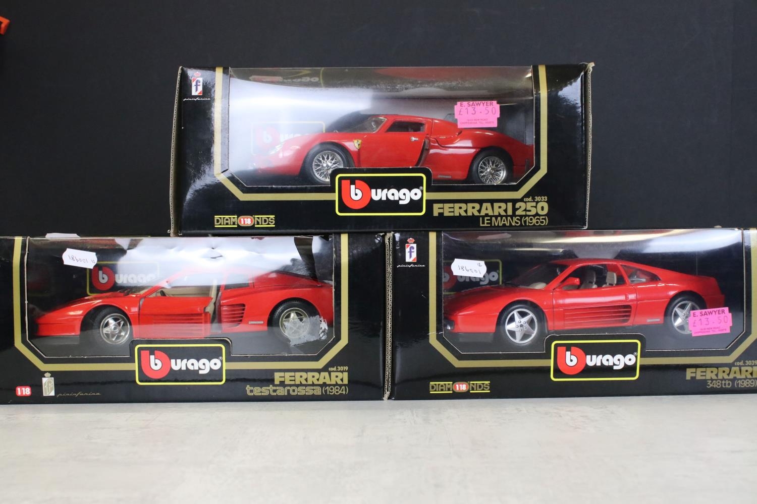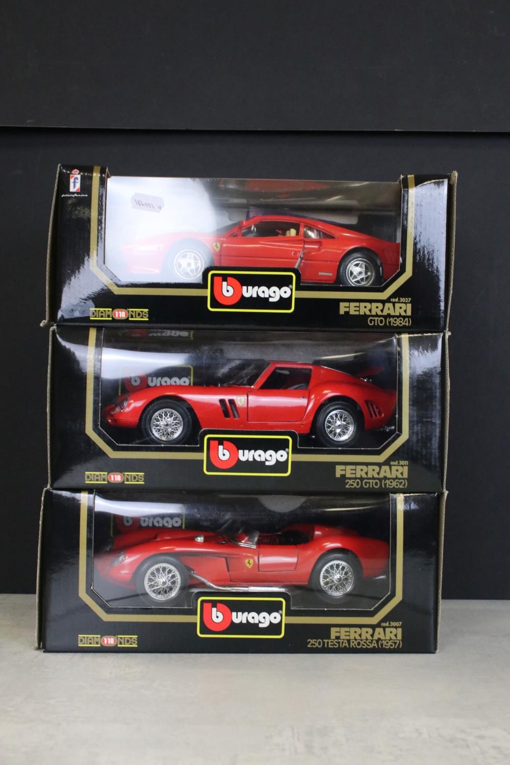 12 boxed Burago 1/18 diecast Ferrari models, to include Diamonds 3007 250 Testa Rossa (1957), 3011 250 GTO (1962), 3027 GTO (1984), 3029 348tb Evoluzione (1991), 3033 250 Le Mans (1965), 3039 348tb (1989), 3042 F40 Evoluzione (1992), 3046 456GT (1992) & 3064 550 Maranello (1996), together with 3019 Testarossa (1984) & 2 x 3019 IT Italia '90 Testarossa (1984), diecast gen ex, boxes with some wear