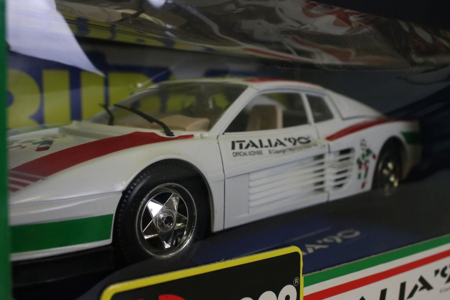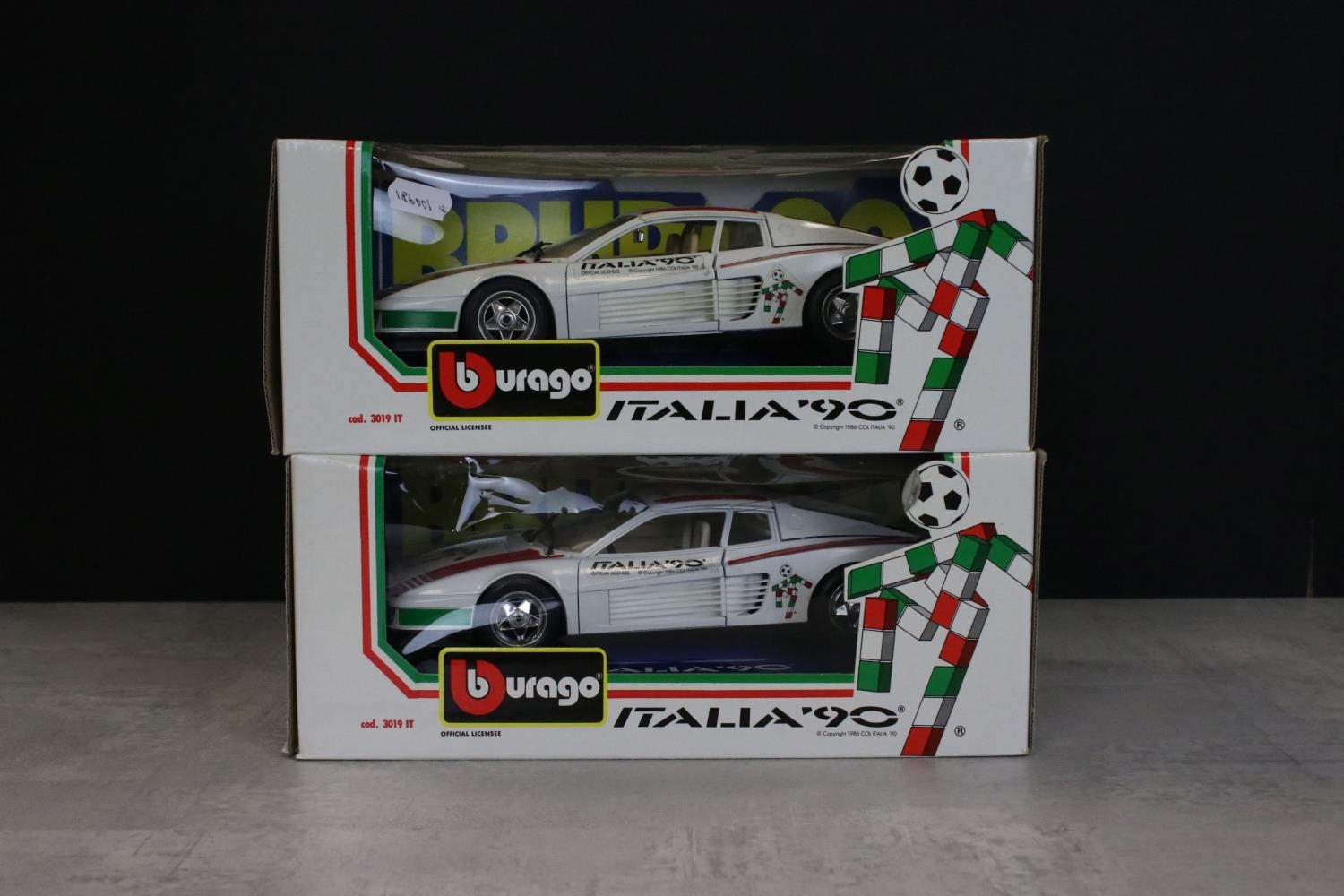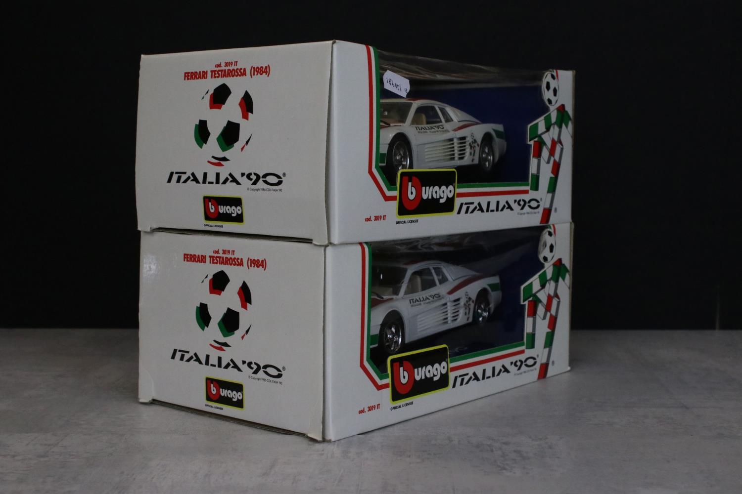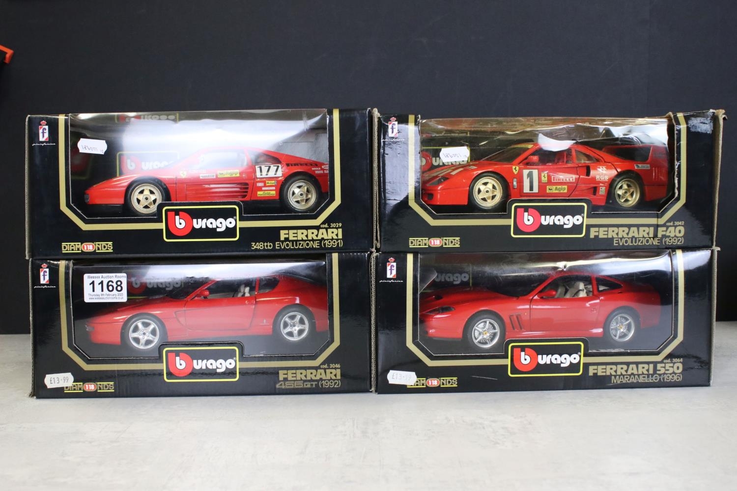 12 boxed Burago 1/18 diecast Ferrari models, to include Diamonds 3007 250 Testa Rossa (1957), 3011 250 GTO (1962), 3027 GTO (1984), 3029 348tb Evoluzione (1991), 3033 250 Le Mans (1965), 3039 348tb (1989), 3042 F40 Evoluzione (1992), 3046 456GT (1992) & 3064 550 Maranello (1996), together with 3019 Testarossa (1984) & 2 x 3019 IT Italia '90 Testarossa (1984), diecast gen ex, boxes with some wear